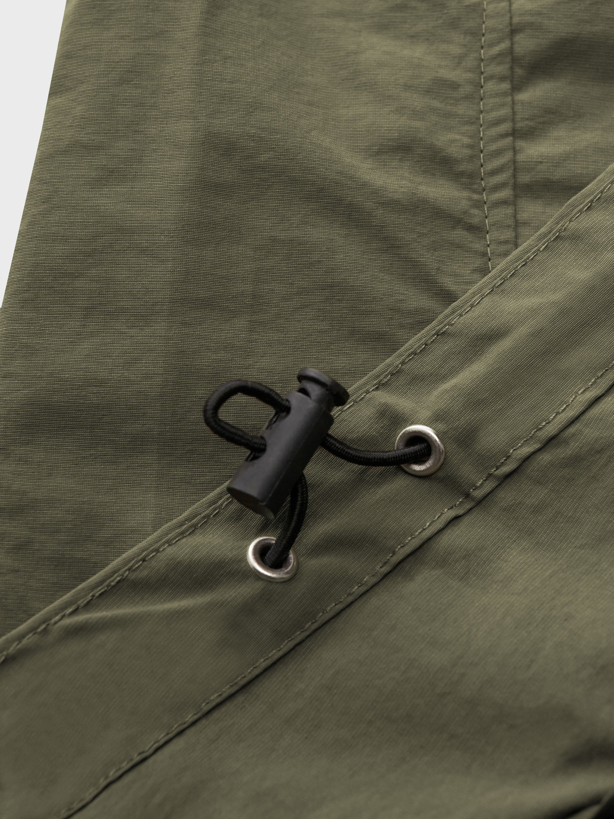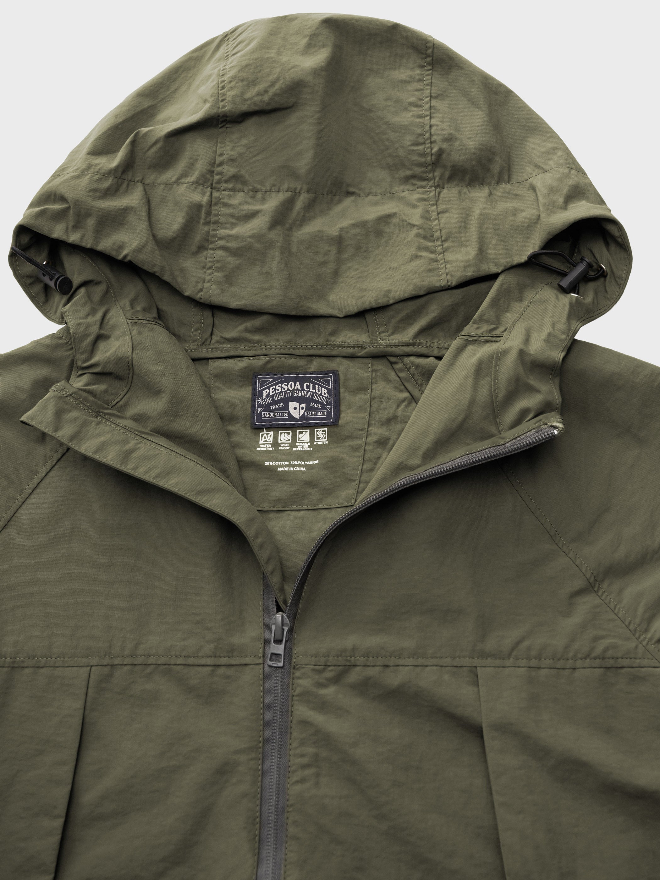 防水のフード付きジャケットで、服の色合いはトレンド感が取り入れられているものになっています。