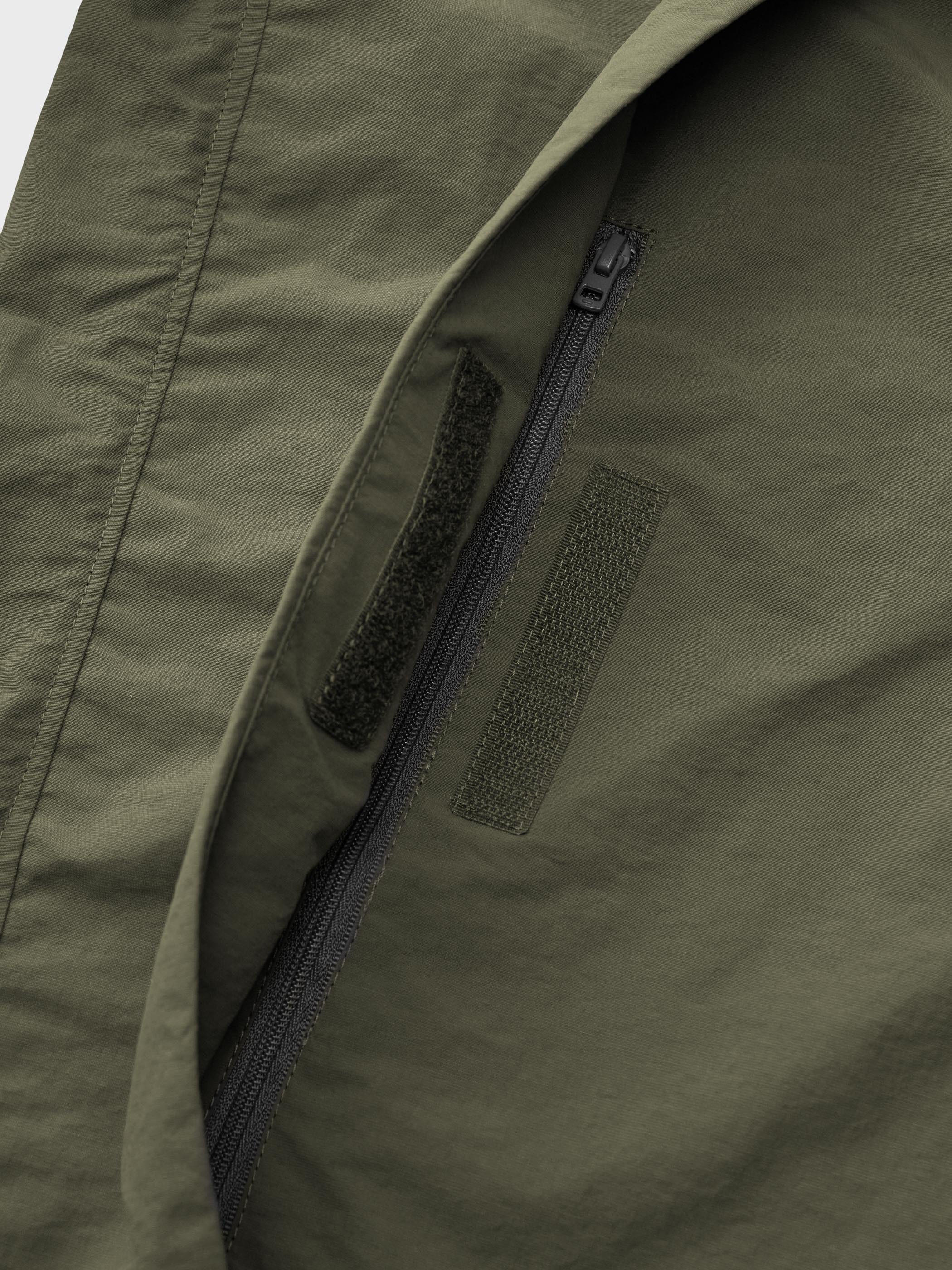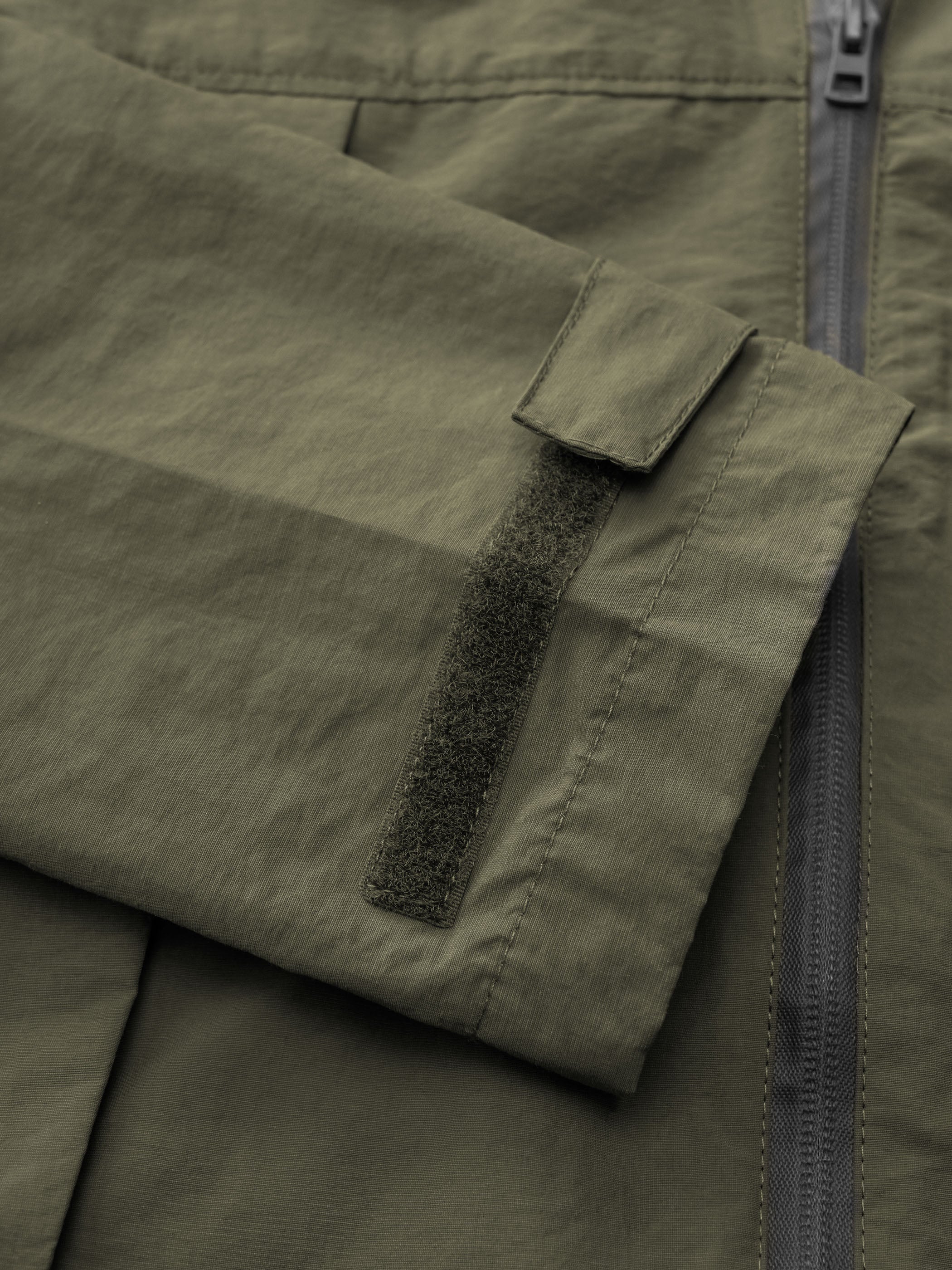 防水防風防油の三防生地で作られた大型ポケットは、縫製や縁取りなど細部にわたる品質にこだわっています。