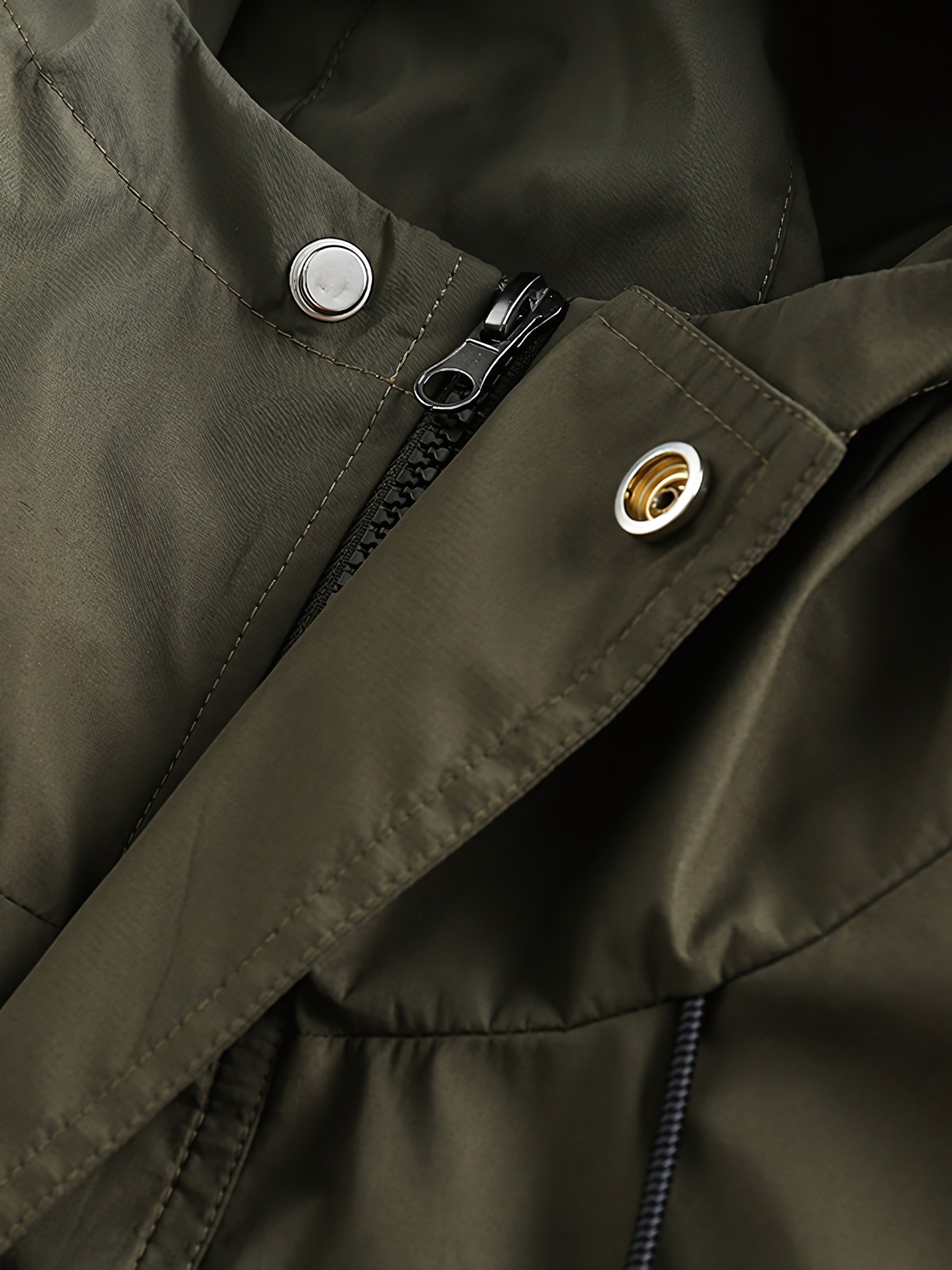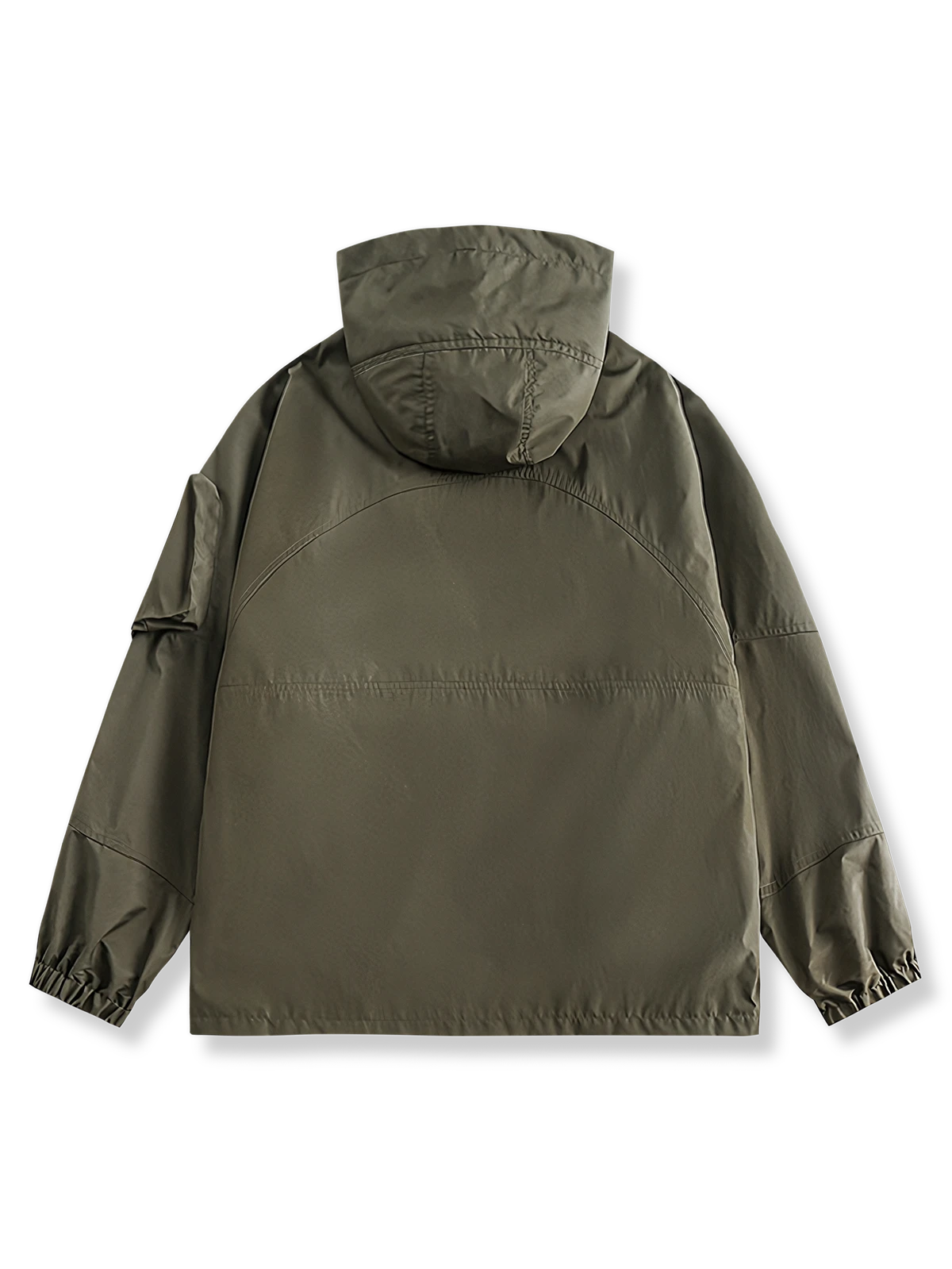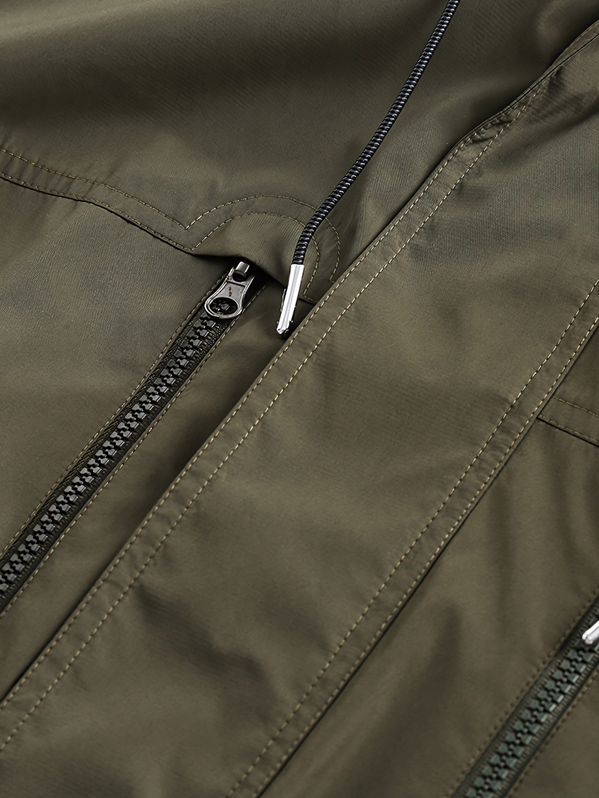 フードつきのジャケットのディテールには、フード上部のドローコードデザインが含まれており、フードの締め付け具合を調整できます。さらに、前胸のジッパーポケットは便利な収納スペースを提供し、小物を安全に収納できます。袖口にはゴムバンドがあり、風の侵入を効果的に防ぎます。