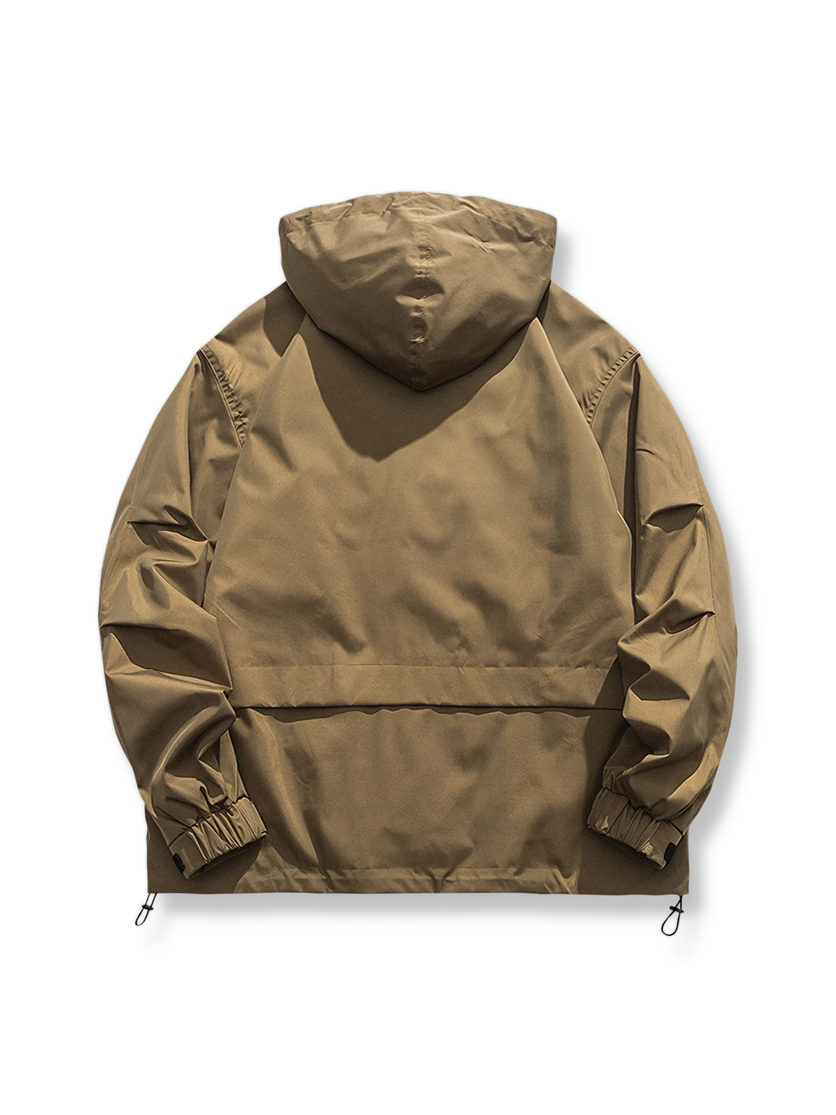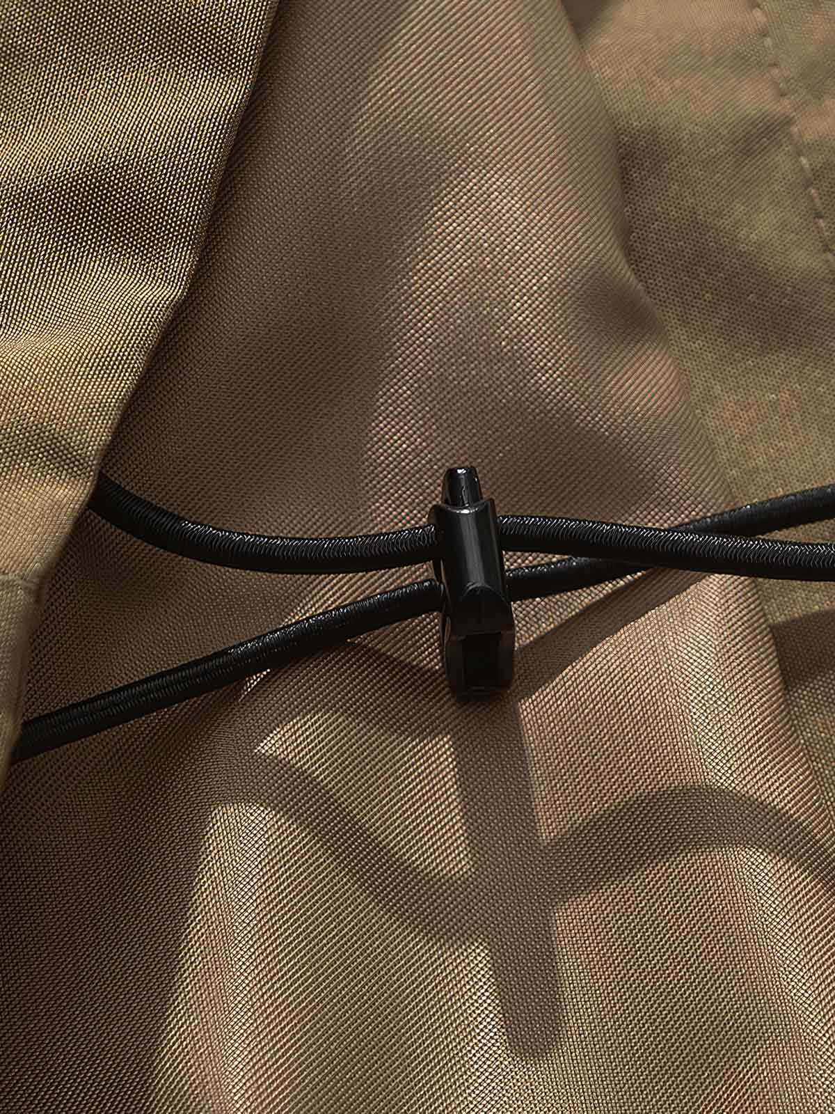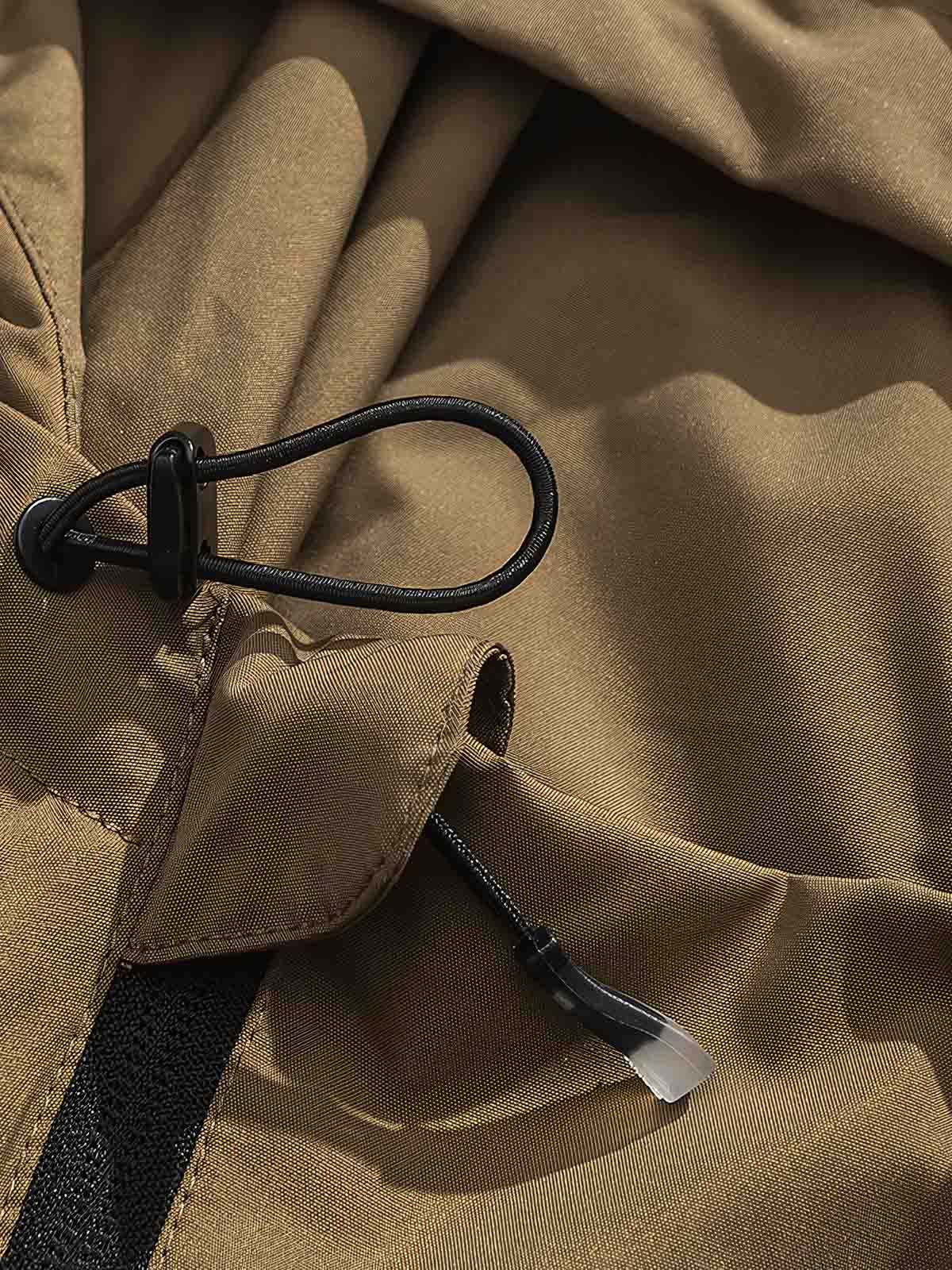 防風防水のポリエステル素材で作られたジャケットは、悪天候から身を守ります。調節可能な袖口と裾のドローストリングは、追加の風雨から保護し、保温性を高めます。