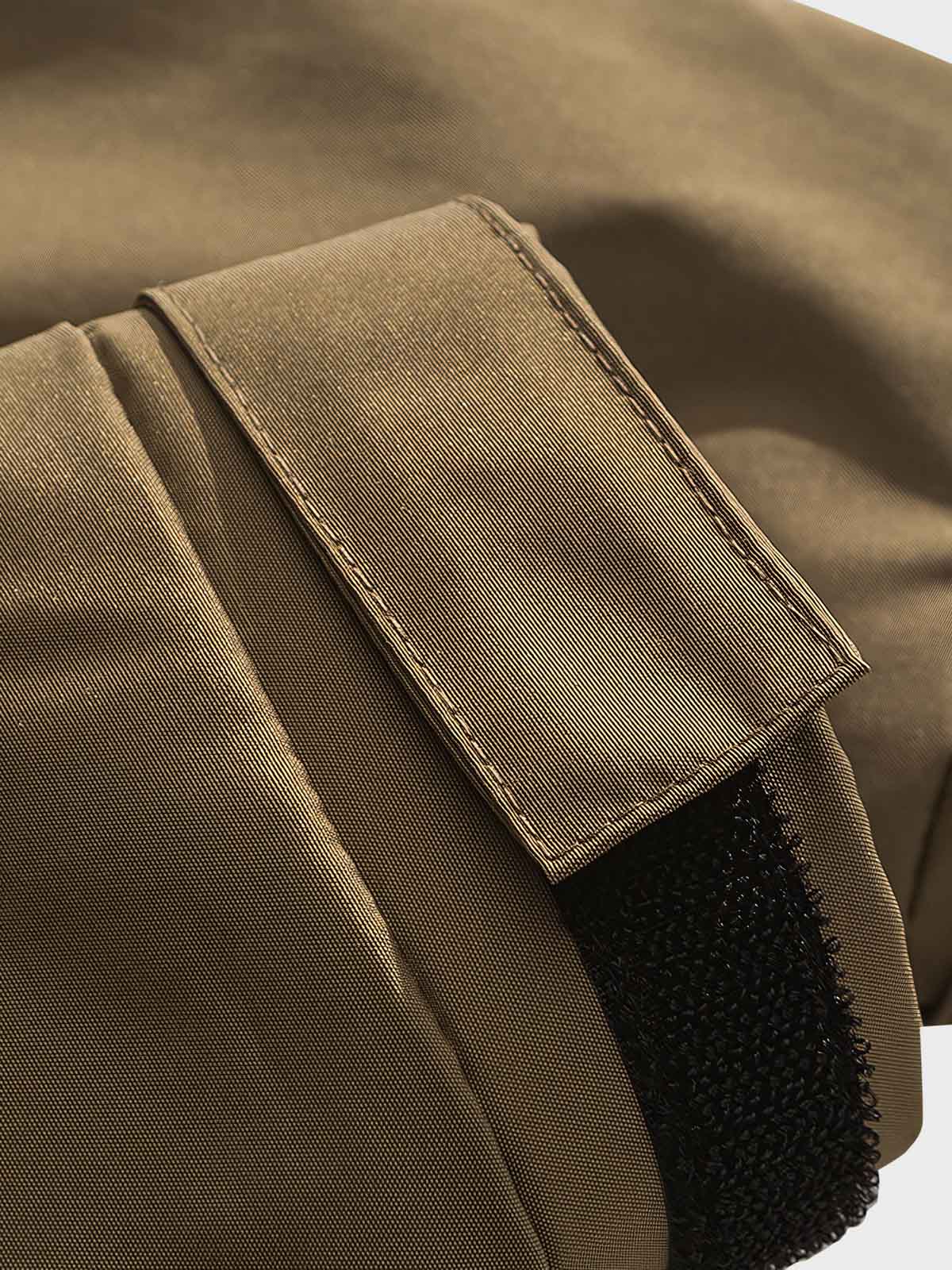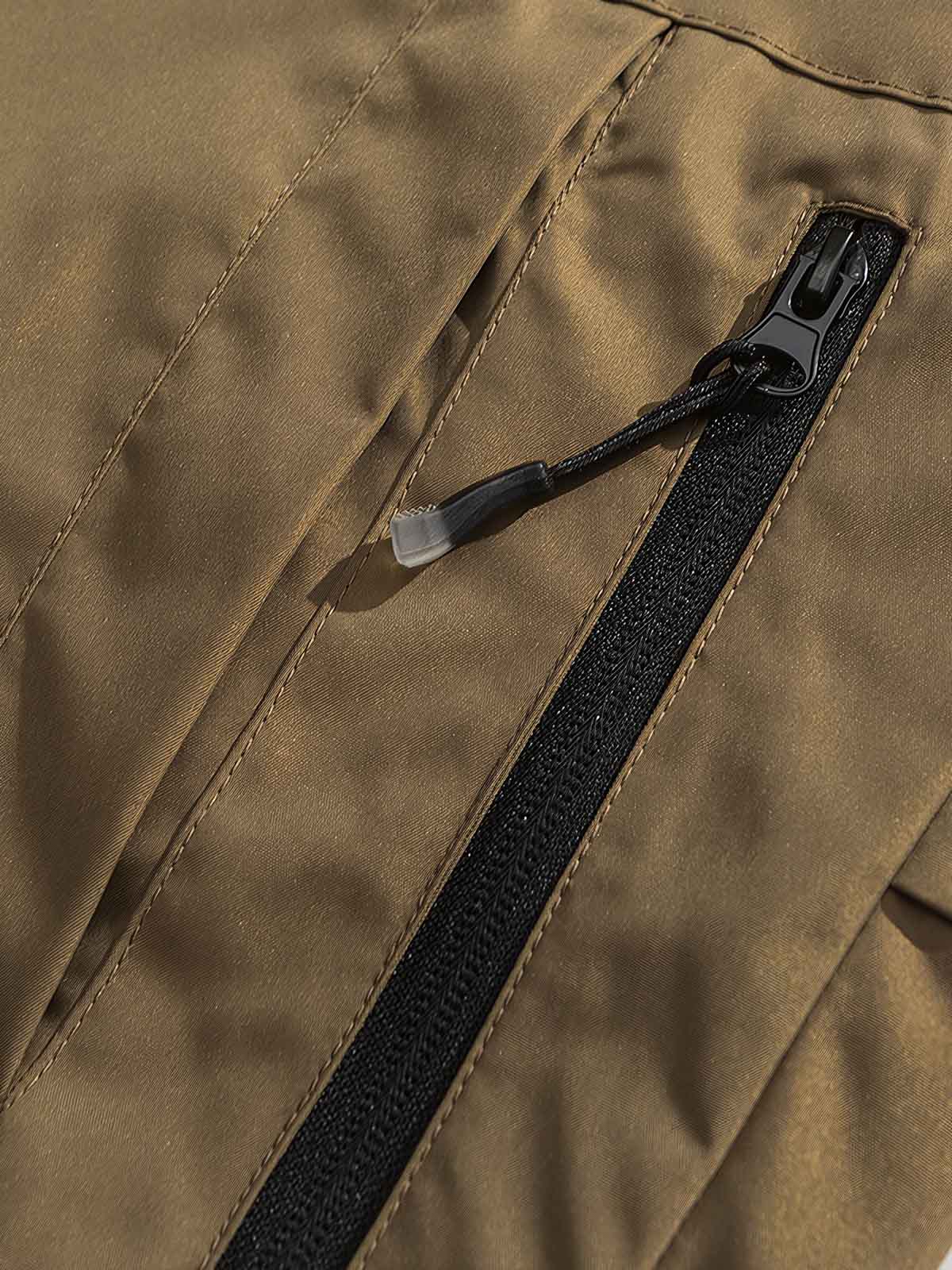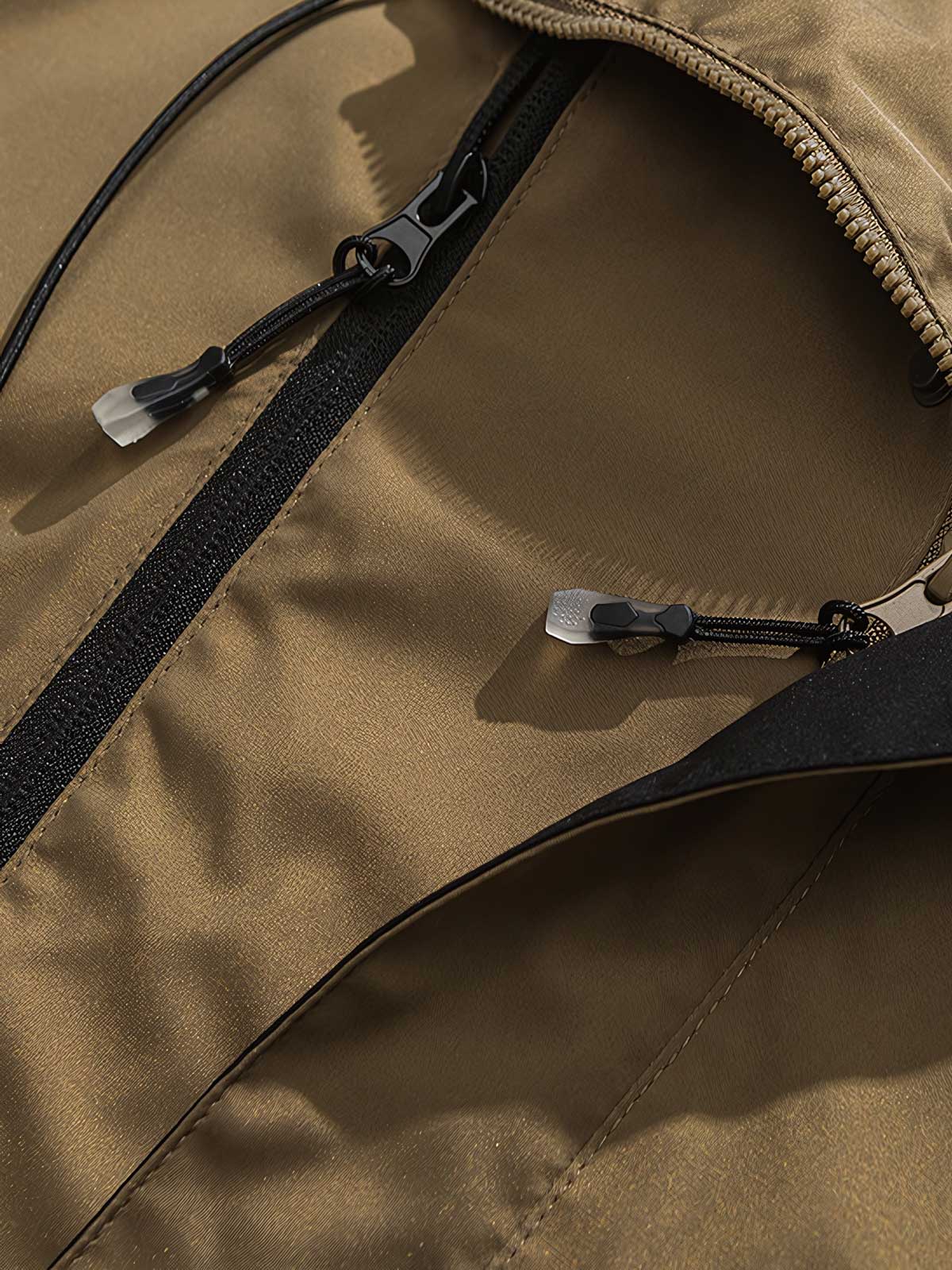 防風防水のポリエステル素材で作られたジャケットは、悪天候から身を守ります。調節可能な袖口と裾のドローストリングは、追加の風雨から保護し、保温性を高めます。
