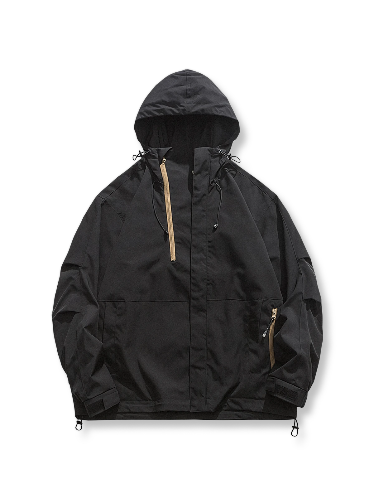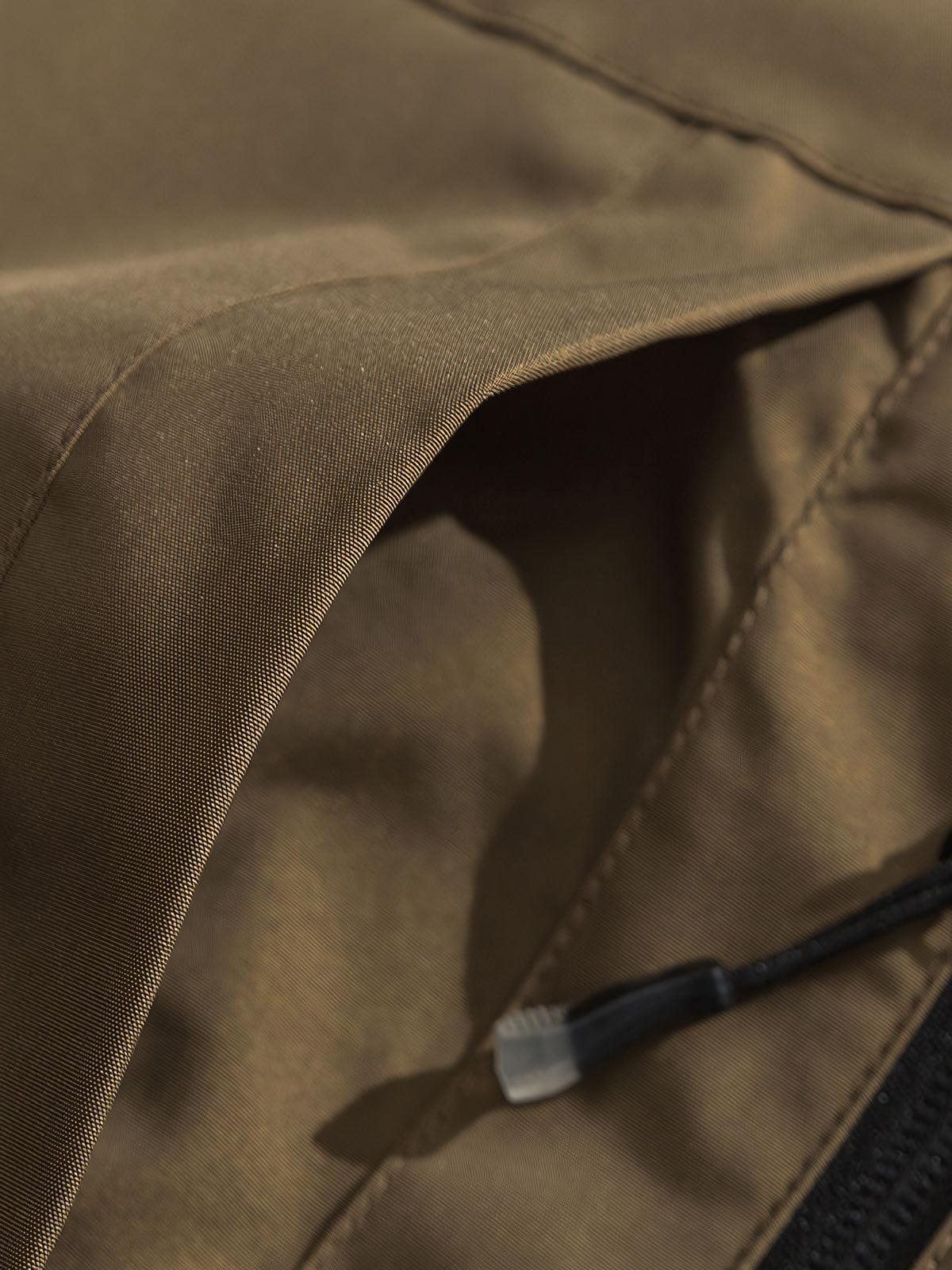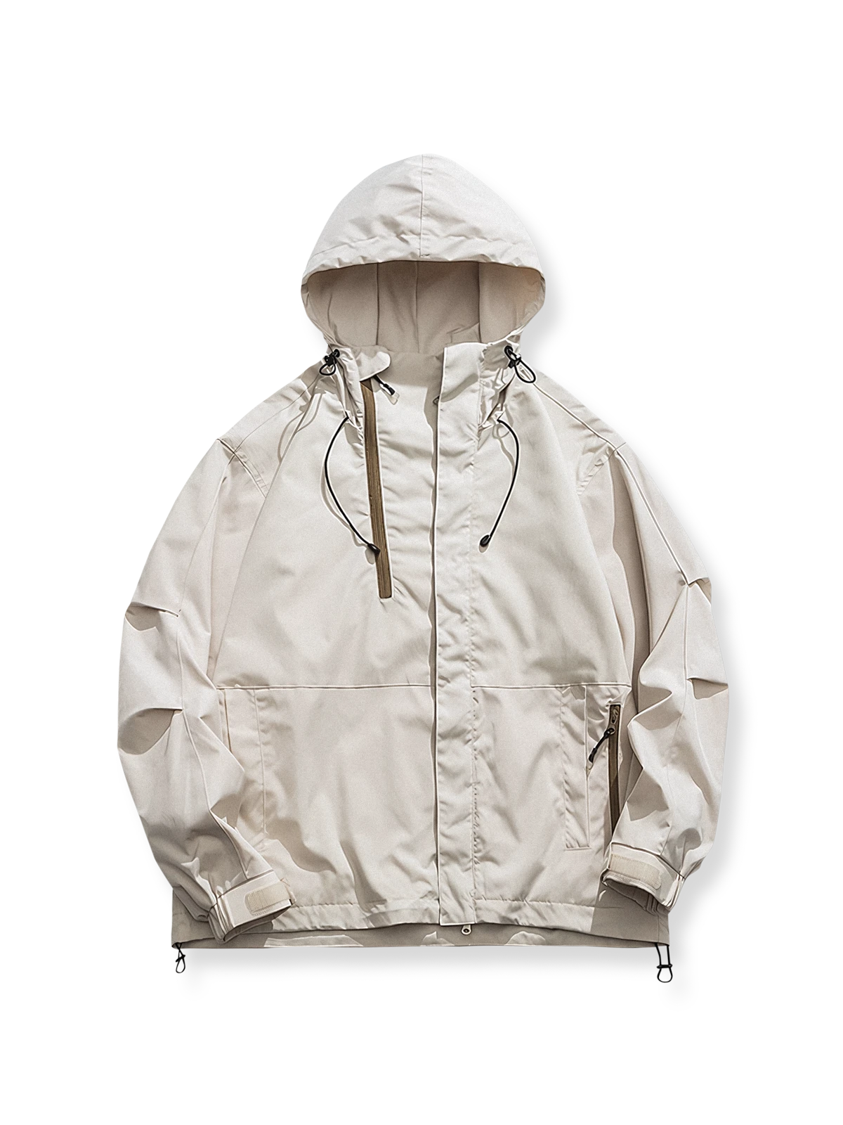 ジャケットは、十分な動きの自由を提供するために中程度のゆとりを持たせたカットです。フードのデザインは、変わりやすい都市の気候に対応するために頭部の保護を強化しています。