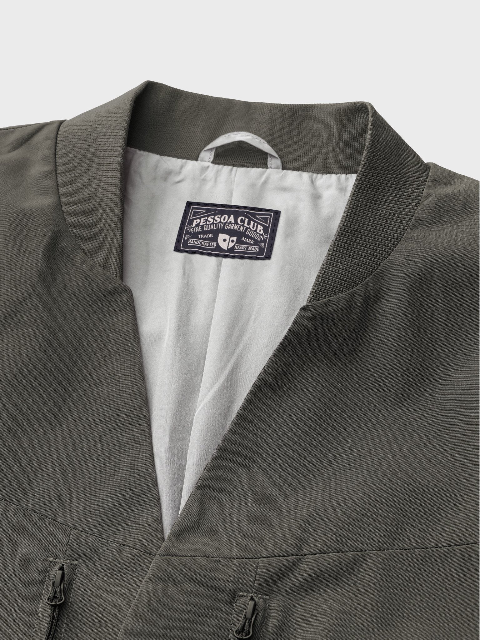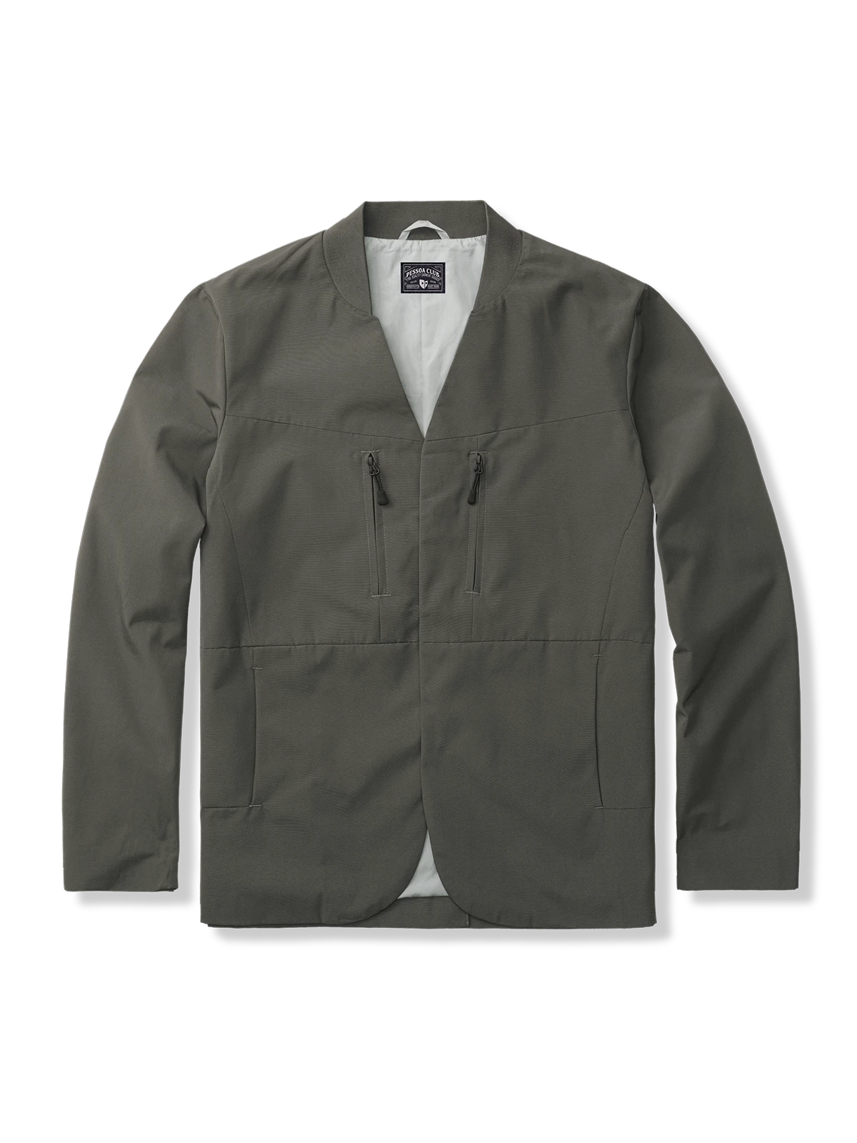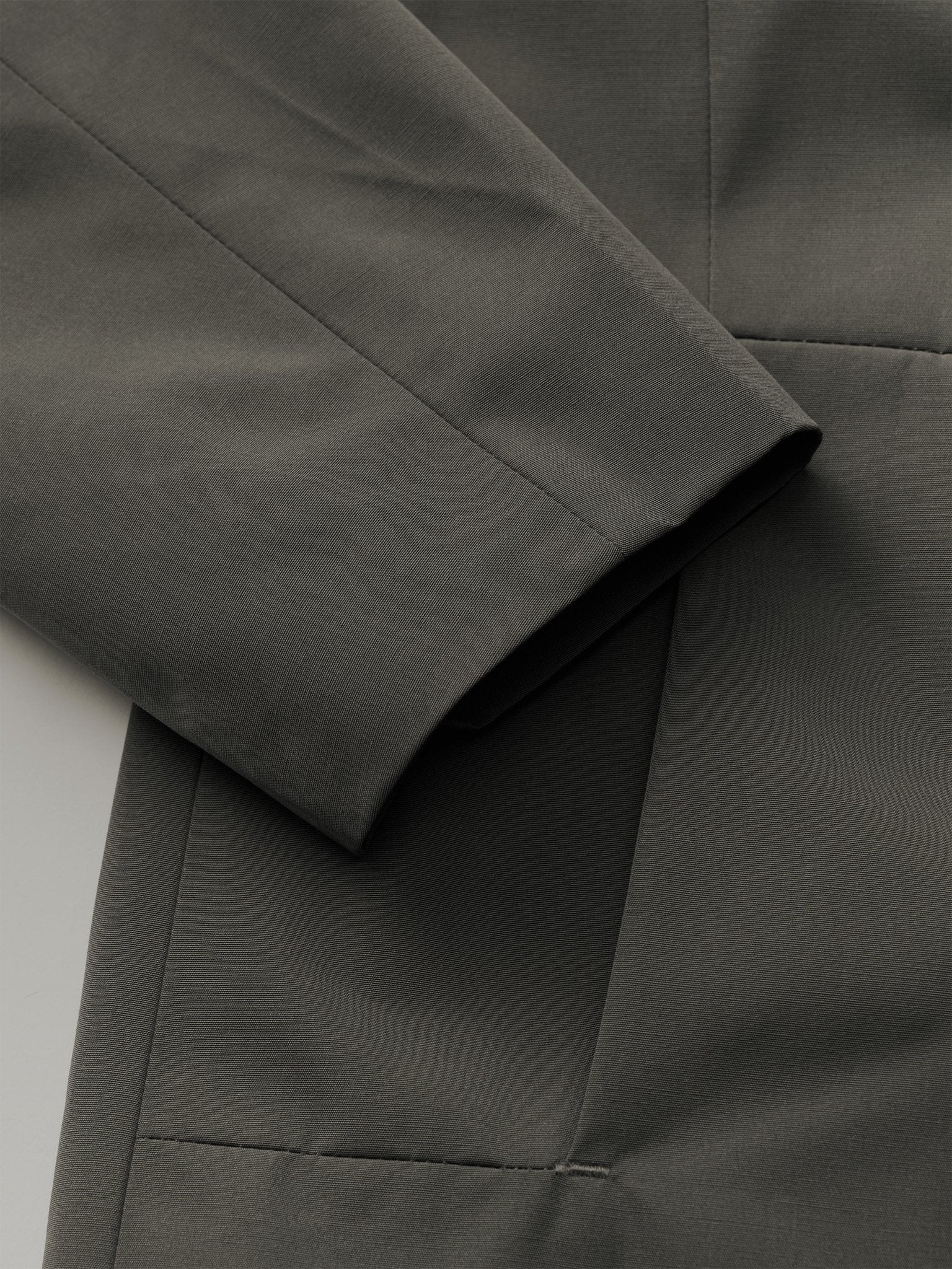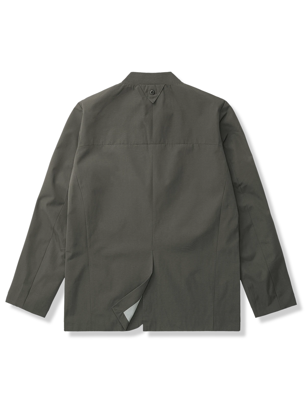 シンプルでスタイリッシュな無襟ジャケットです。落ち着いたカラーリングが特徴で、トレンドのセットアップスタイルにも合わせやすいデザインとなっています。ジップポケットが胸元に2つ配置され、小物の収納や落下を防止する実用性が高い仕様になっています。また、ノーカラー仕様で、首元が締め付けられることなく快適に着用できます。