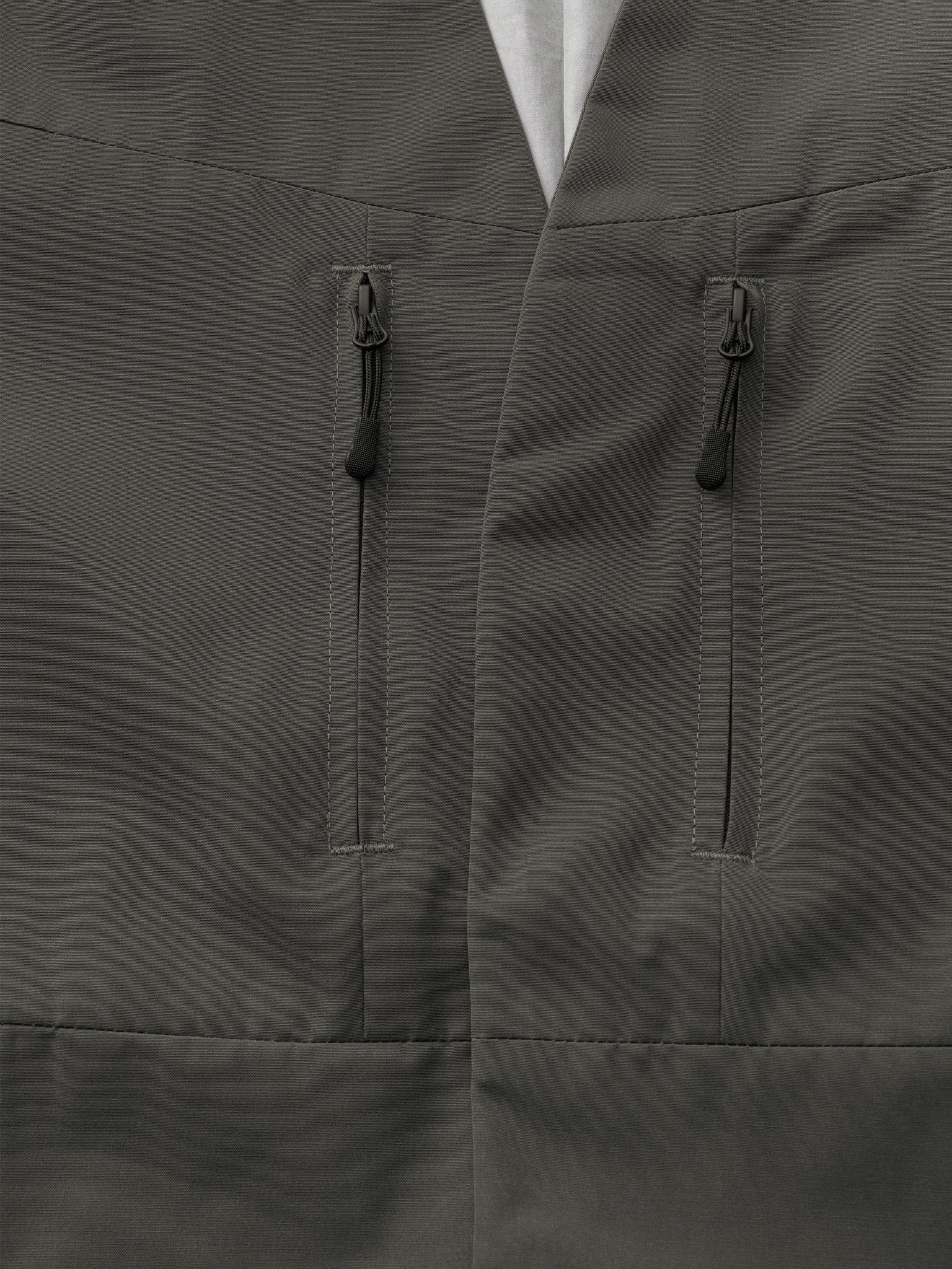 シンプルな無地のデザインで、コーディネートしやすいです。最近流行のラグジュアリーストリートな着こなしにモードの質感を加えることもできます。また、ジップポケットが胸元に2つ配置され、小物の収納や落下を防止する実用性が高い仕様になっています。