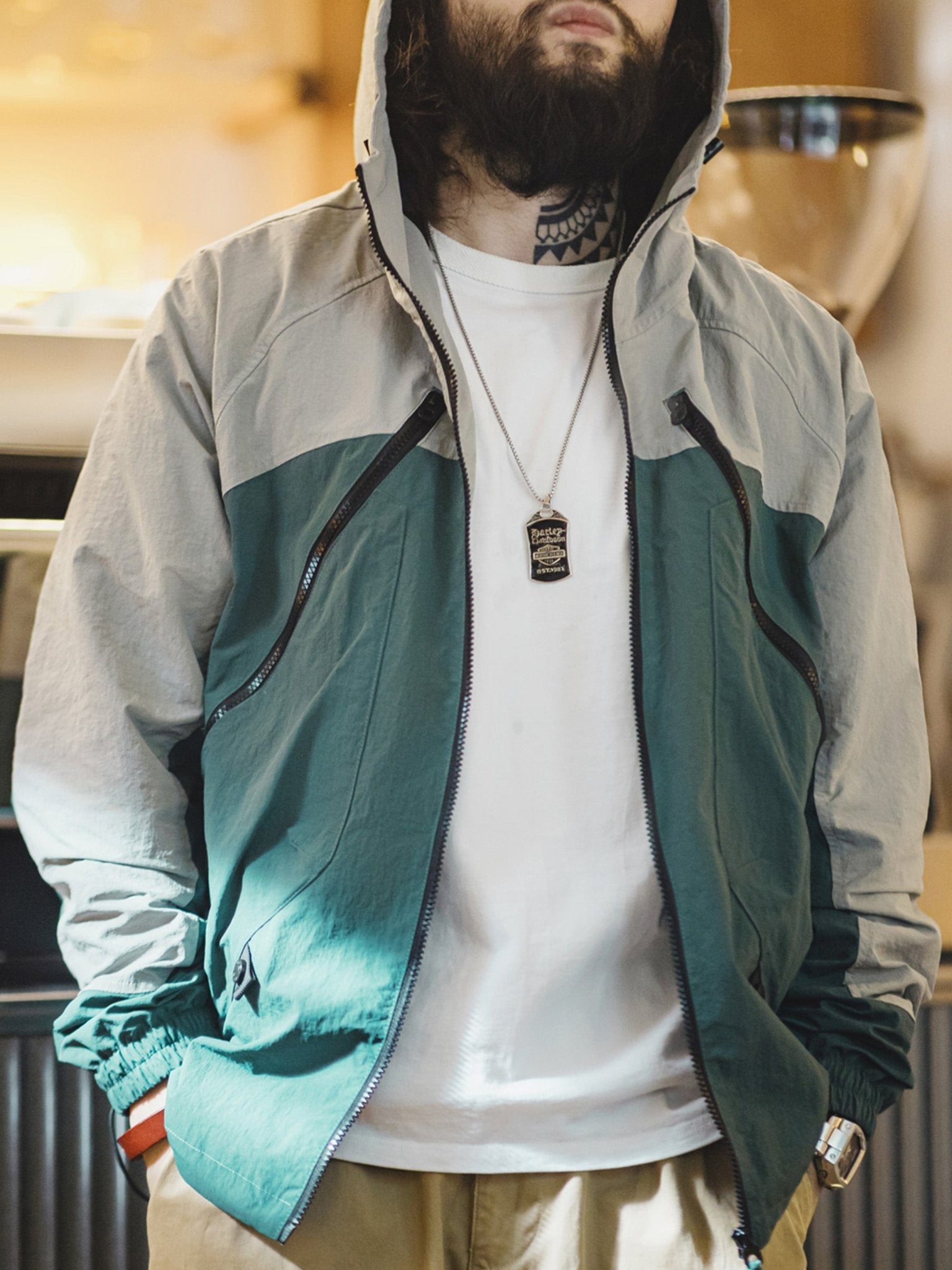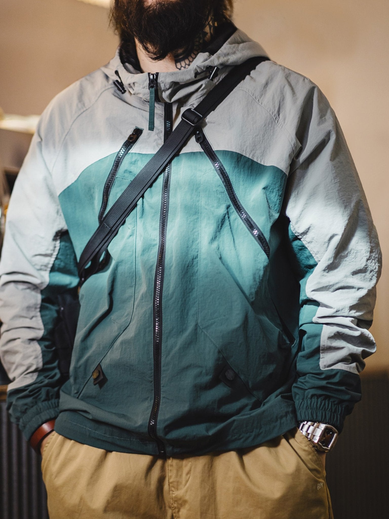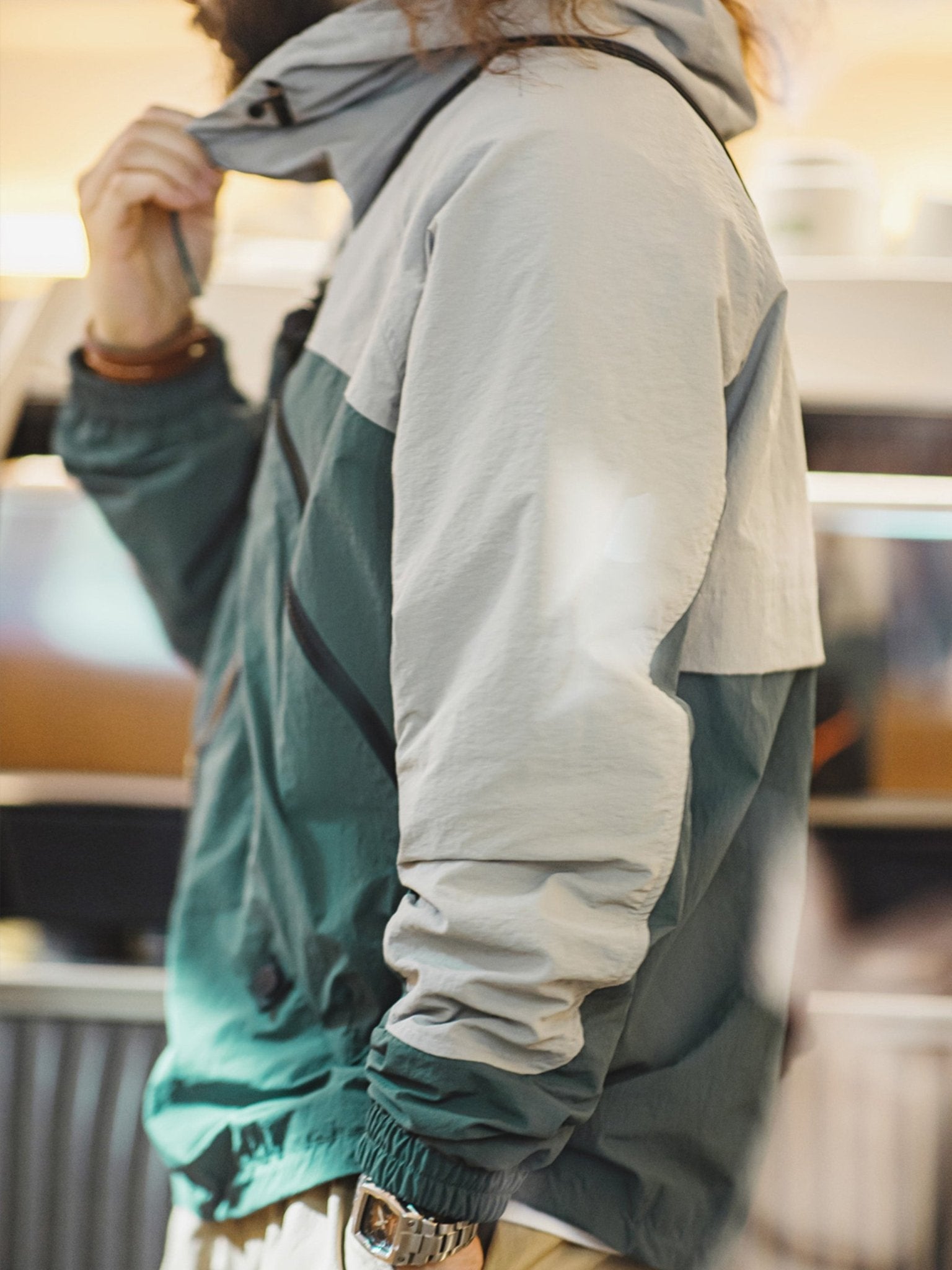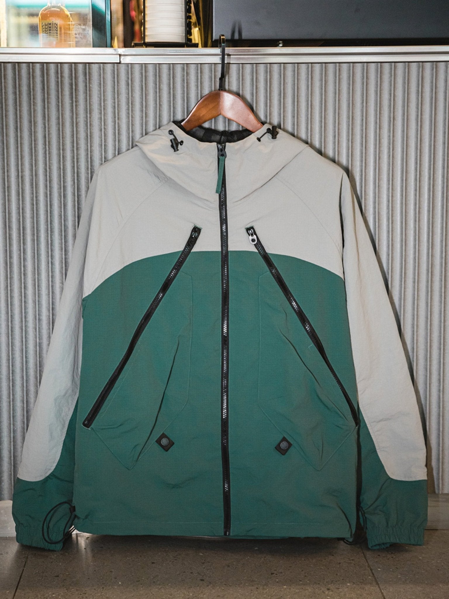 ジッパーやドローコードなどのデザイン要素を加え、マットな質感の生地がジャケットに軽度のレトロなダークなテクスチャーをもたらし、その特徴を際立たせています。