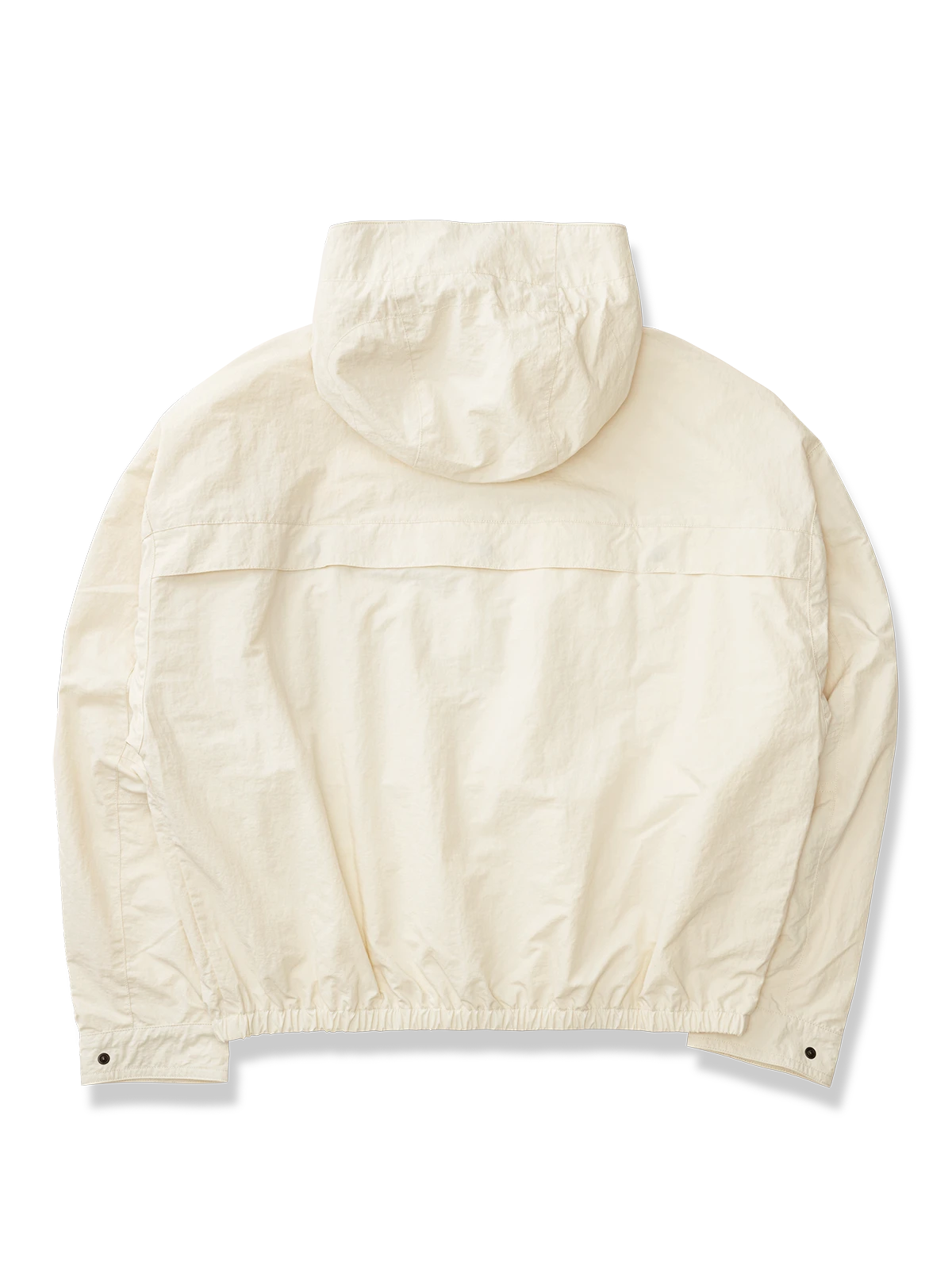 フード付きのデザインで、防風のフロントジッパーや、引き紐や伸縮性のあるデザインの襟、裾、袖口が付いているジャケット。
