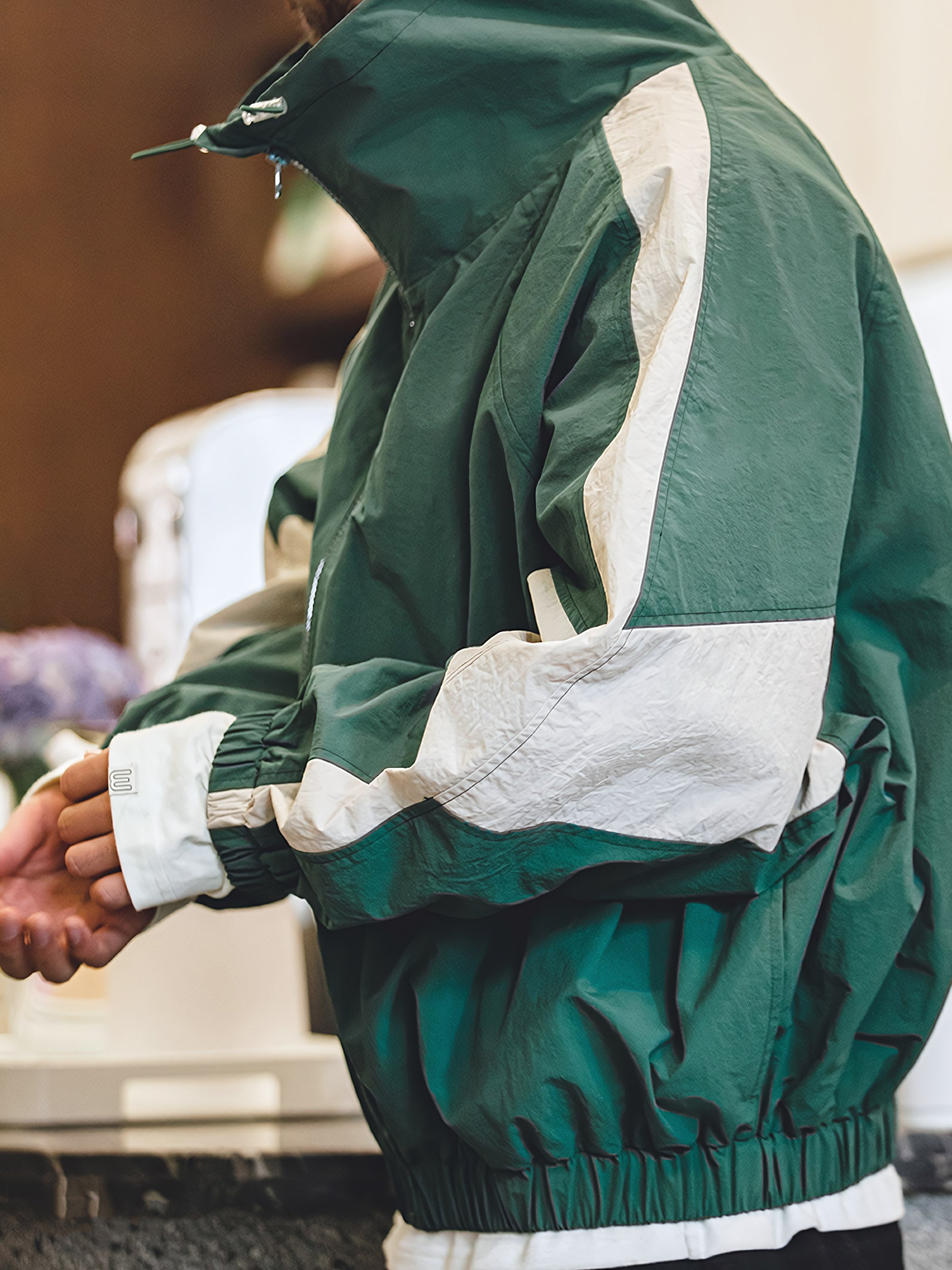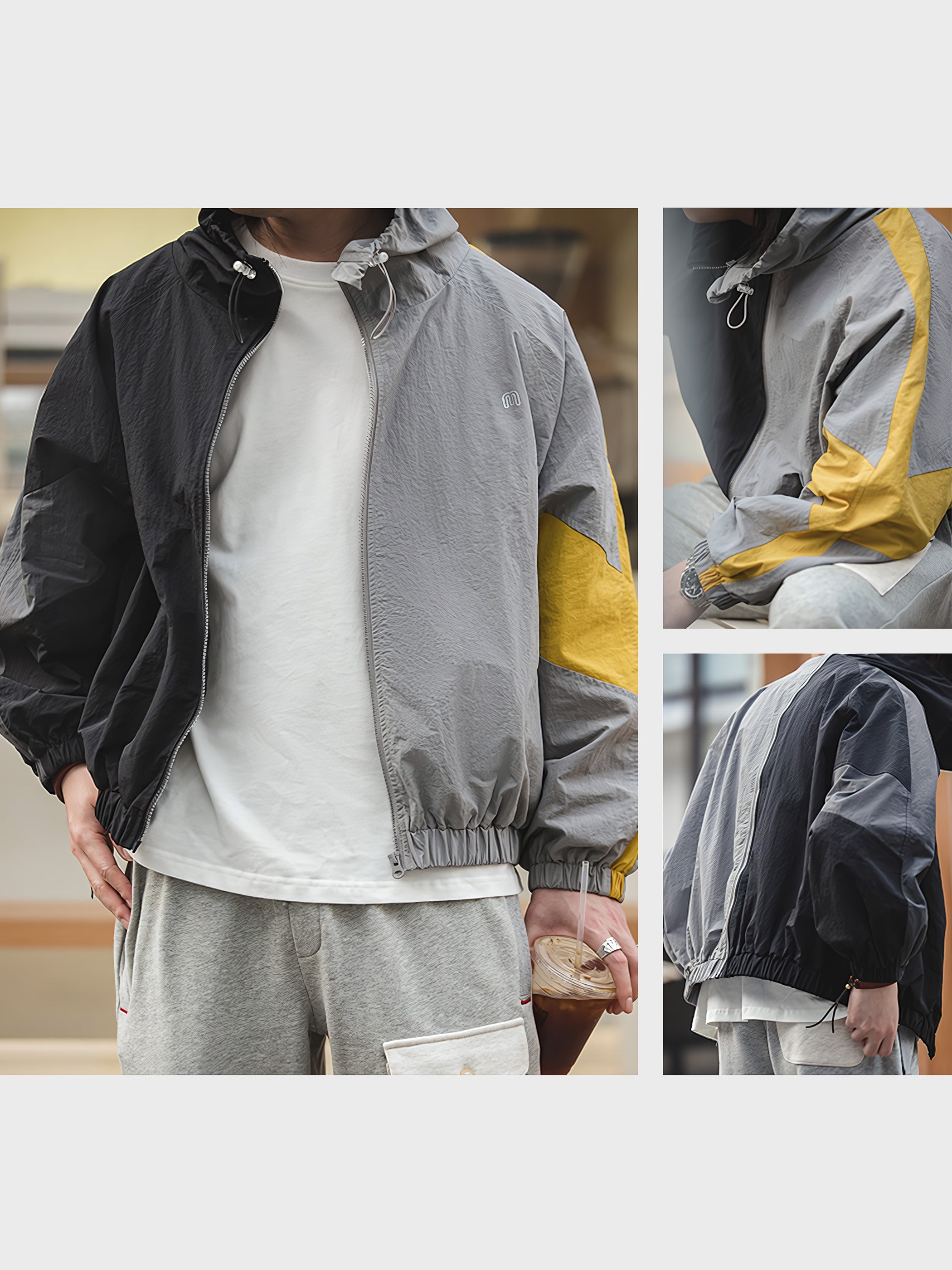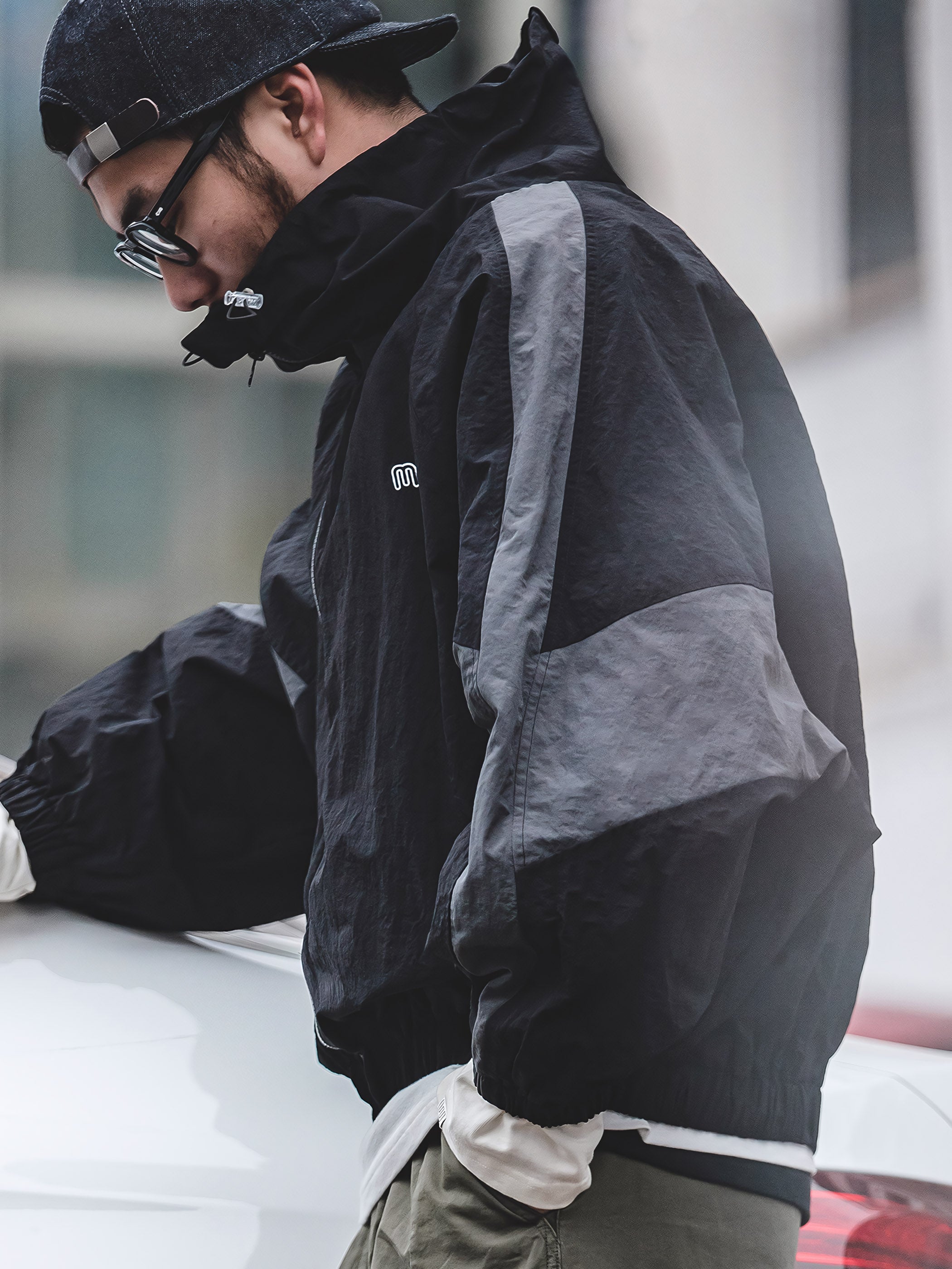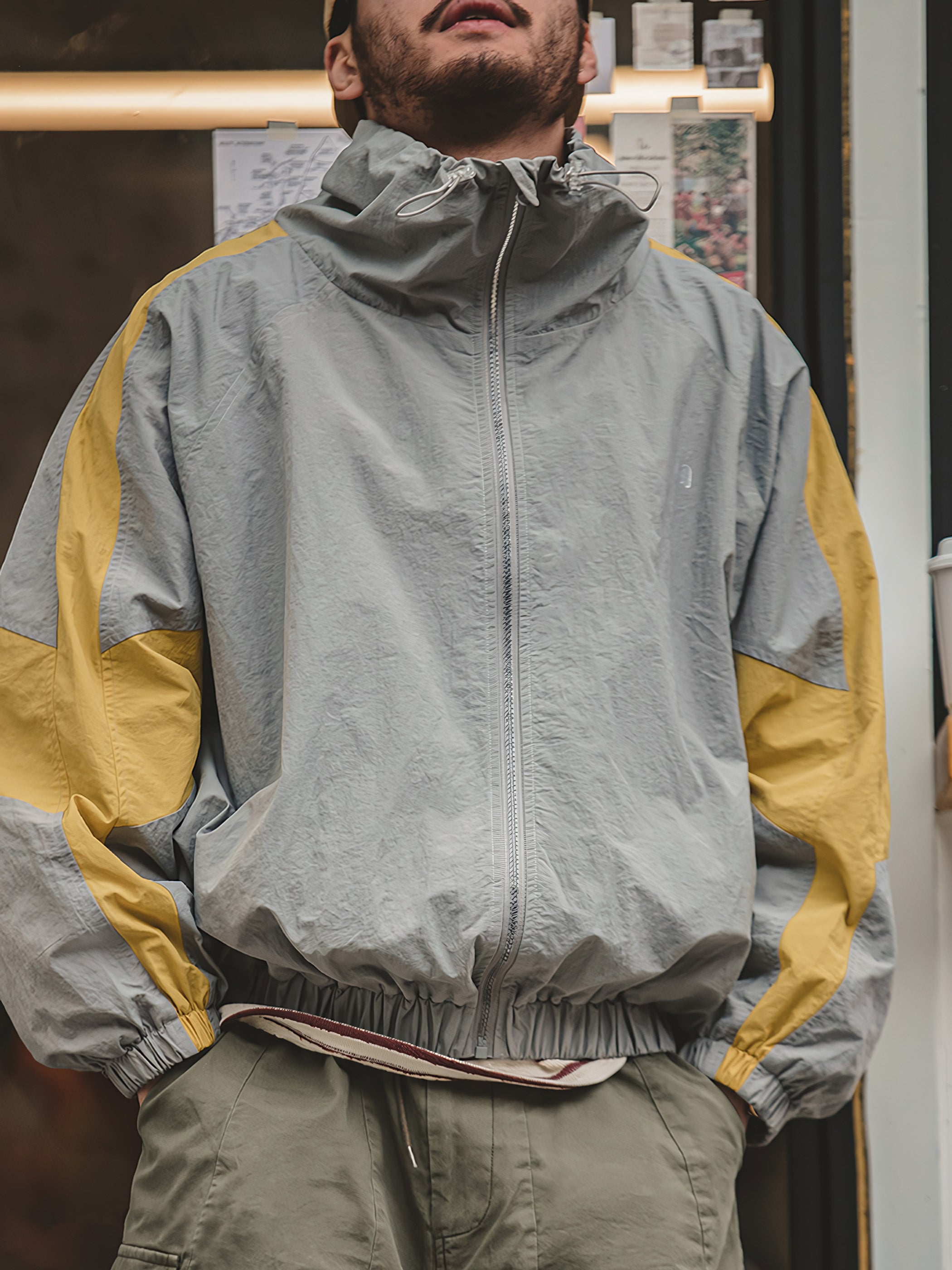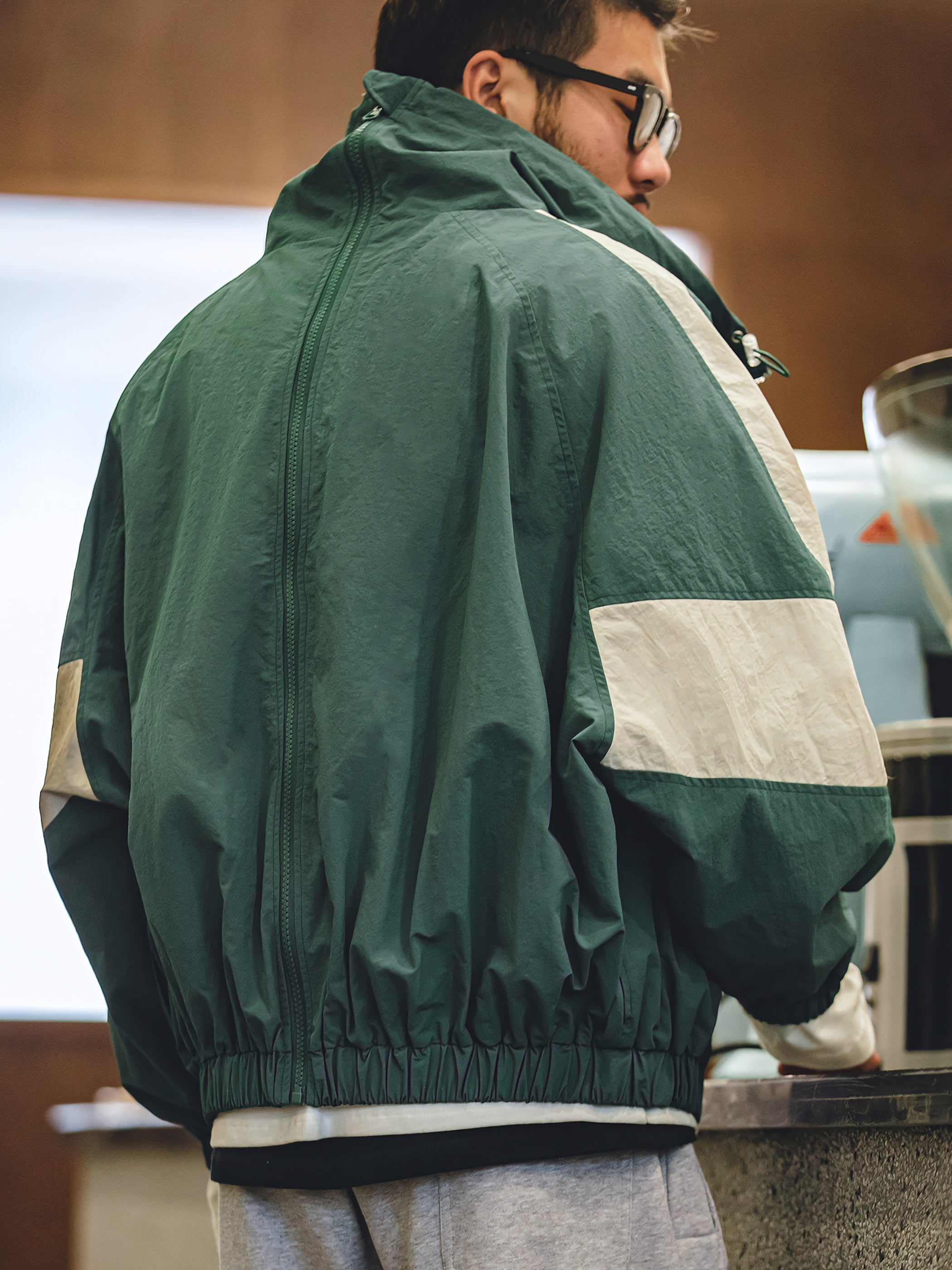 程よいシルエットとレトロ感が魅力的です。スポーツテイストを大胆な切り替えで表現し、襟元はドローコードで調節でき、袖先と裾はリブ仕様で風の侵入を防止できます。