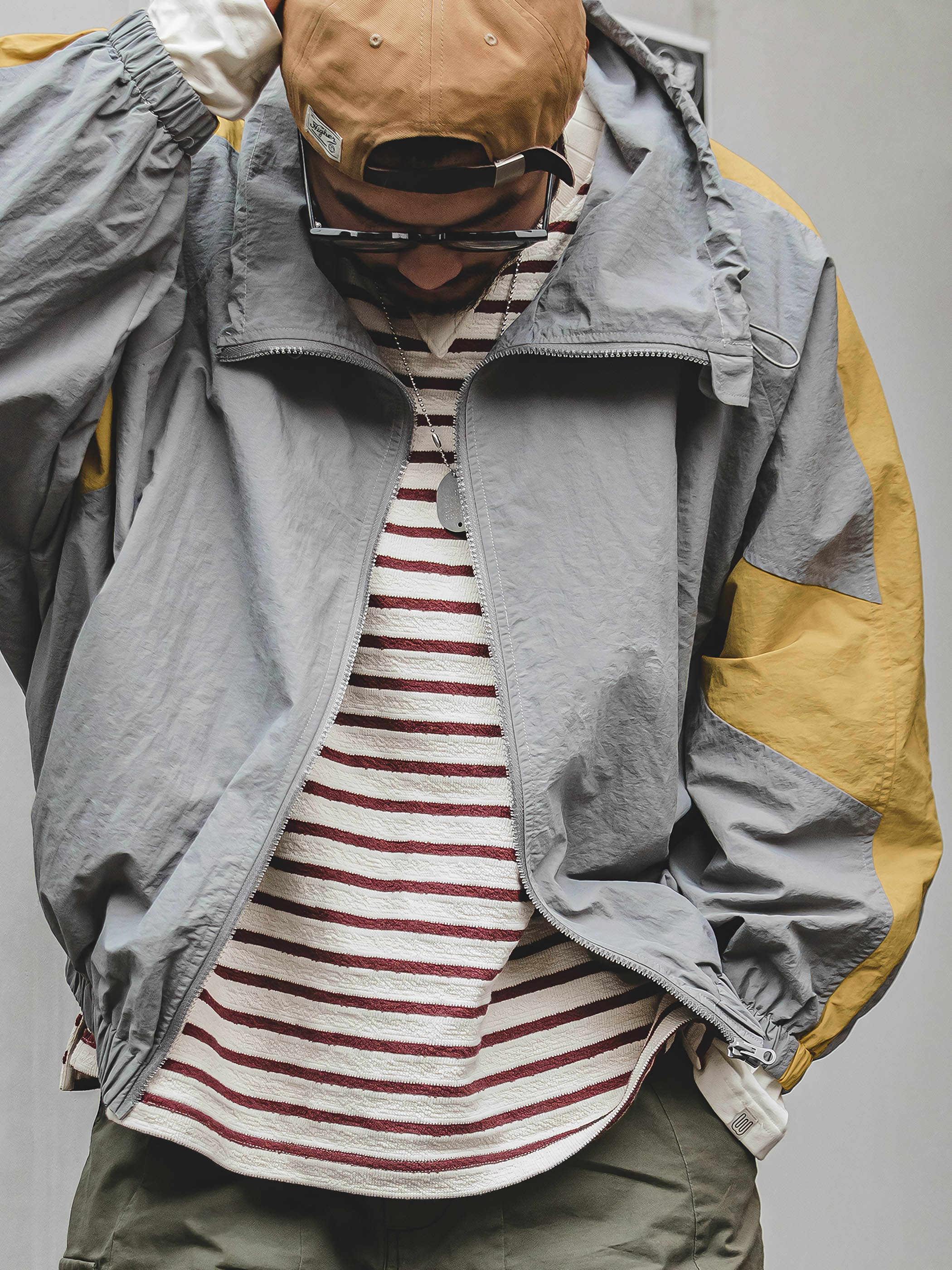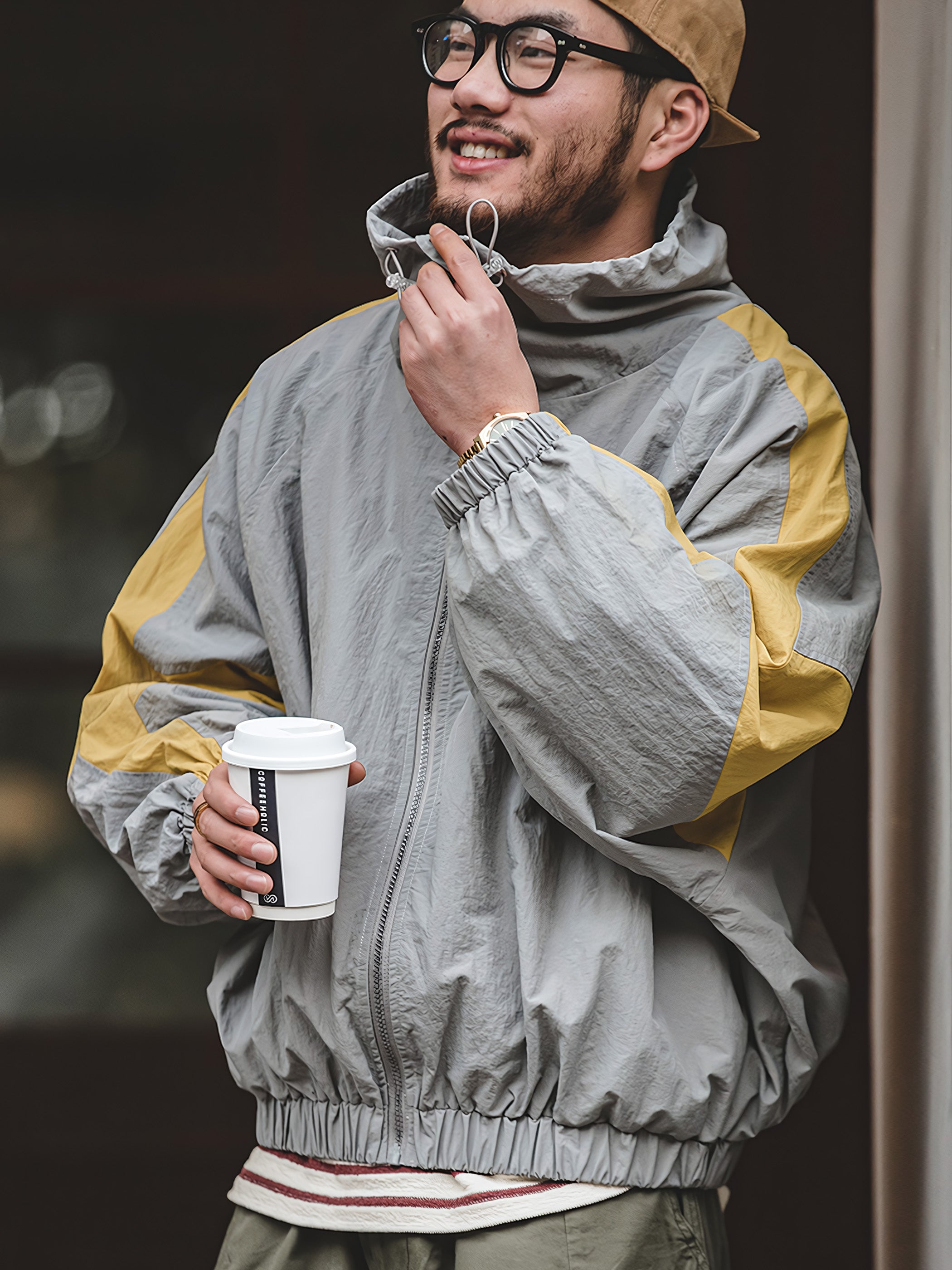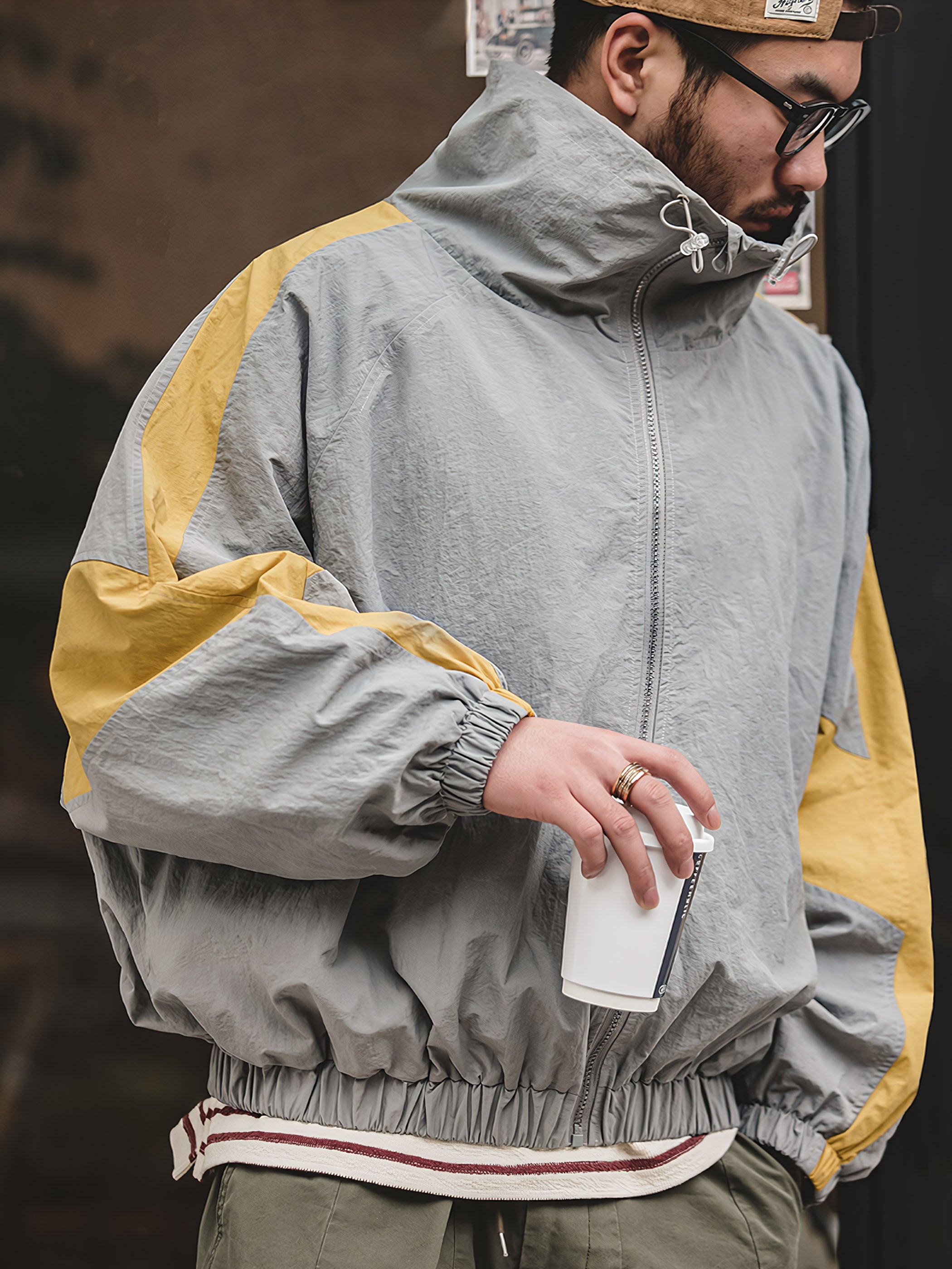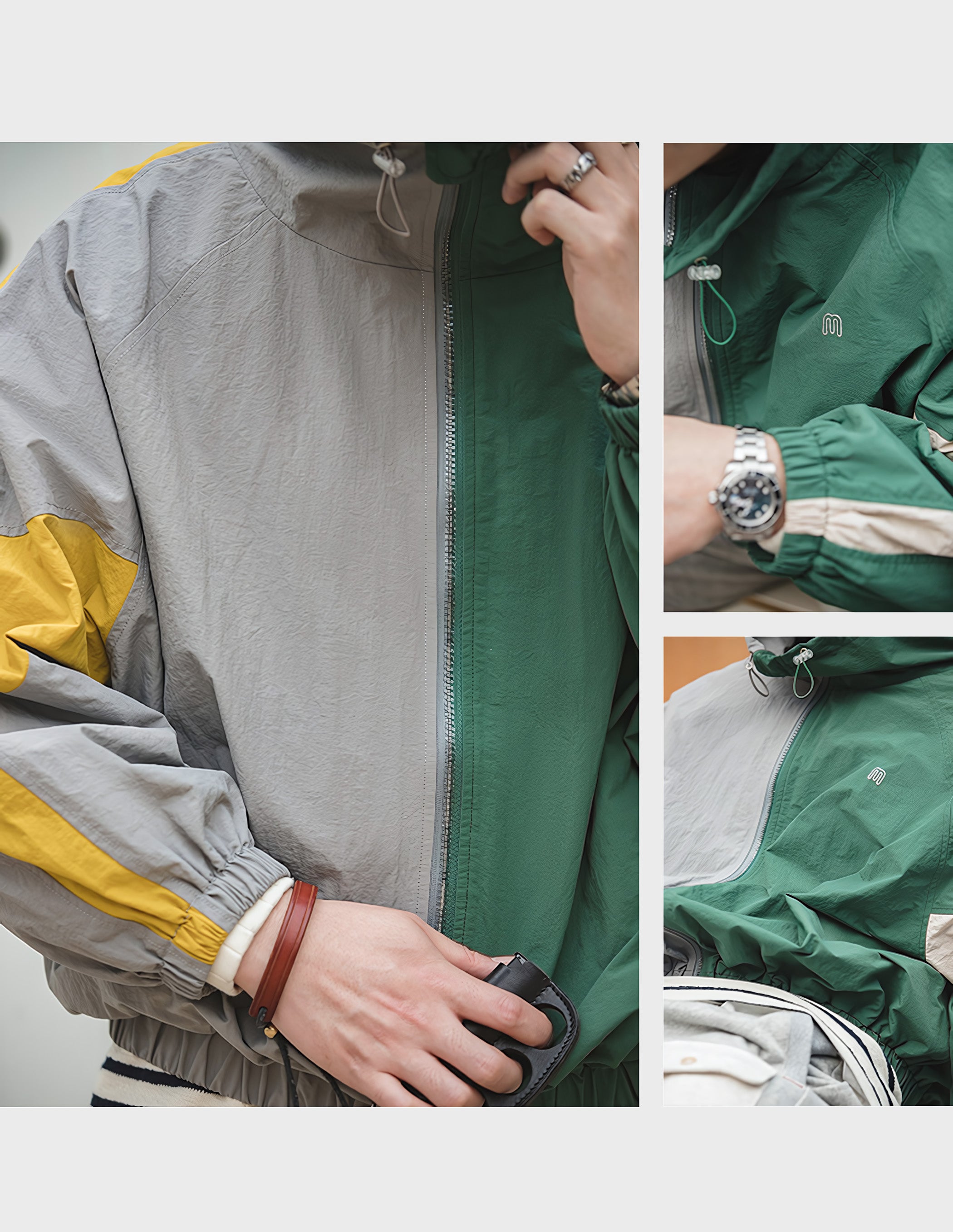 程よいシルエットとレトロ感が魅力的です。スポーツテイストを大胆な切り替えで表現し、襟元はドローコードで調節でき、袖先と裾はリブ仕様で風の侵入を防止できます。