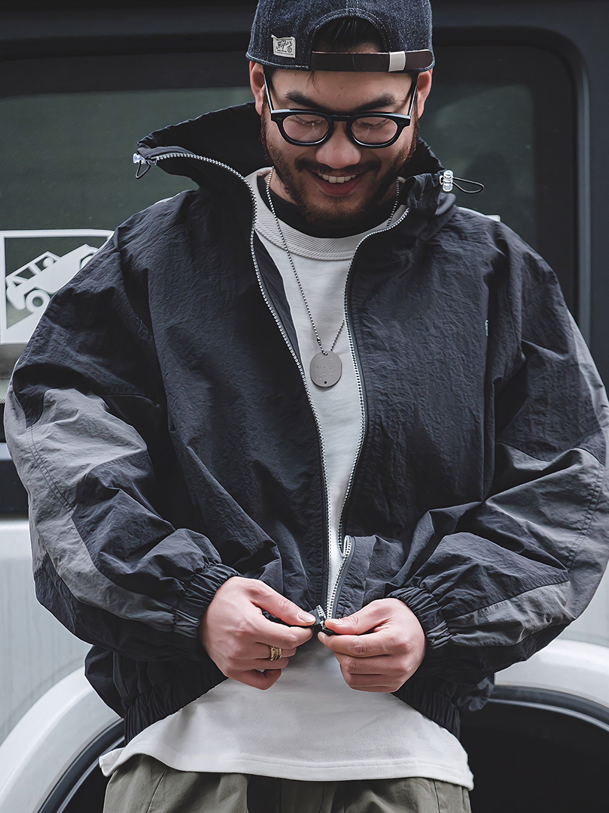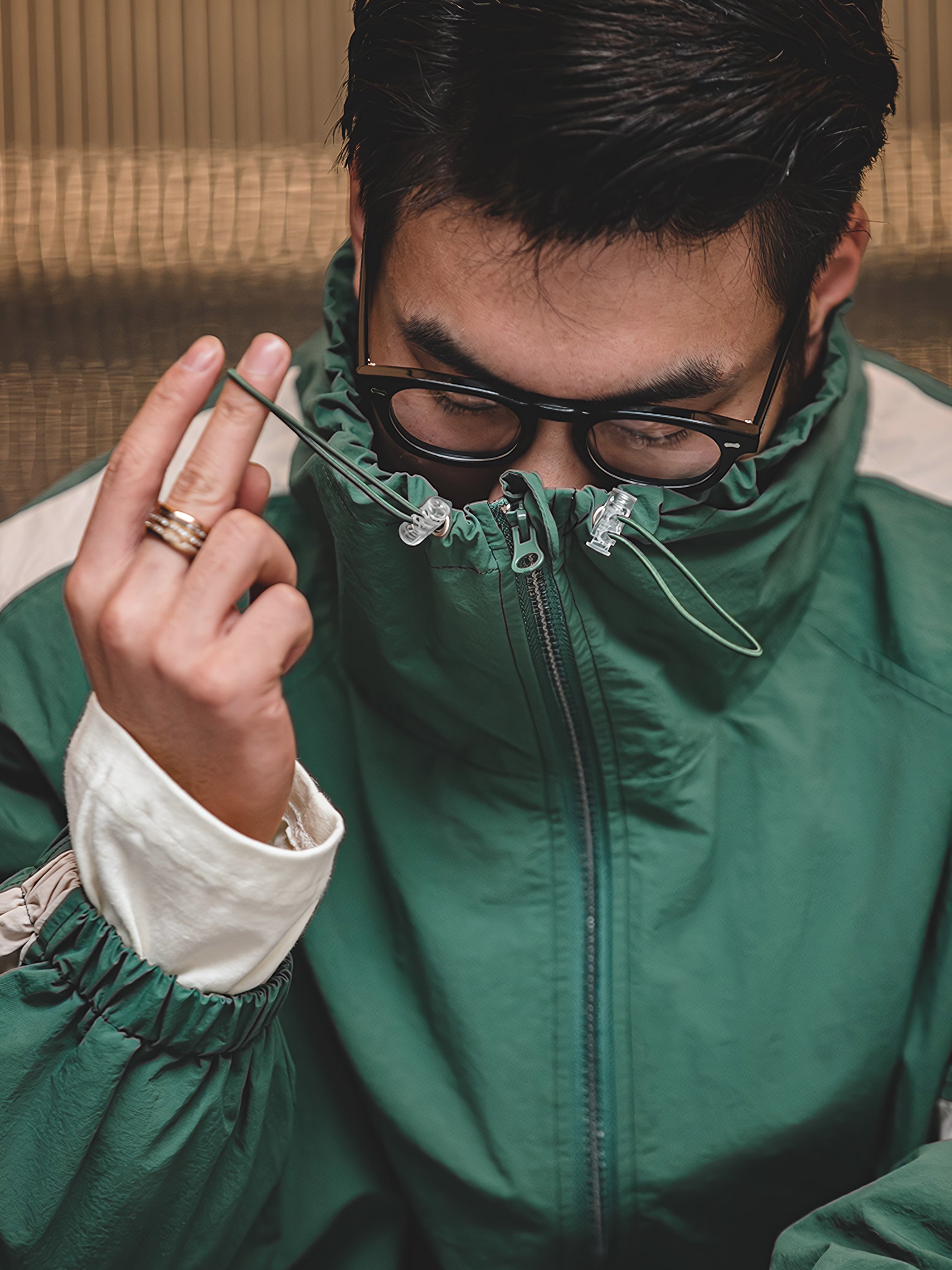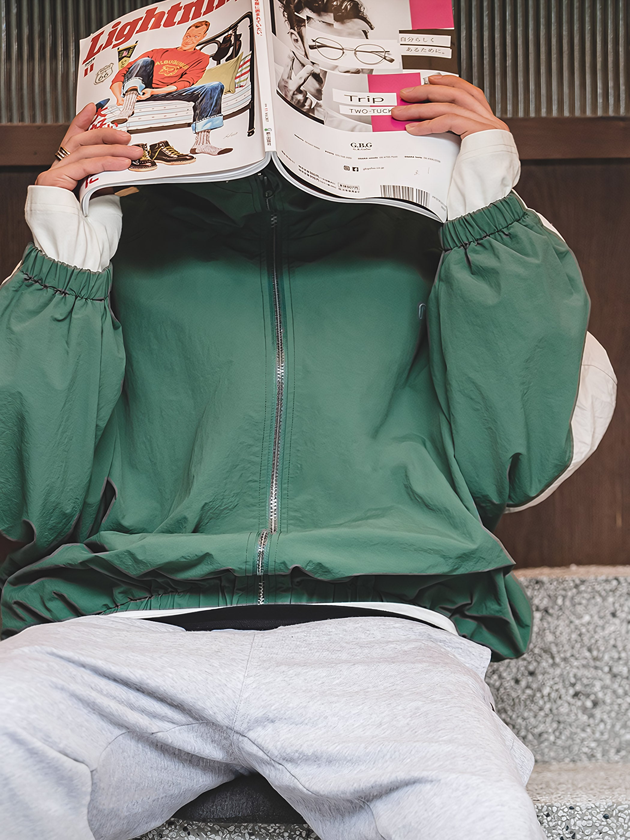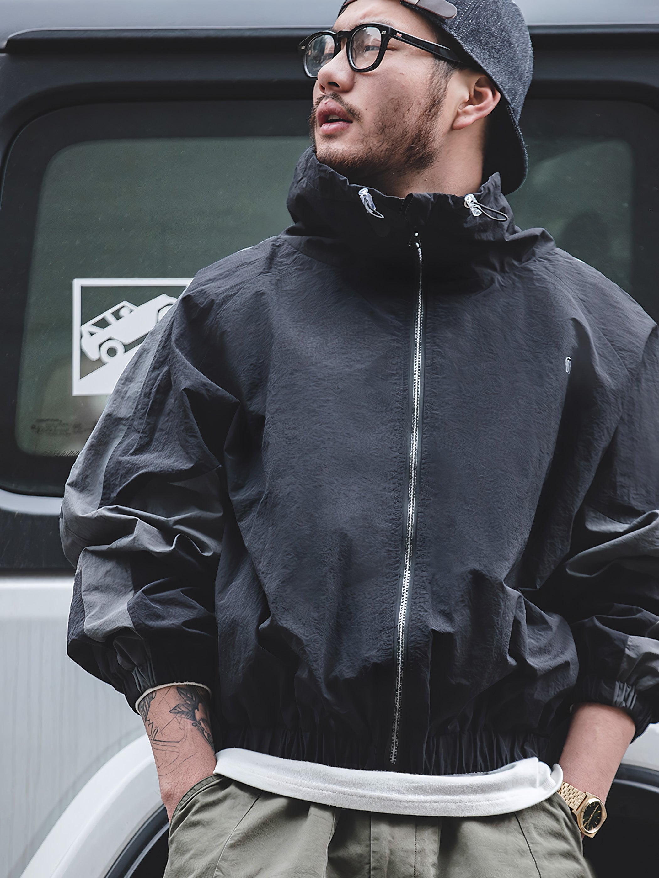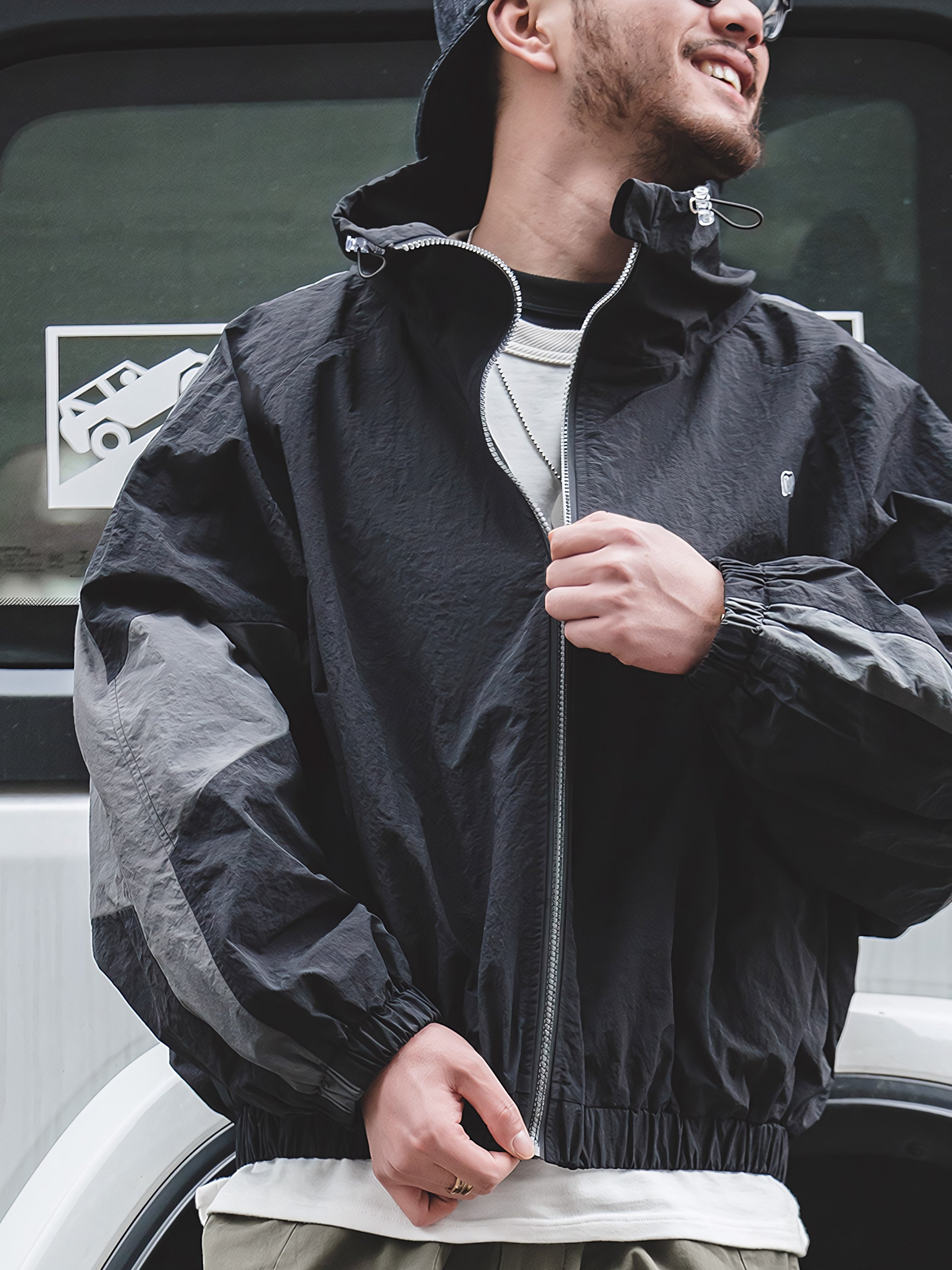 程よいシルエットとレトロ感が魅力的です。スポーツテイストを大胆な切り替えで表現し、襟元はドローコードで調節でき、袖先と裾はリブ仕様で風の侵入を防止できます。