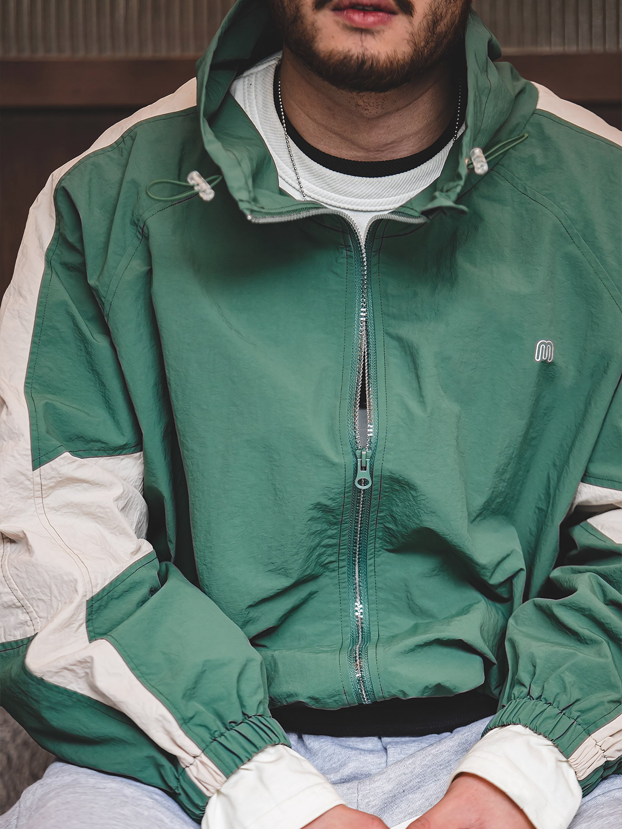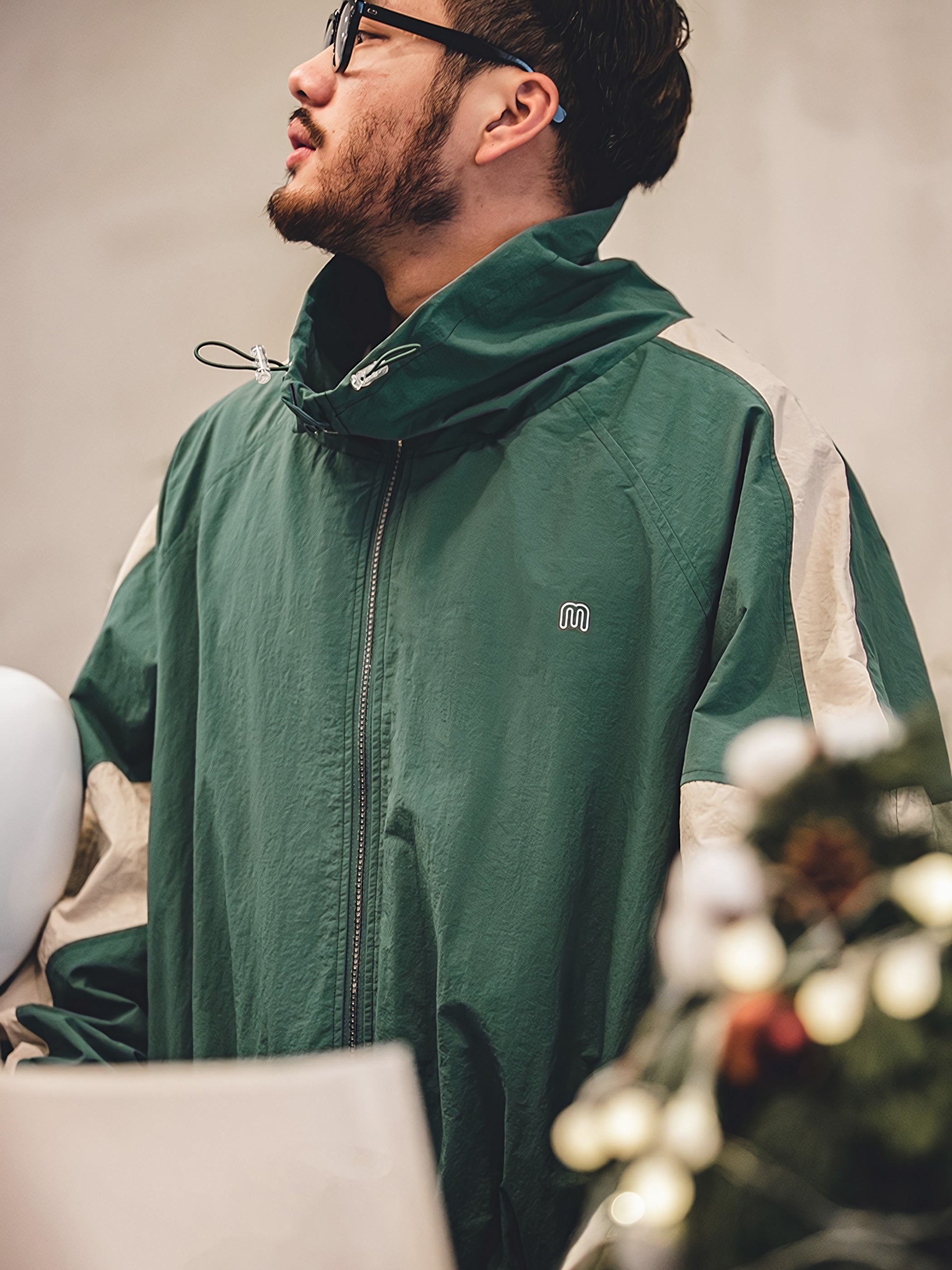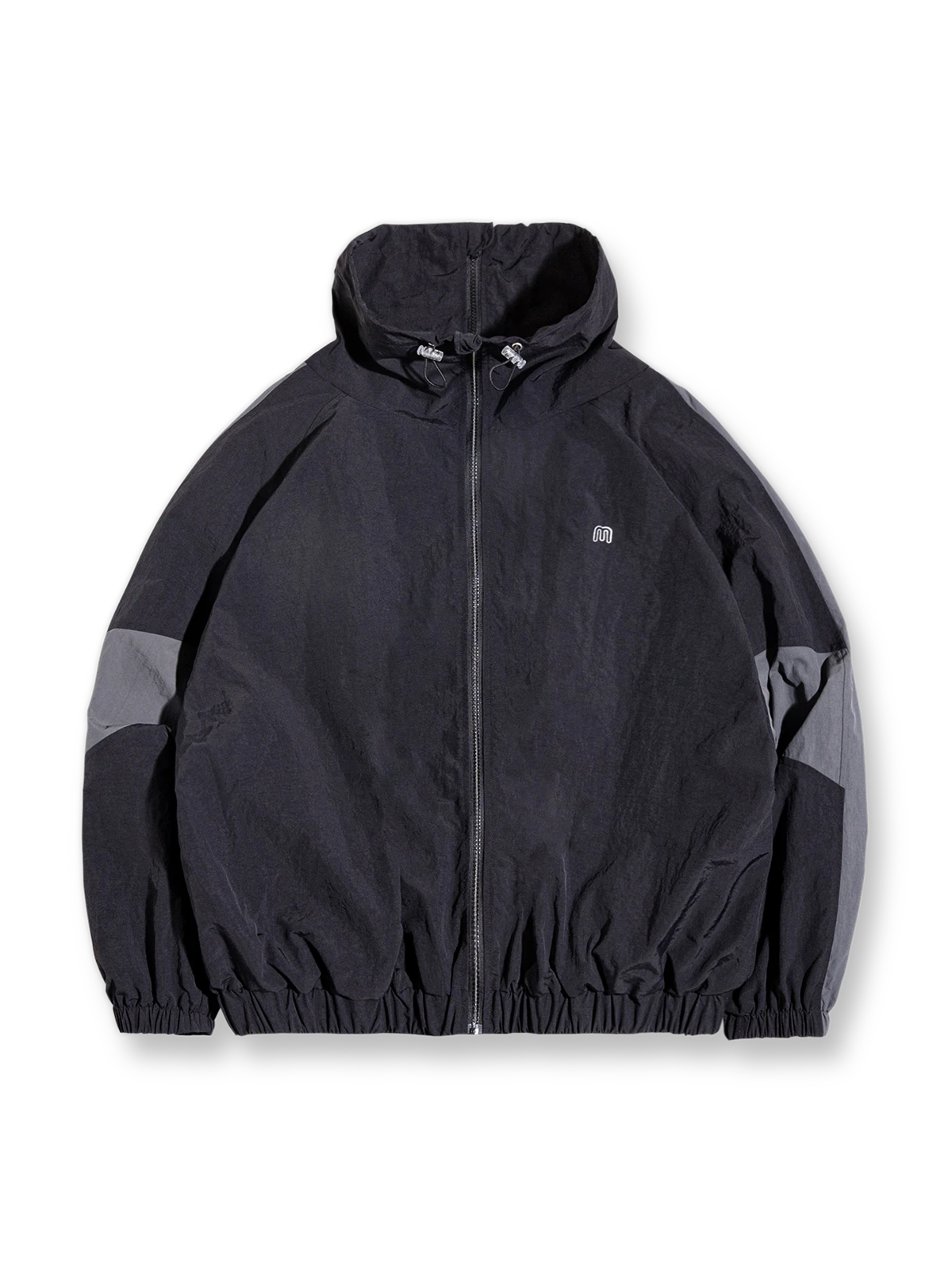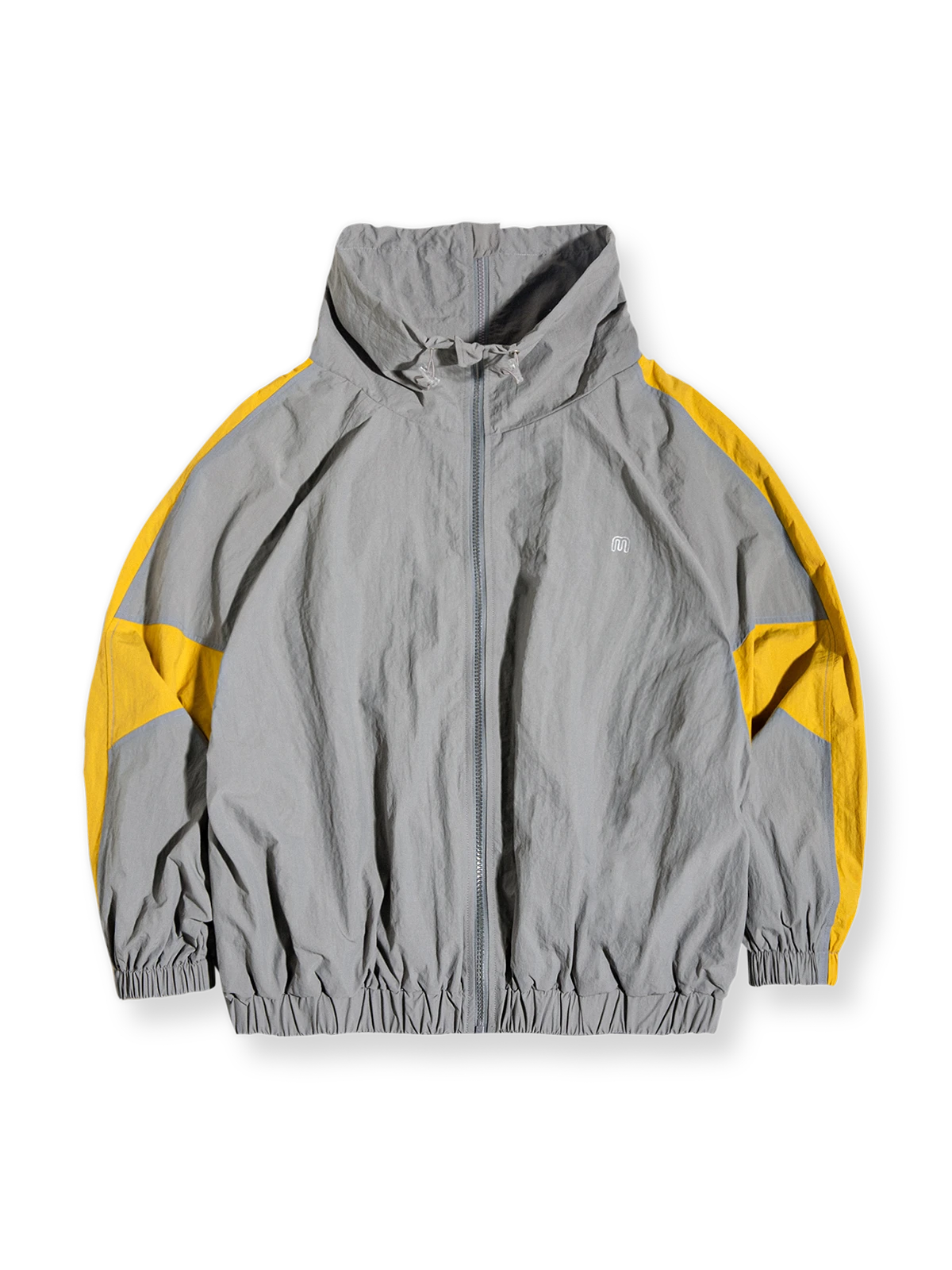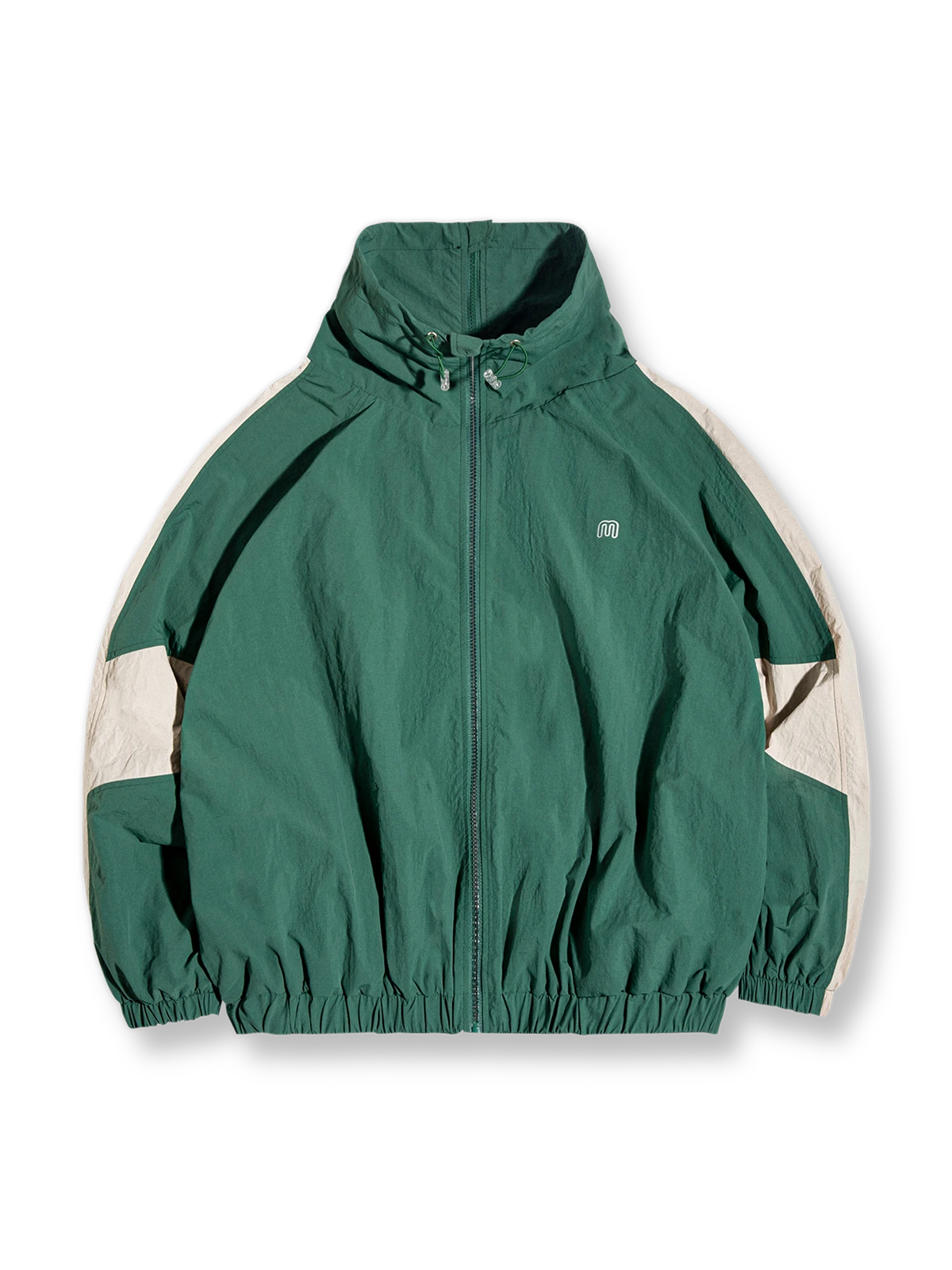 左胸元には小さなM英文字ロゴが取り付けられ、腰サイトには2つのポケットが内蔵されています。また、襟元のドローコードやリブ仕様の袖先と裾など、細部にこだわったデザインとなっています。