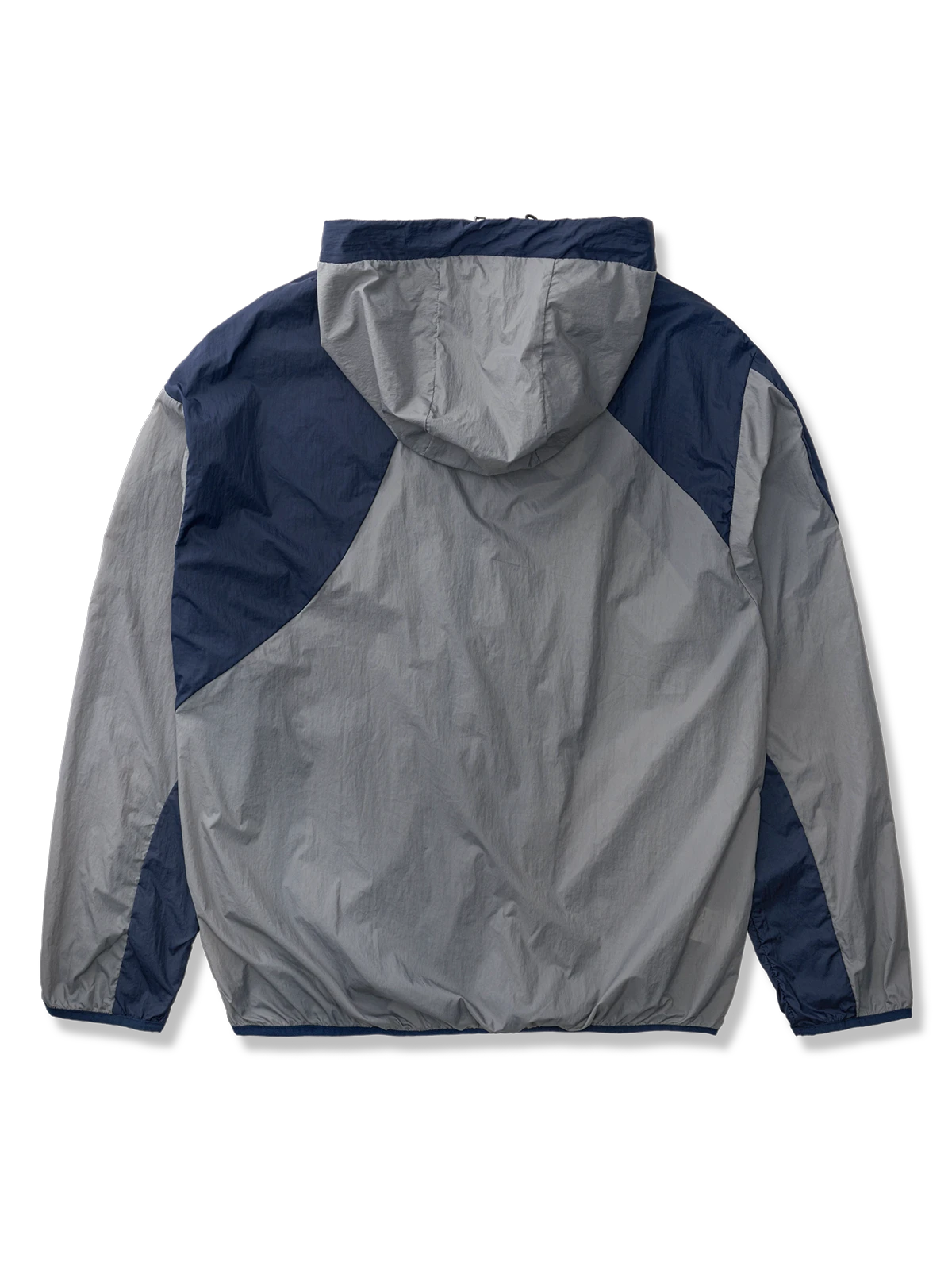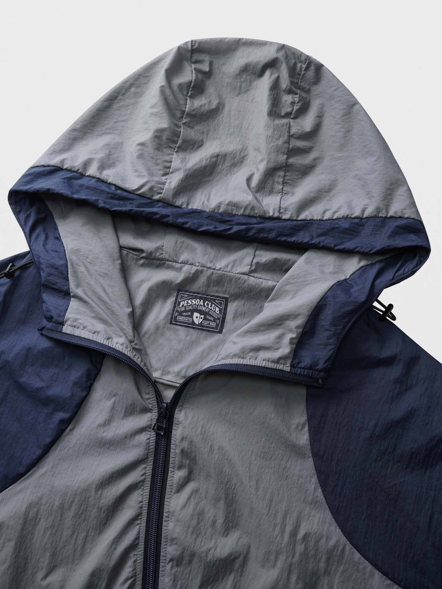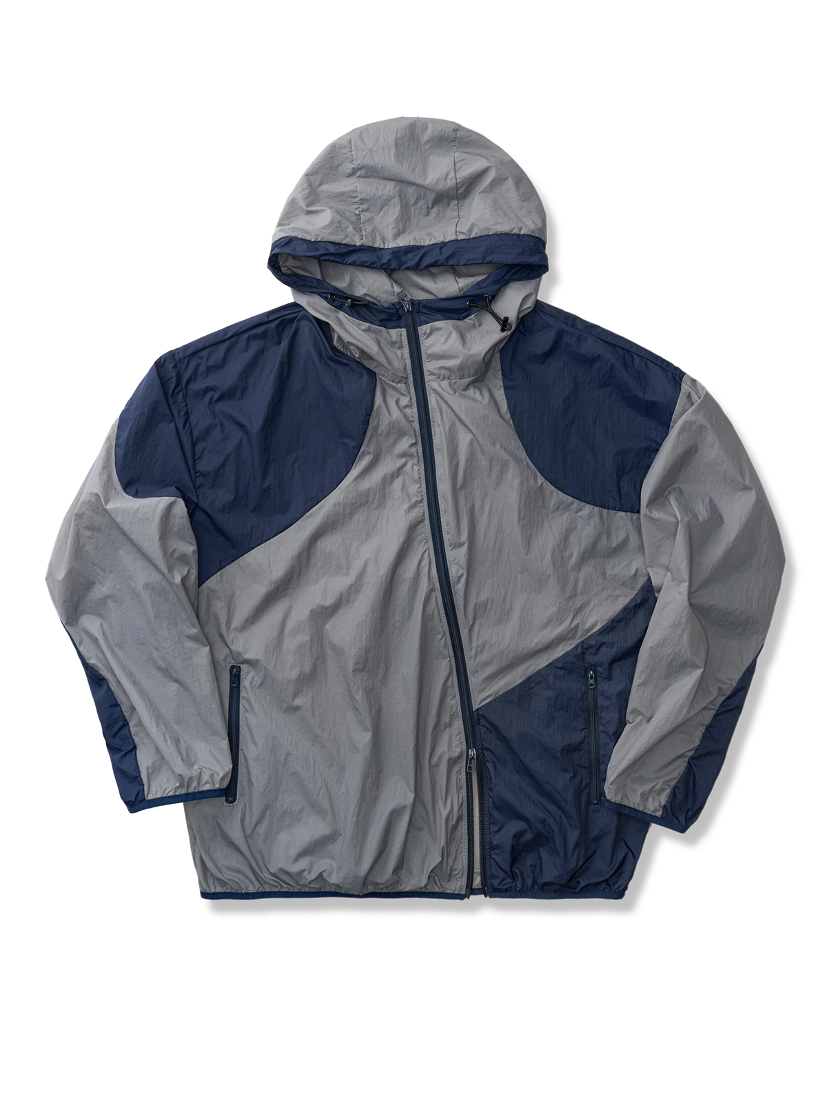 このUVカットパーカは、軽くて薄いナイロン素材を使用し、アウトドア要素とファッション要素を融合しています。青色と灰色のコントラストデザインがあり、カーブ状のジッパーやサイドポケット、そしてフード付きで、軽快なスポーツ感があります。