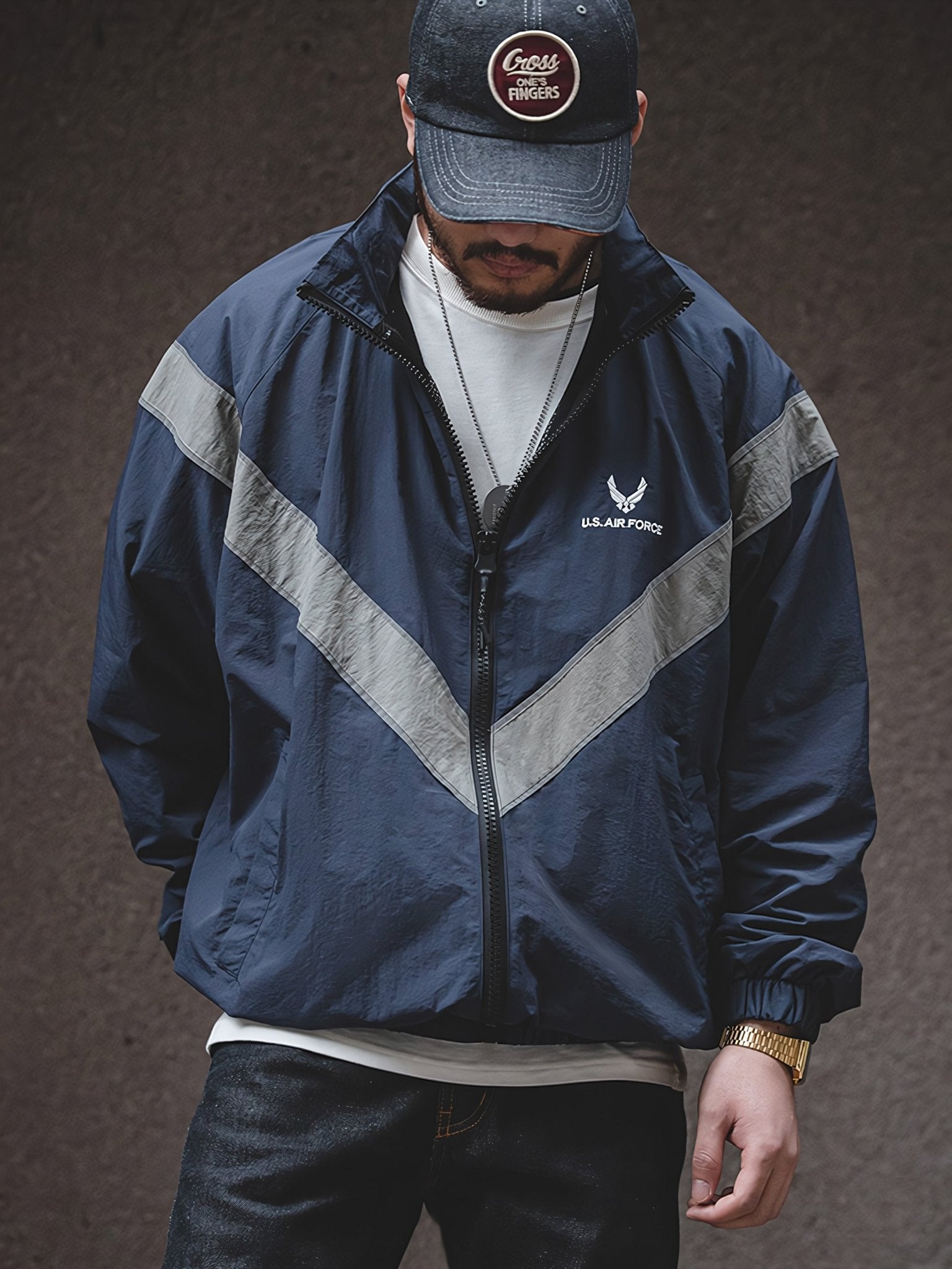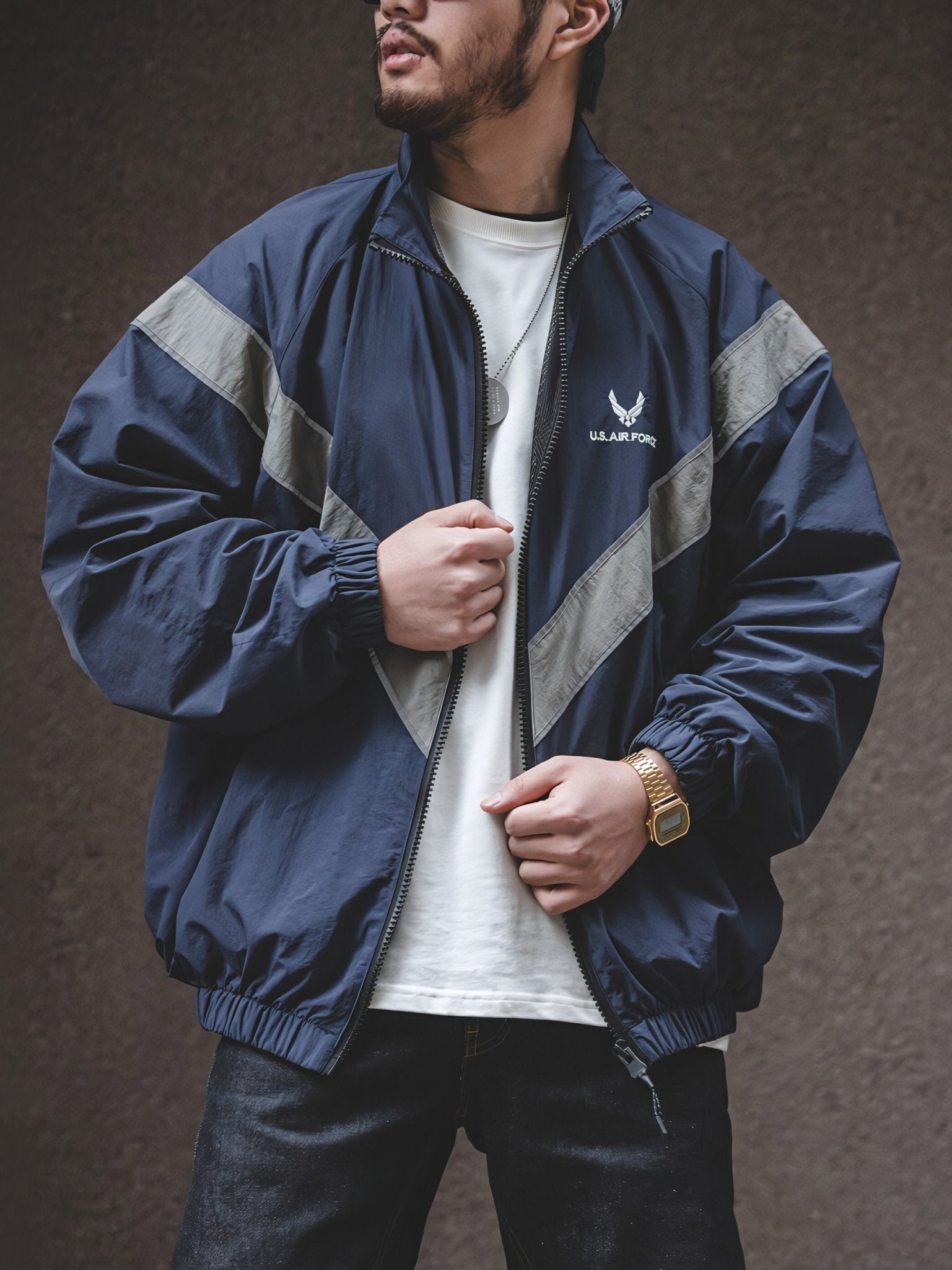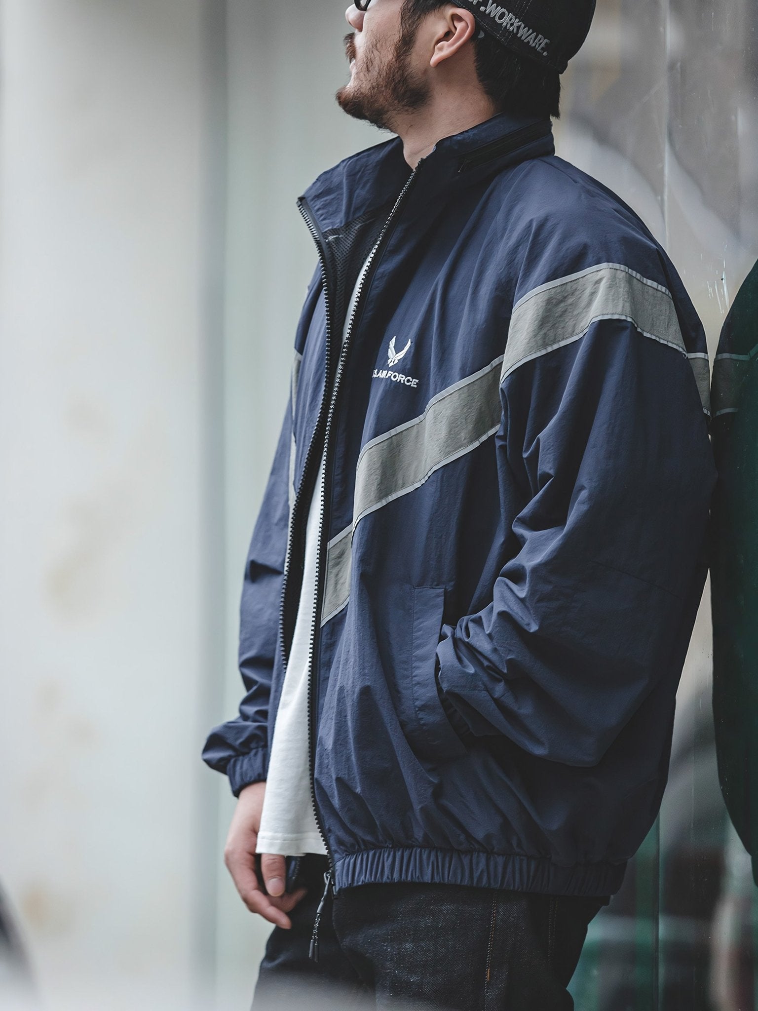 古着ブームの影響で若者にも人気のある、米陸軍・空軍のトレーニングジャケットにインスピレーションを得て改良されたデザインです。フロント・バックには光を反射する素材を使用したグレーの大きなV字のウイングがあしらわれ、クールでスポーティーな印象を与えます。
