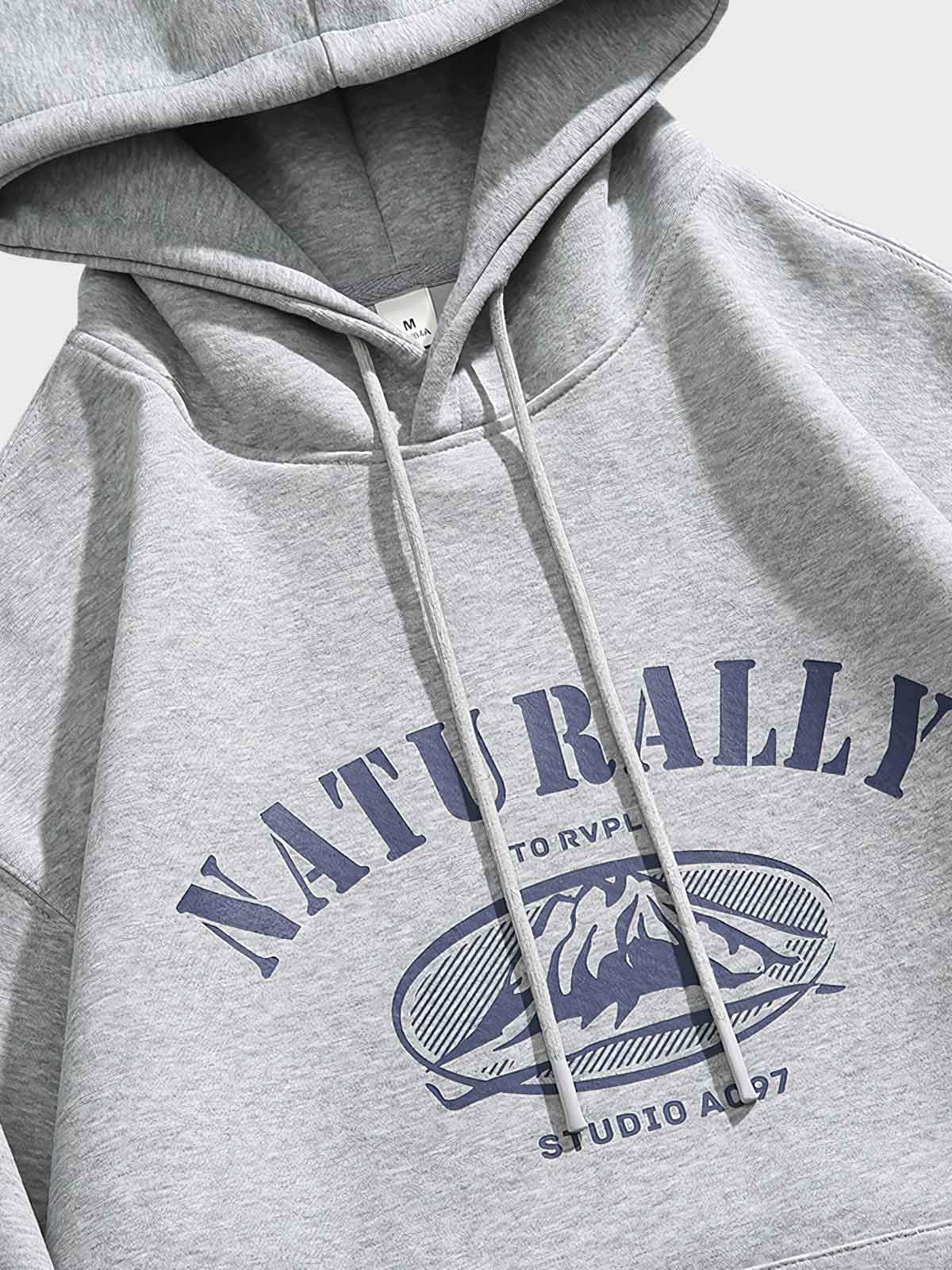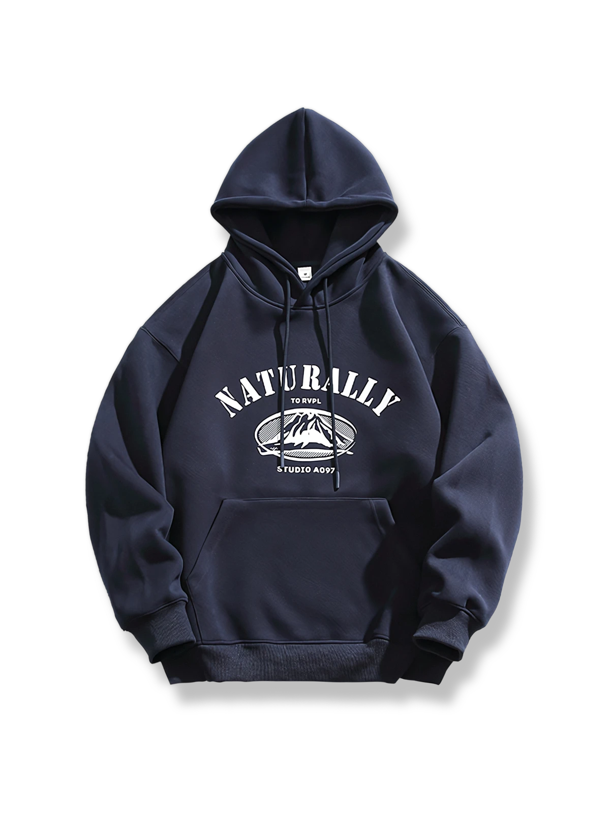 このフーディーは、アウトドア探検と自然への敬愛を体現しています。山岳のプリントは、人類が古くから続ける山岳探検の伝統を象徴し、「Naturally」というテーマと調和しながら、自由と挑戦の精神を表現しています。