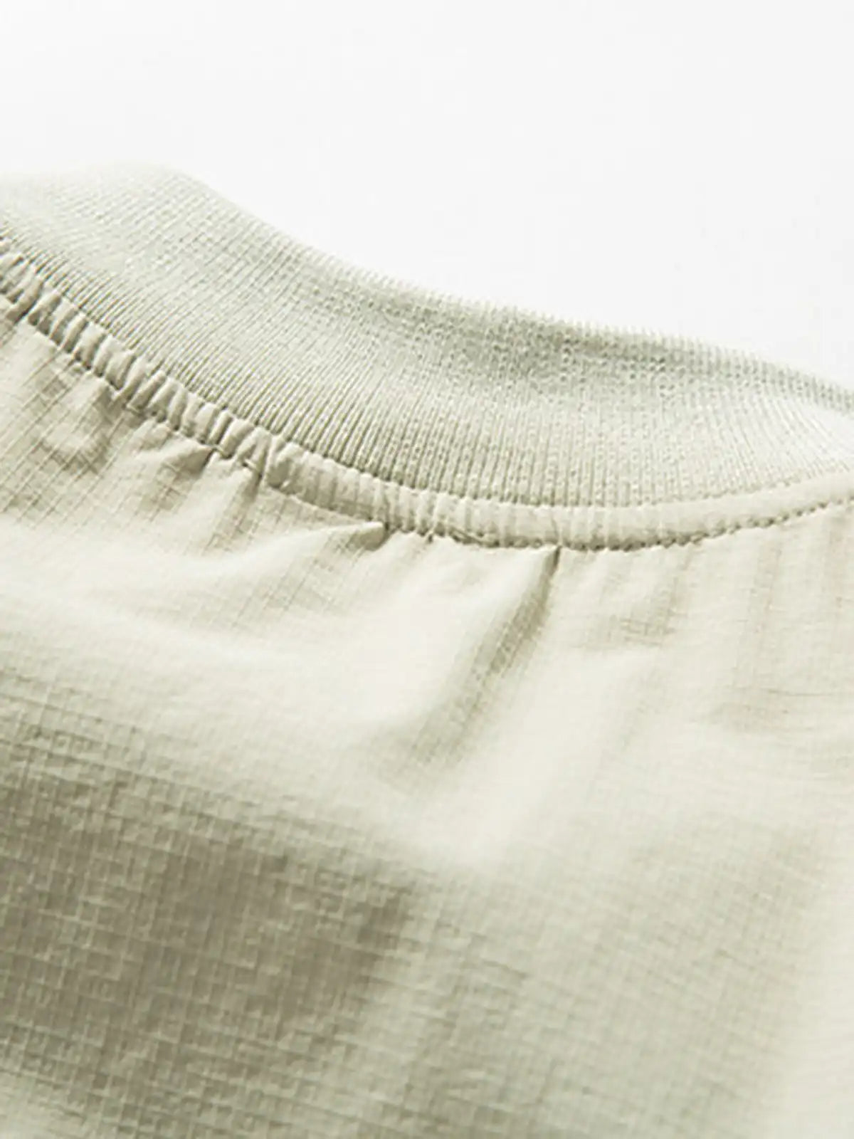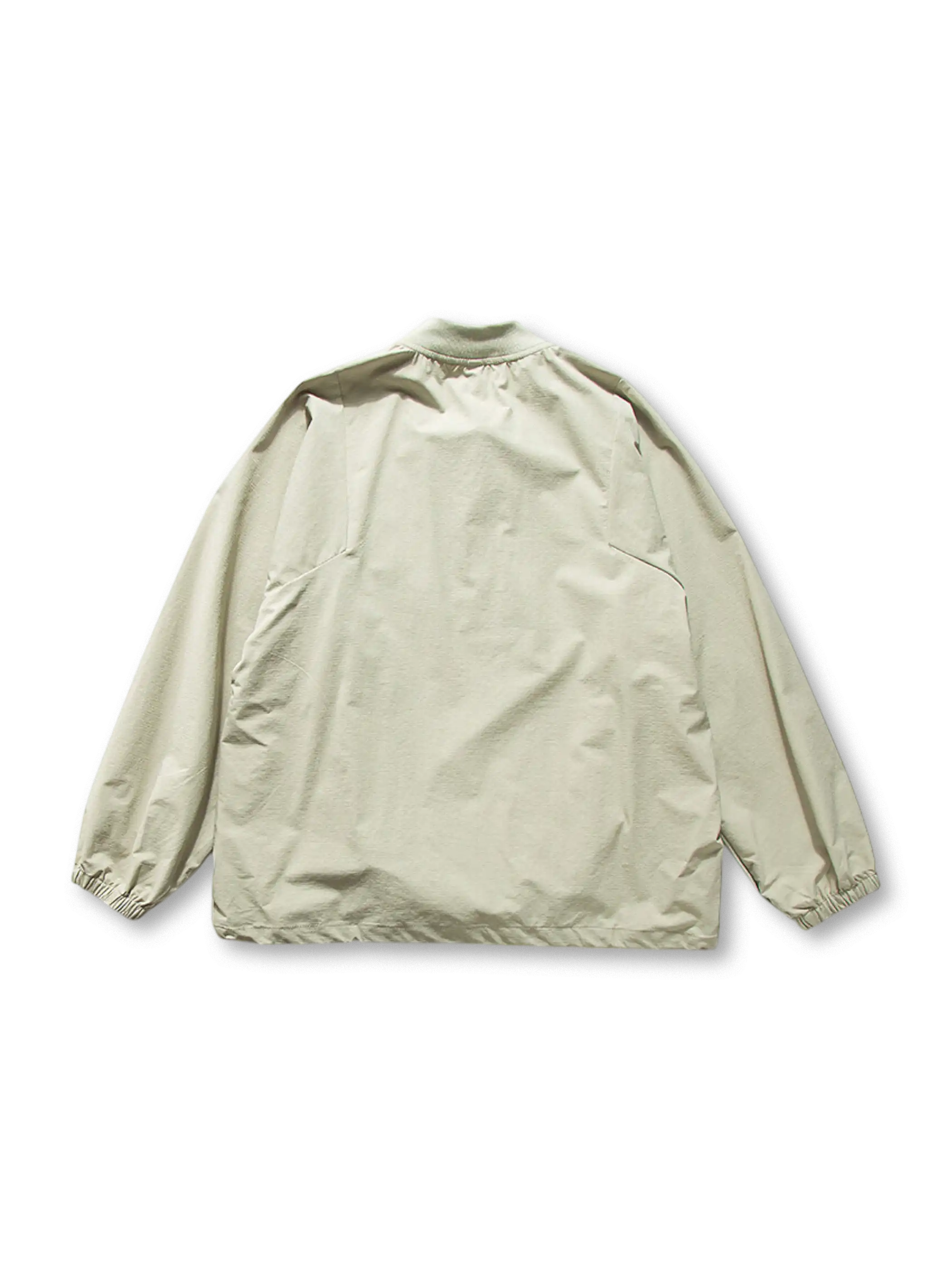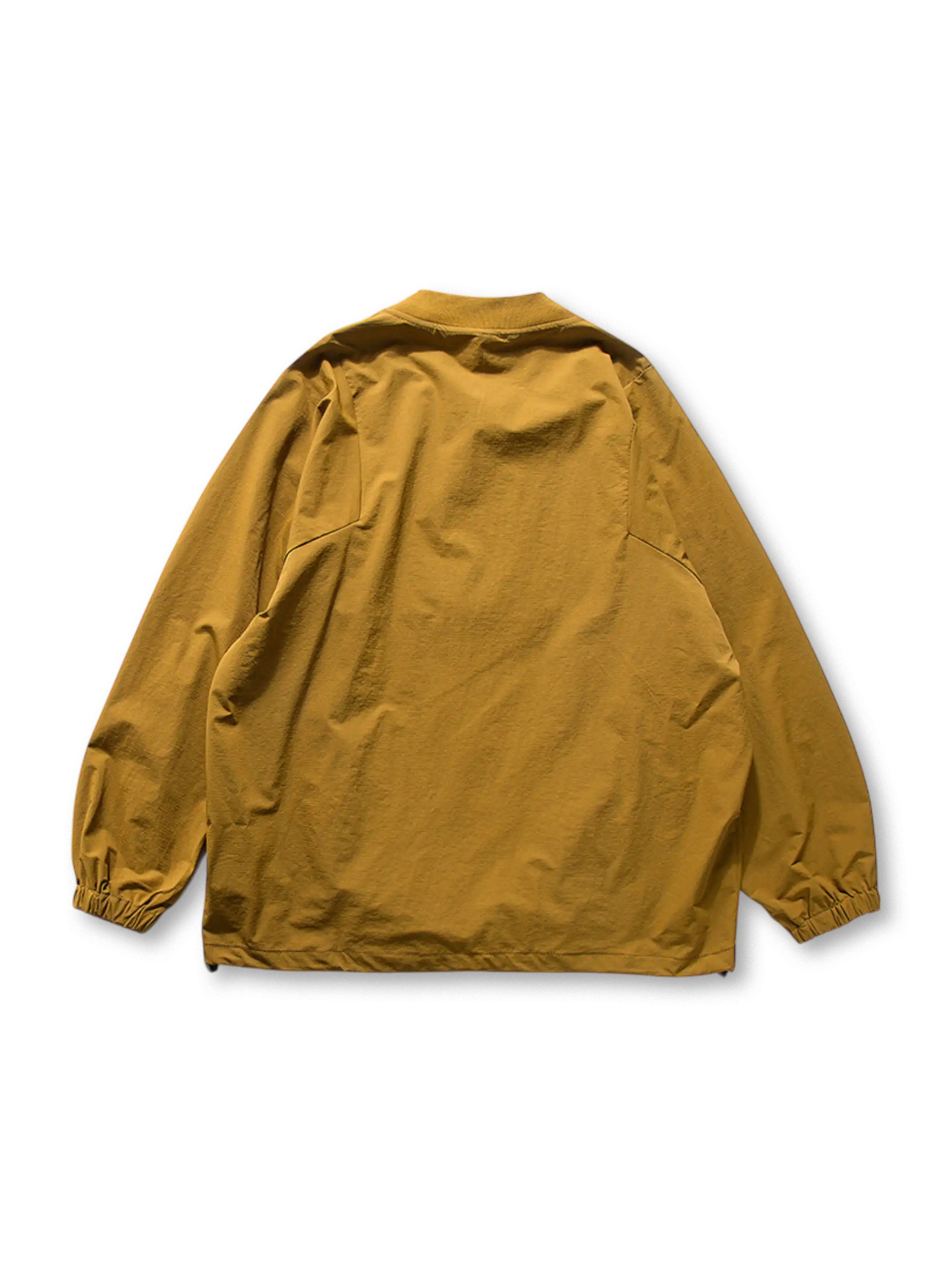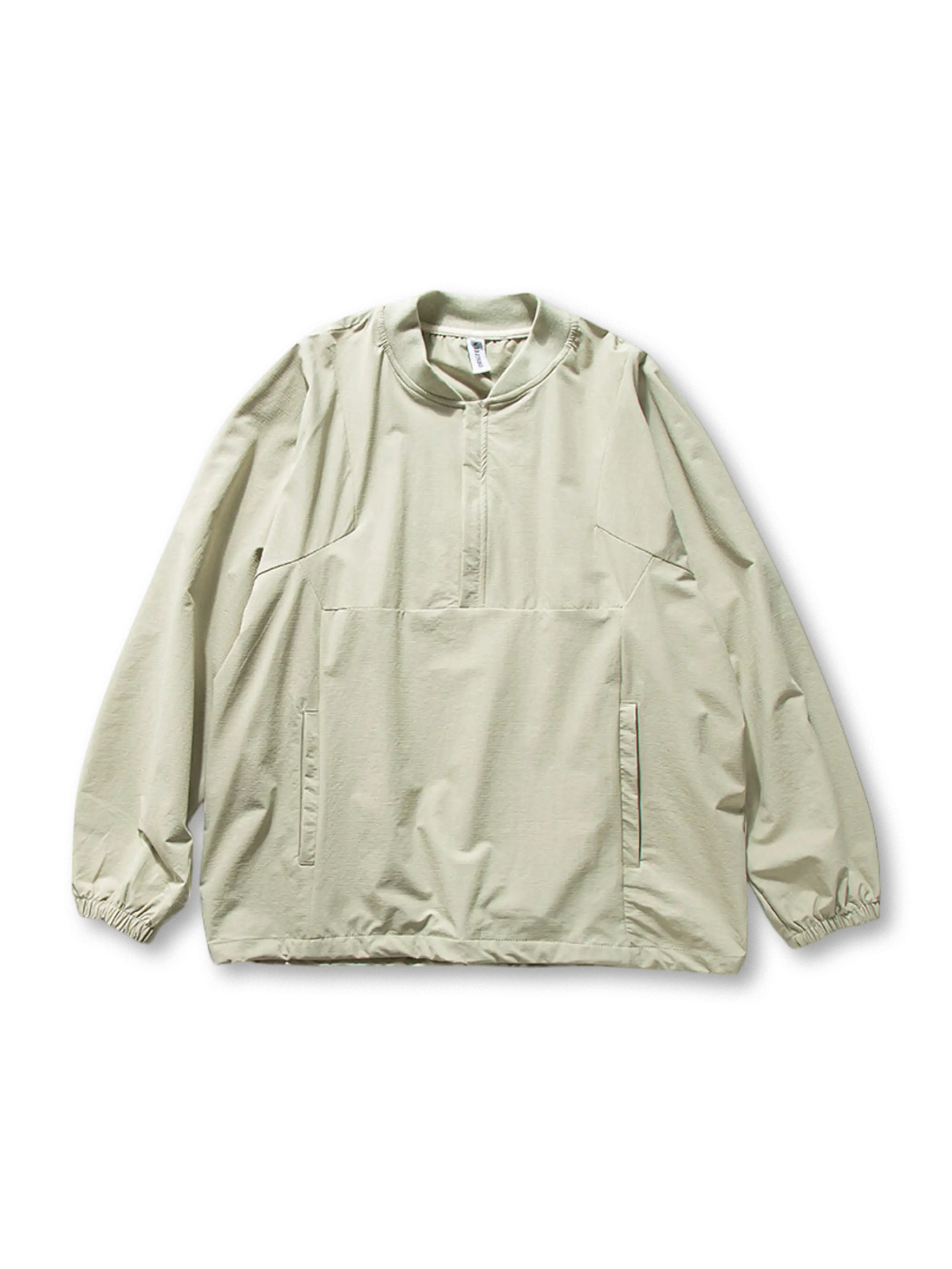 立ち襟と半開きジップが特徴の、ゆったりシルエットのプルオーバー型ライトアウター。