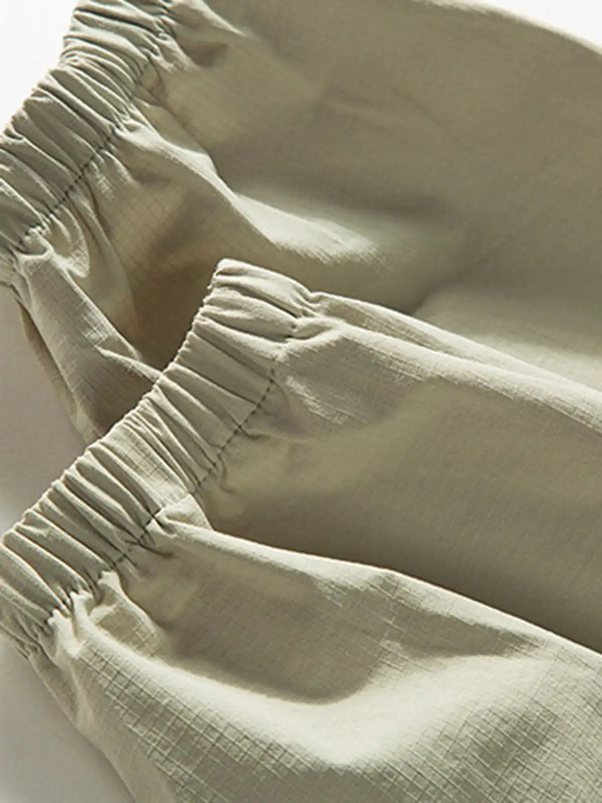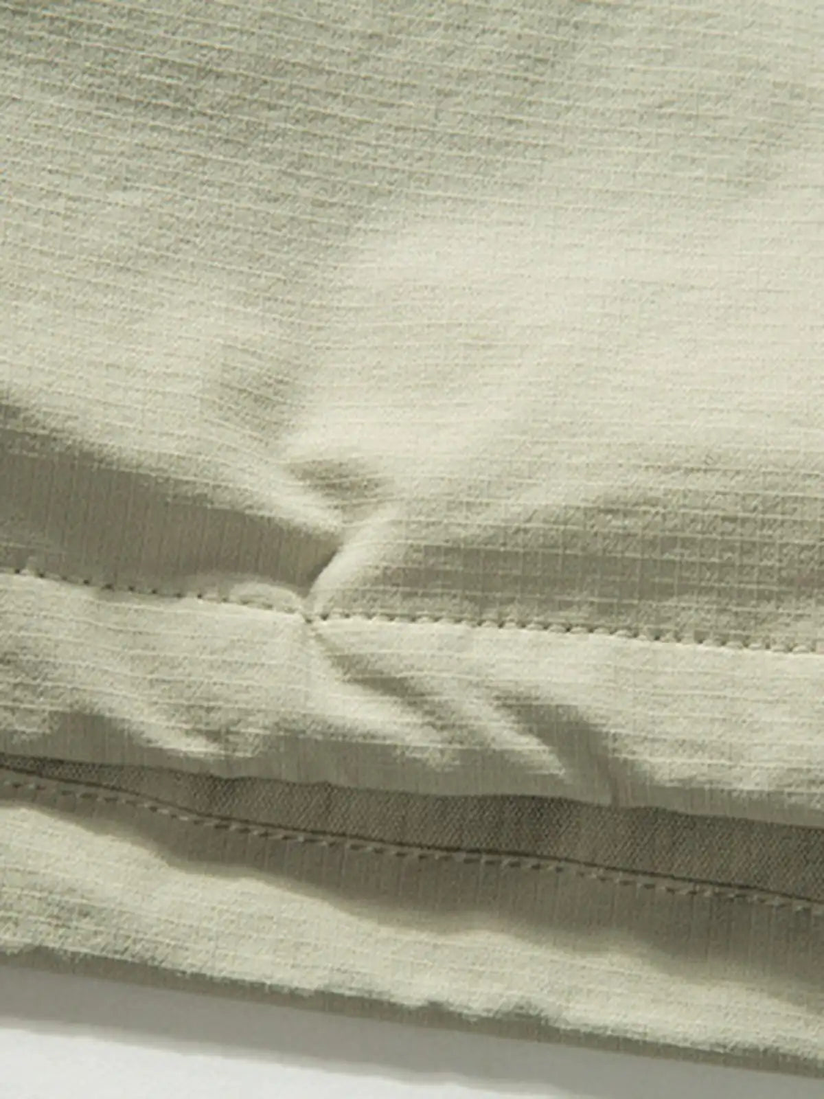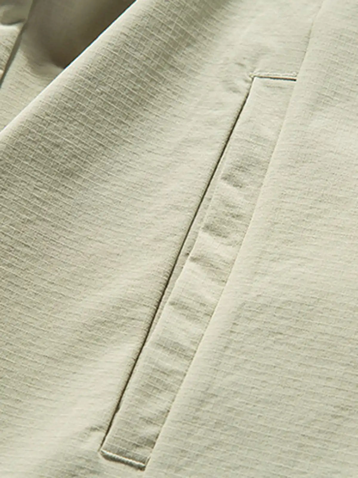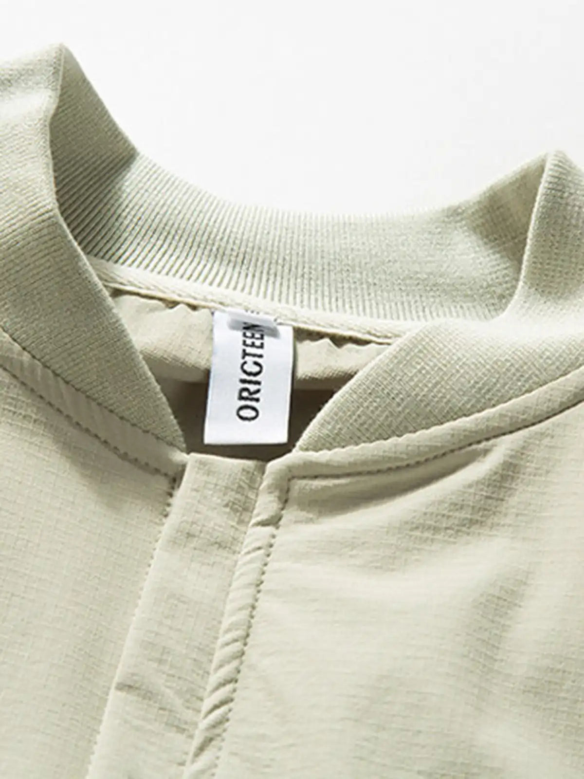 立ち襟と半開きジップが特徴の、ゆったりシルエットのプルオーバー型ライトアウター。
