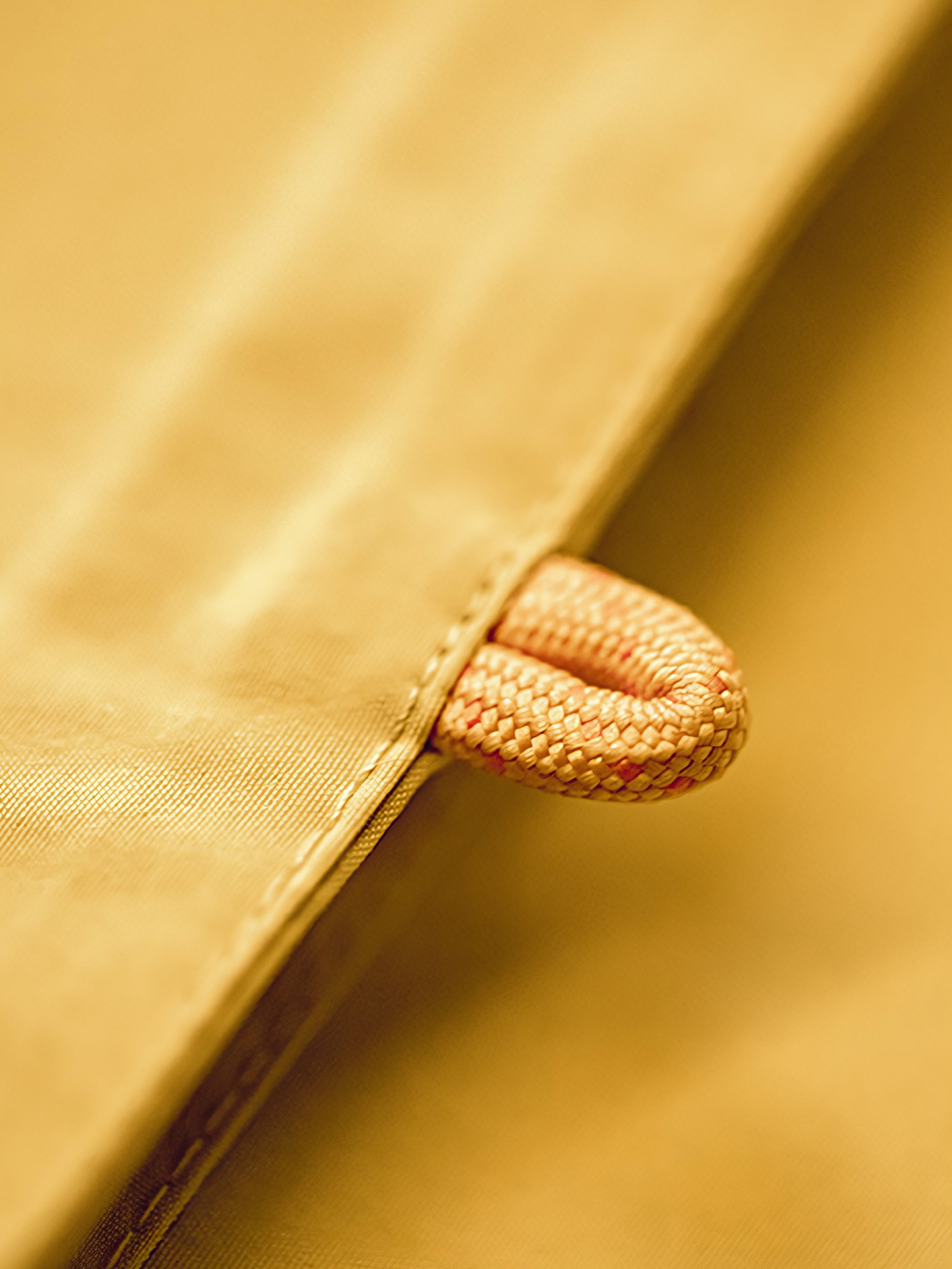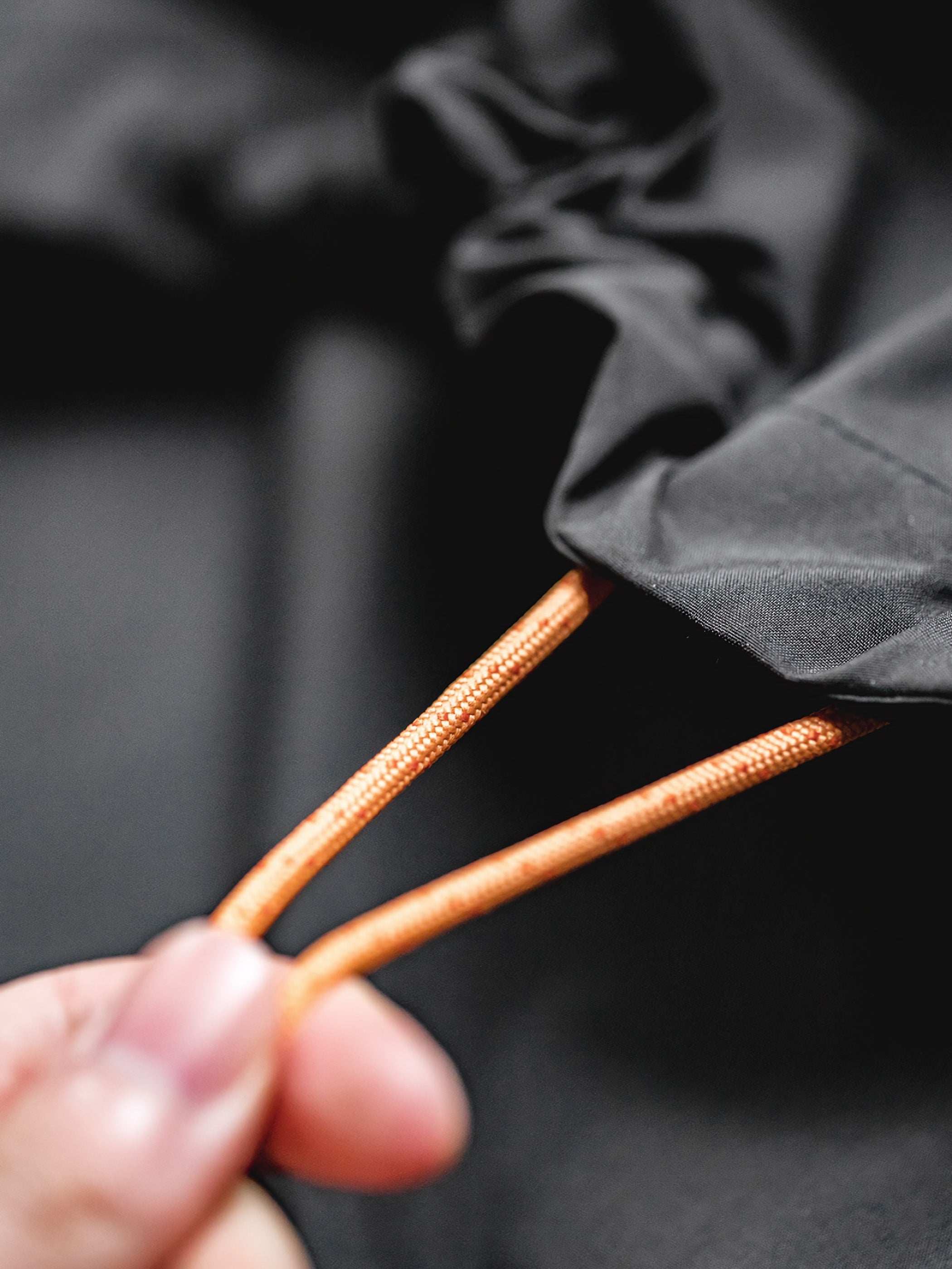 襟元が顎下まで立ち上がり、フードと一体化した特徴的なデザインと、袖口のリブ仕上げ、裾周りのドローコードなどが、防風性と機能性を提供し、冷気や風の侵入を軽減し、フィット感を調整できます。