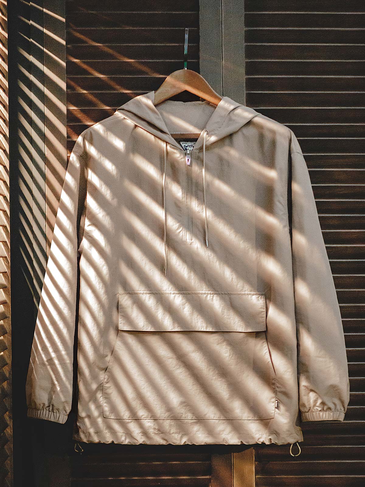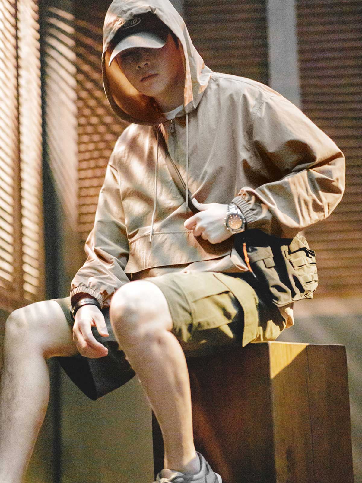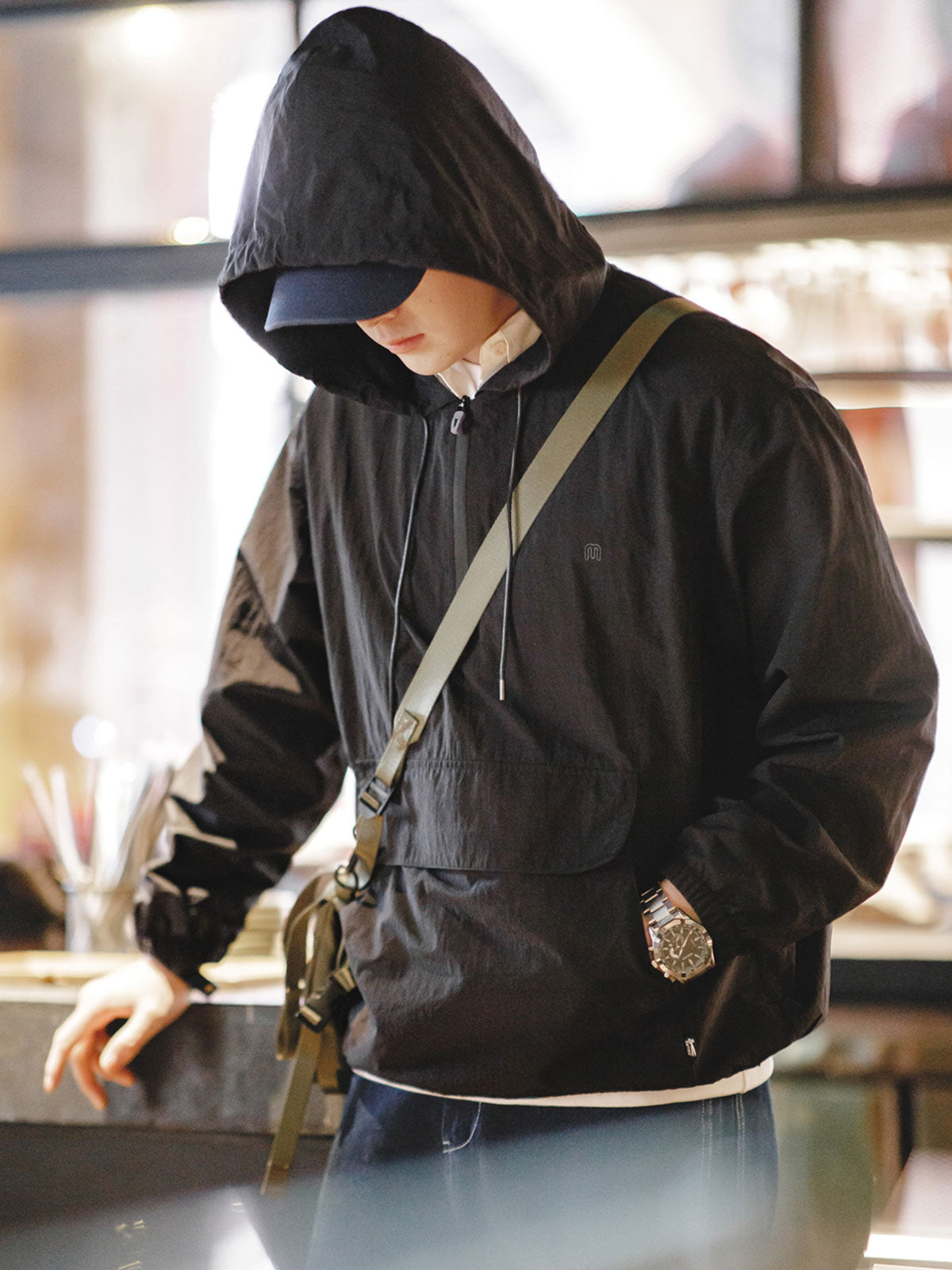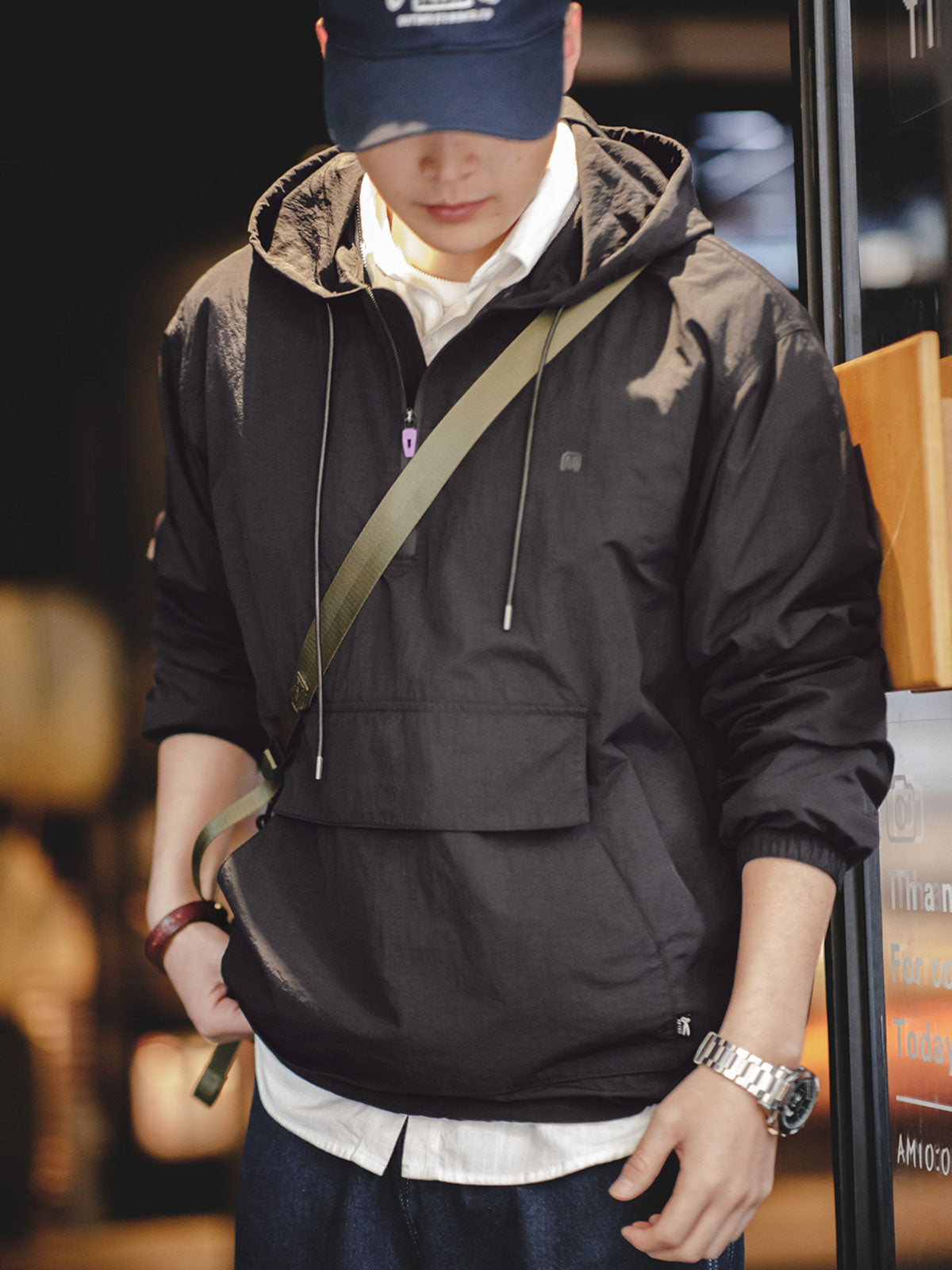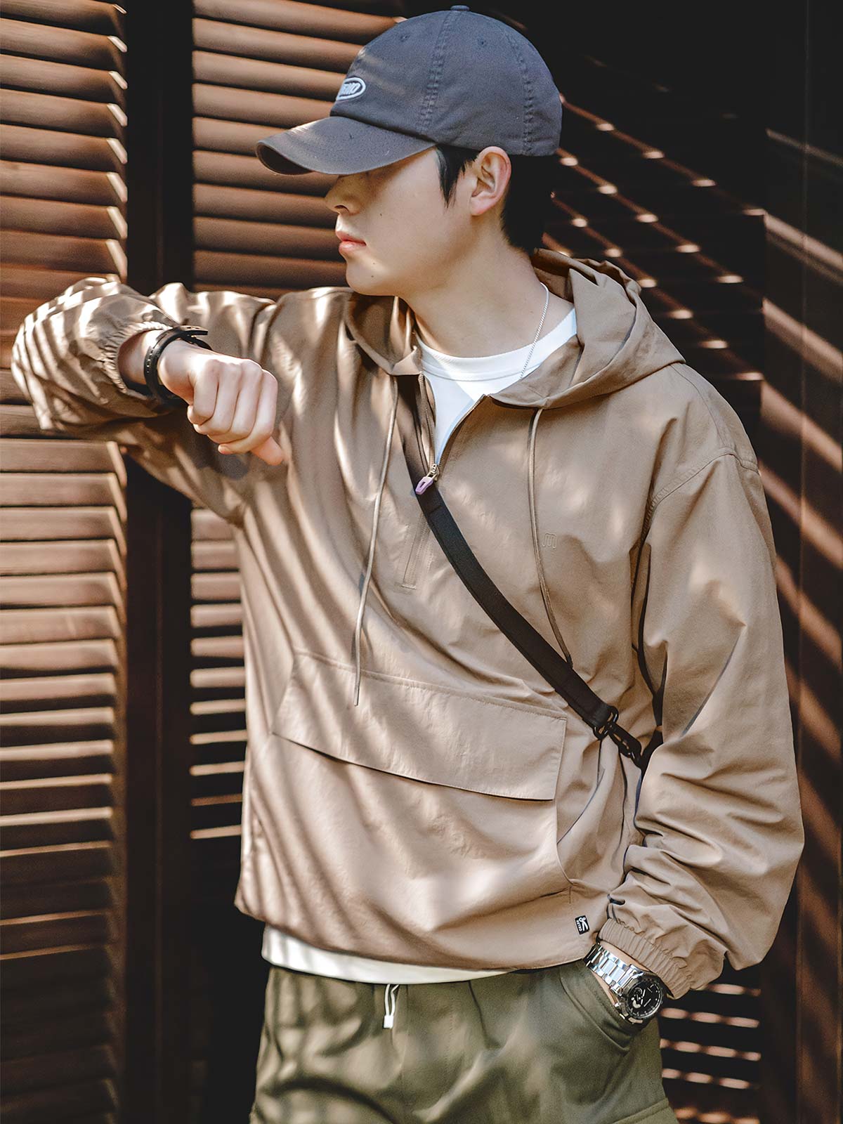 このアウトドアハーフジップフーディージャケットは、軽やかな素材を使用したクラシックなデザインです。「ハーフジップ・大きなフラップポケット・防風ドローストリング」の定番デザインに、防水ファスナーやマジックテープ、カスタム伸縮性のあるドローコードが加えられています。リラックスフィットのドロップショルダーで、着用者の動きを妨げません。