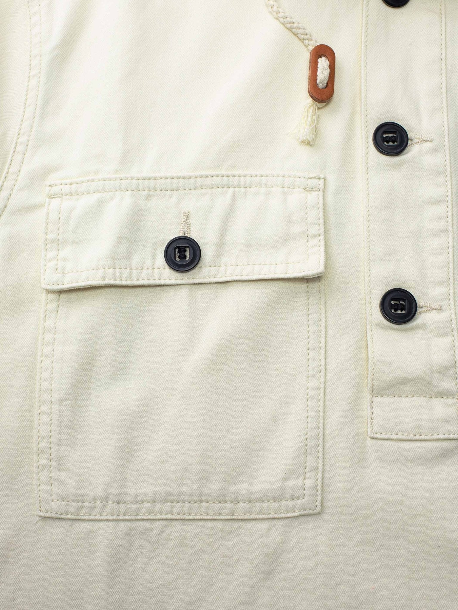 本商品の生地は、コットン95%を使用しており、着込むほどに着心地が増す一点です。通常ミリタリーで使用されている白の無地をメインに使用しており、洗練された印象を与えます。