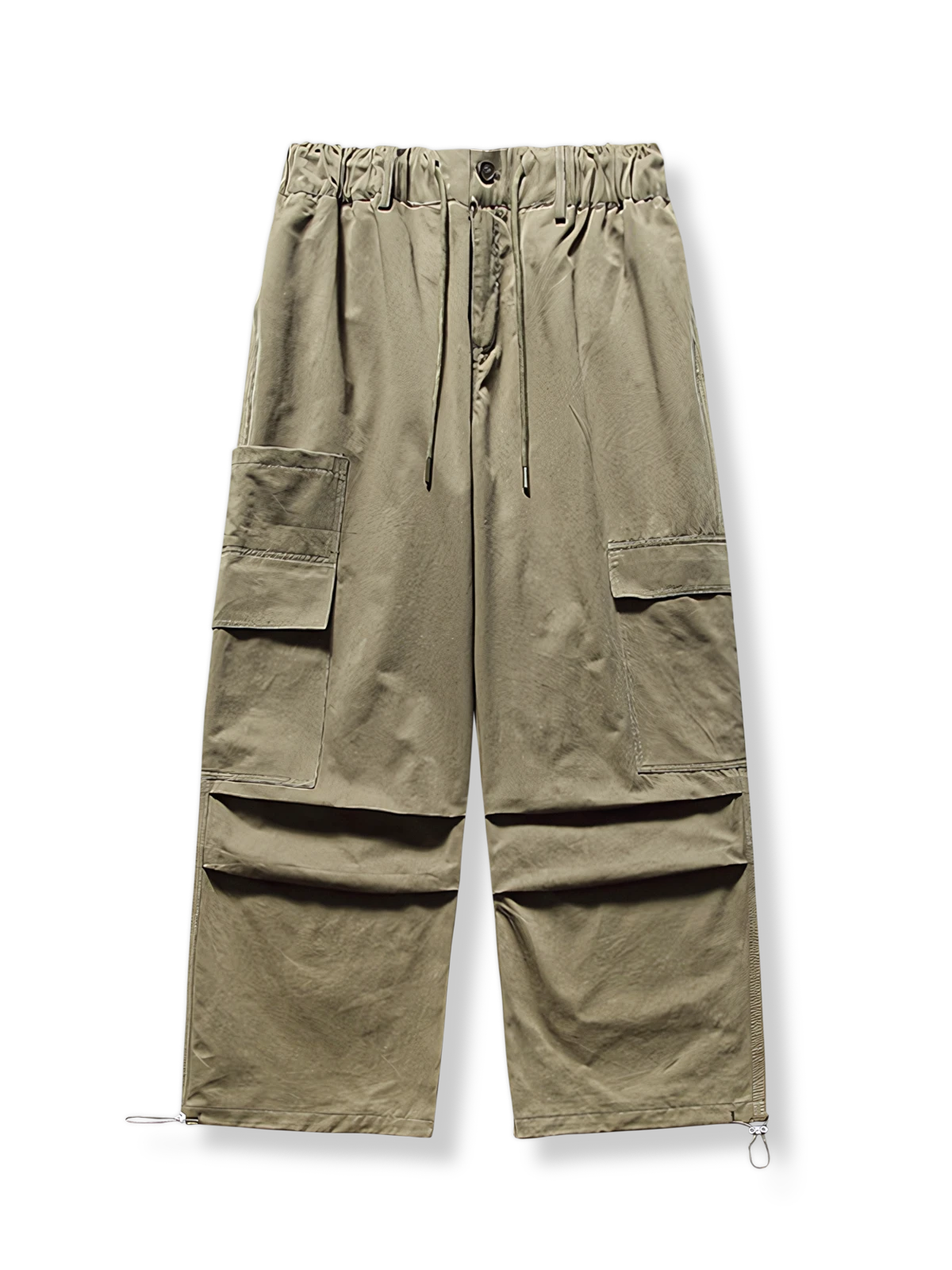 このパラシュートパンツは、シンプルなTシャツとスニーカーとの組み合わせが非常に適しており、カジュアルなアウトドアスタイルを演出します。また、堅牢なブーツとレザージャケットと組み合わせることで、レトロで個性的なスタイルを作り出すことができます。