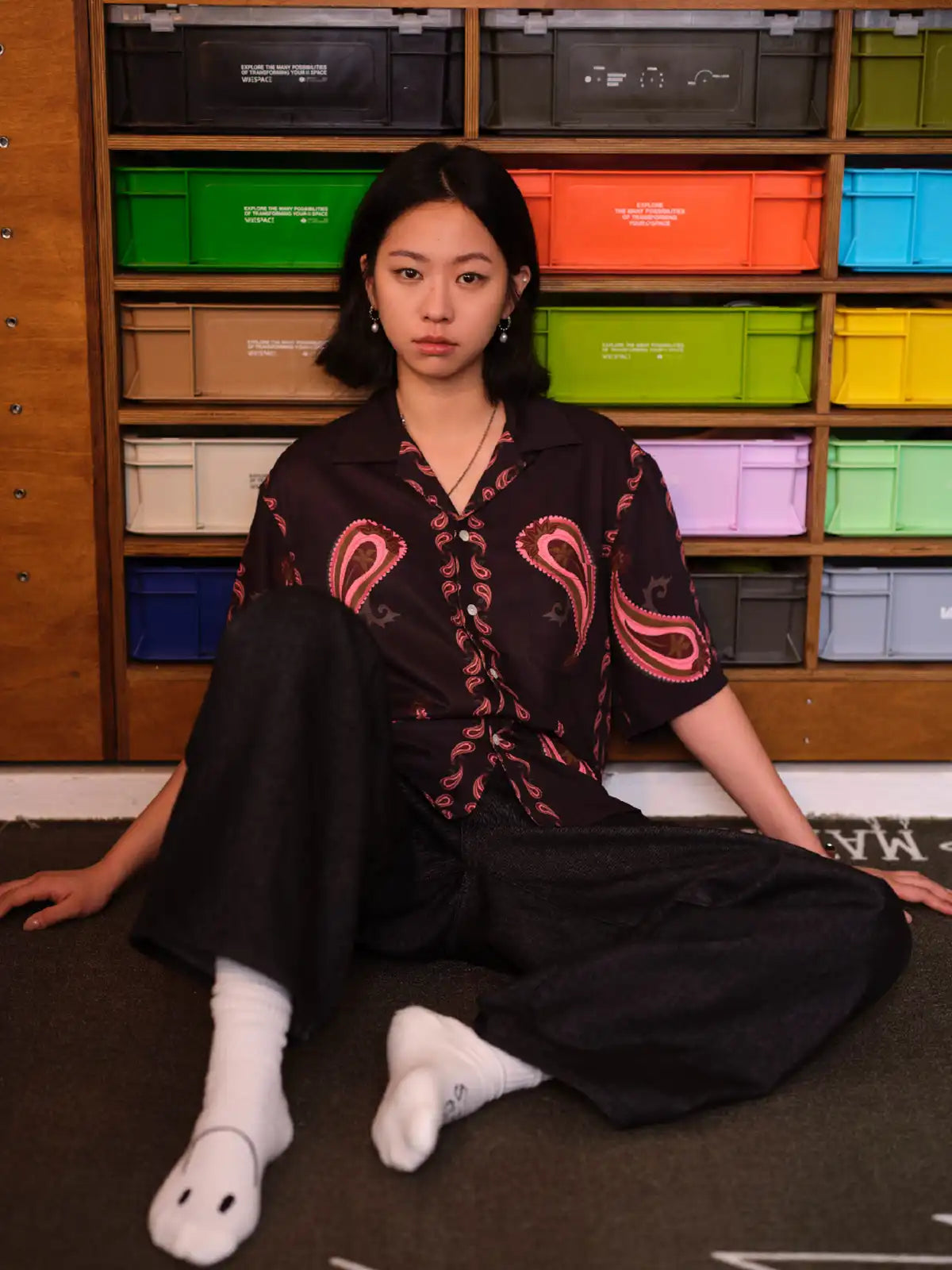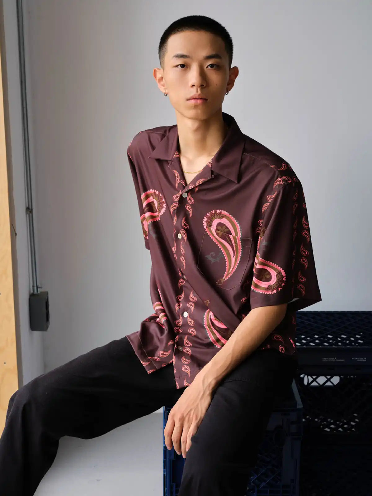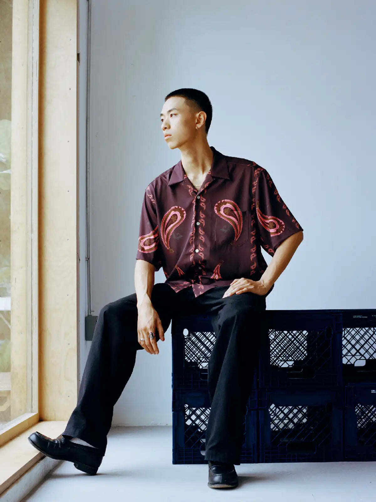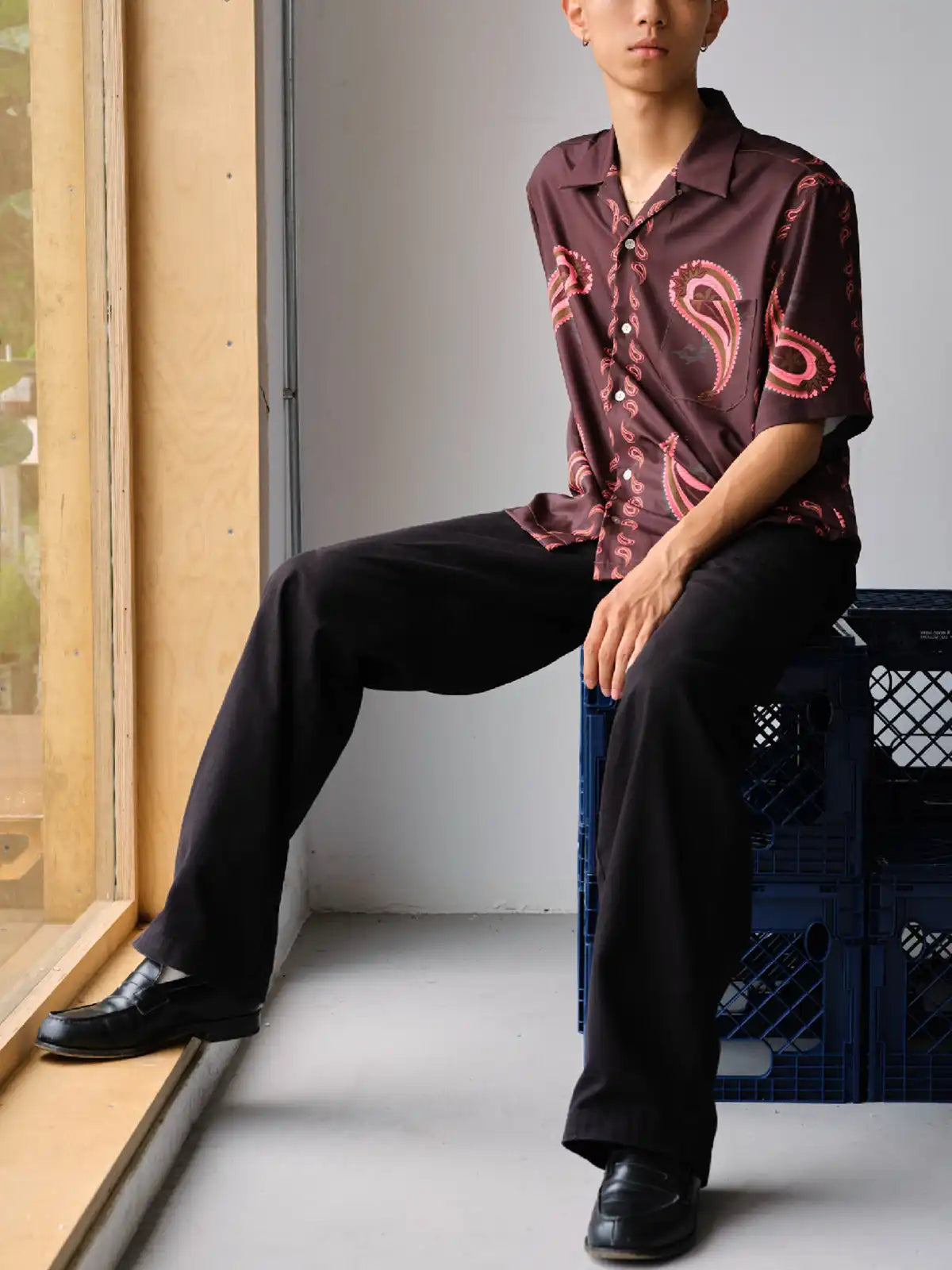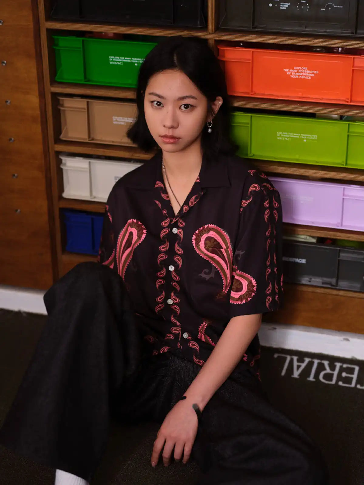 95%ポリエステル、5%スパンデックス混紡素材を使用し、さらりとした肌触りと程よい落ち感を実現。シワになりにくく、鮮やかなデジタルプリントでペイズリー柄を高精細に表現。オープンカラー仕様で夏らしいリラックス感を演出しつつ、ゆったりシルエットで涼しく快適な着心地をキープ。深色ベースの配色は、摩擦による細かな傷が目立ちやすい場合があるものの、全体的な見た目にはほとんど影響なし。