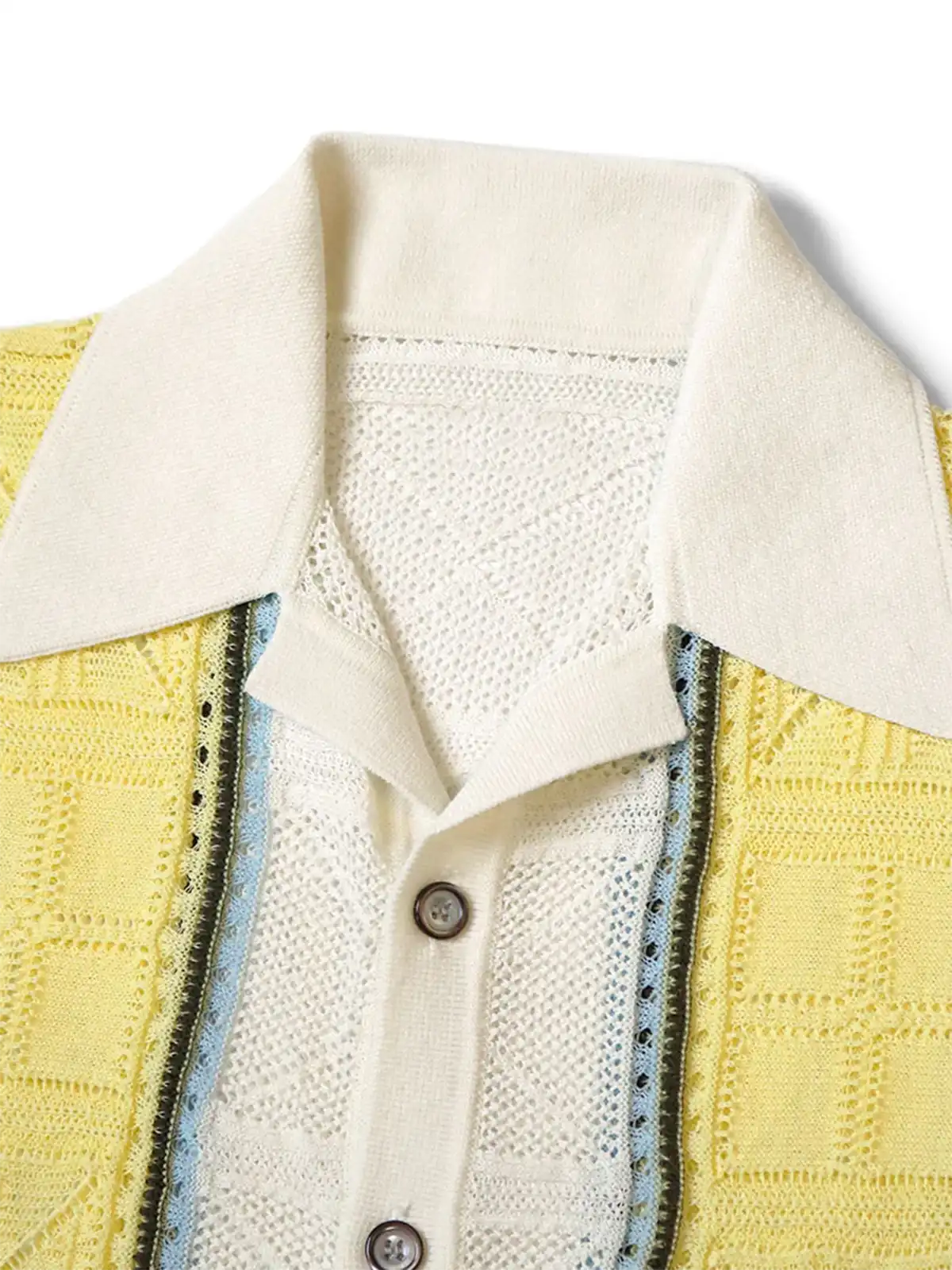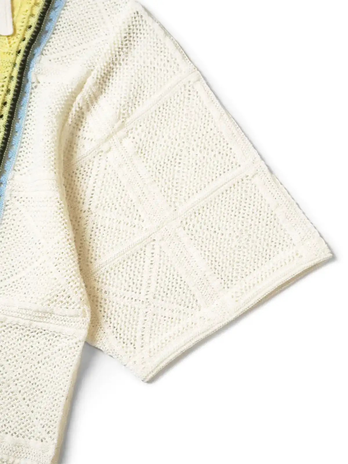 透かし編みのエスニックパネルが目を引く、涼感あふれるキューバカラーの半袖ポロシャツ。