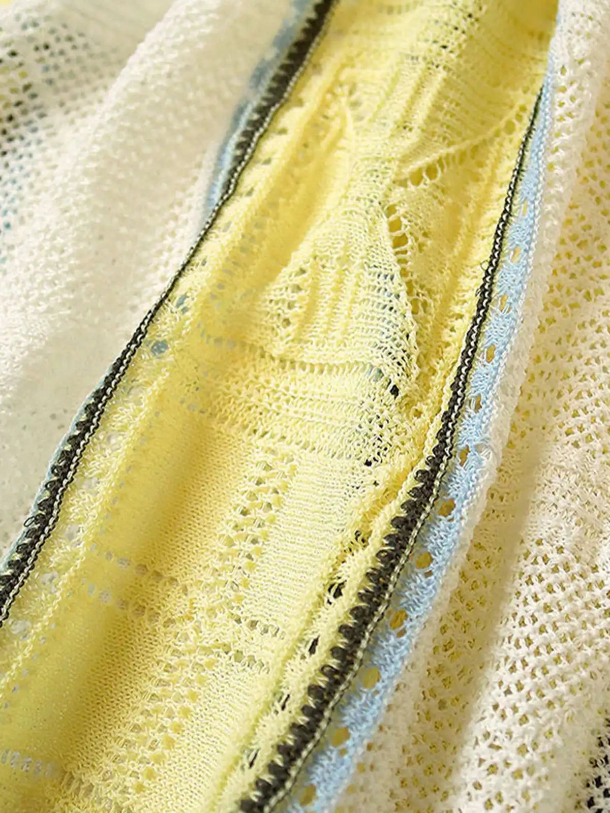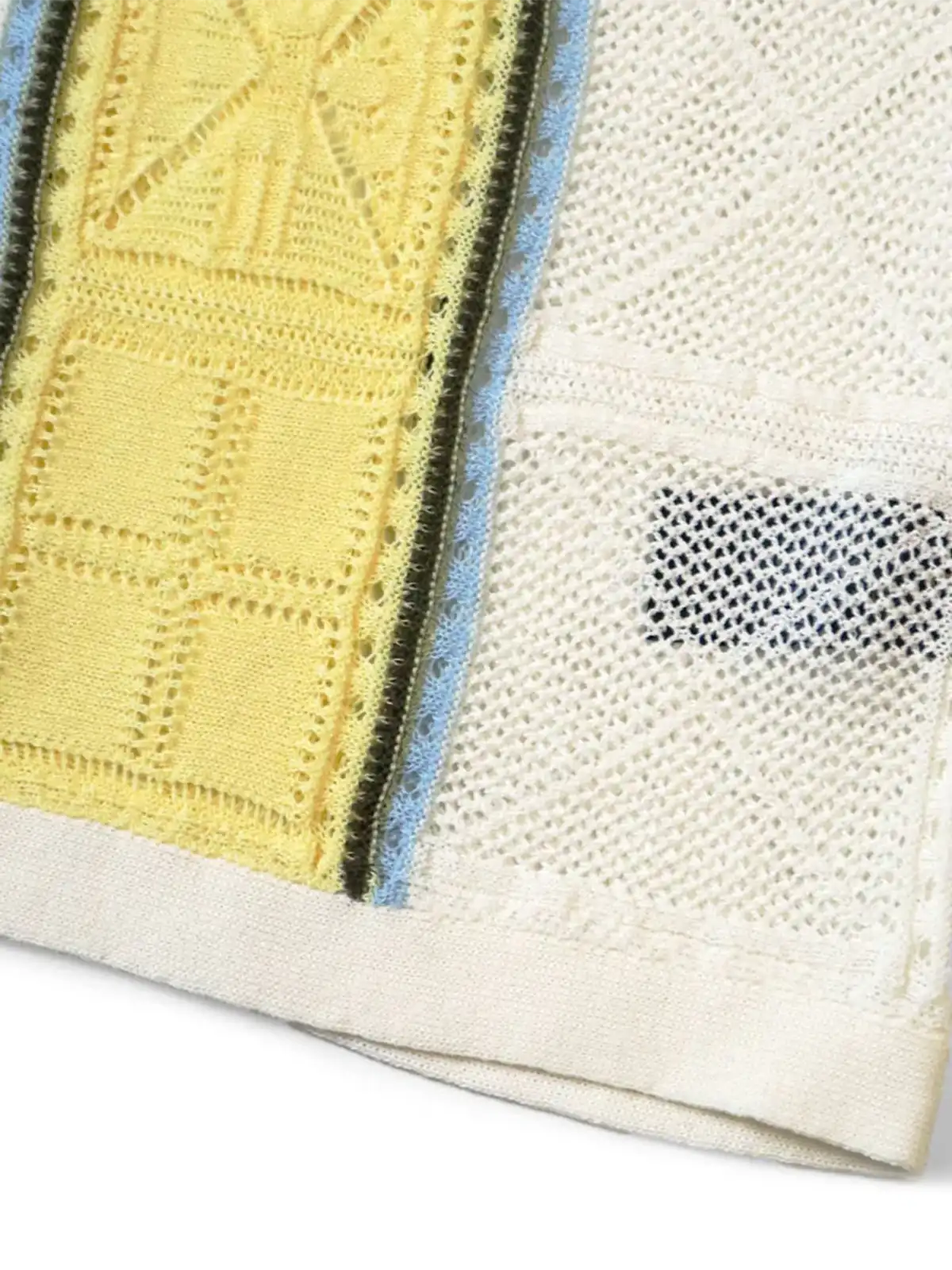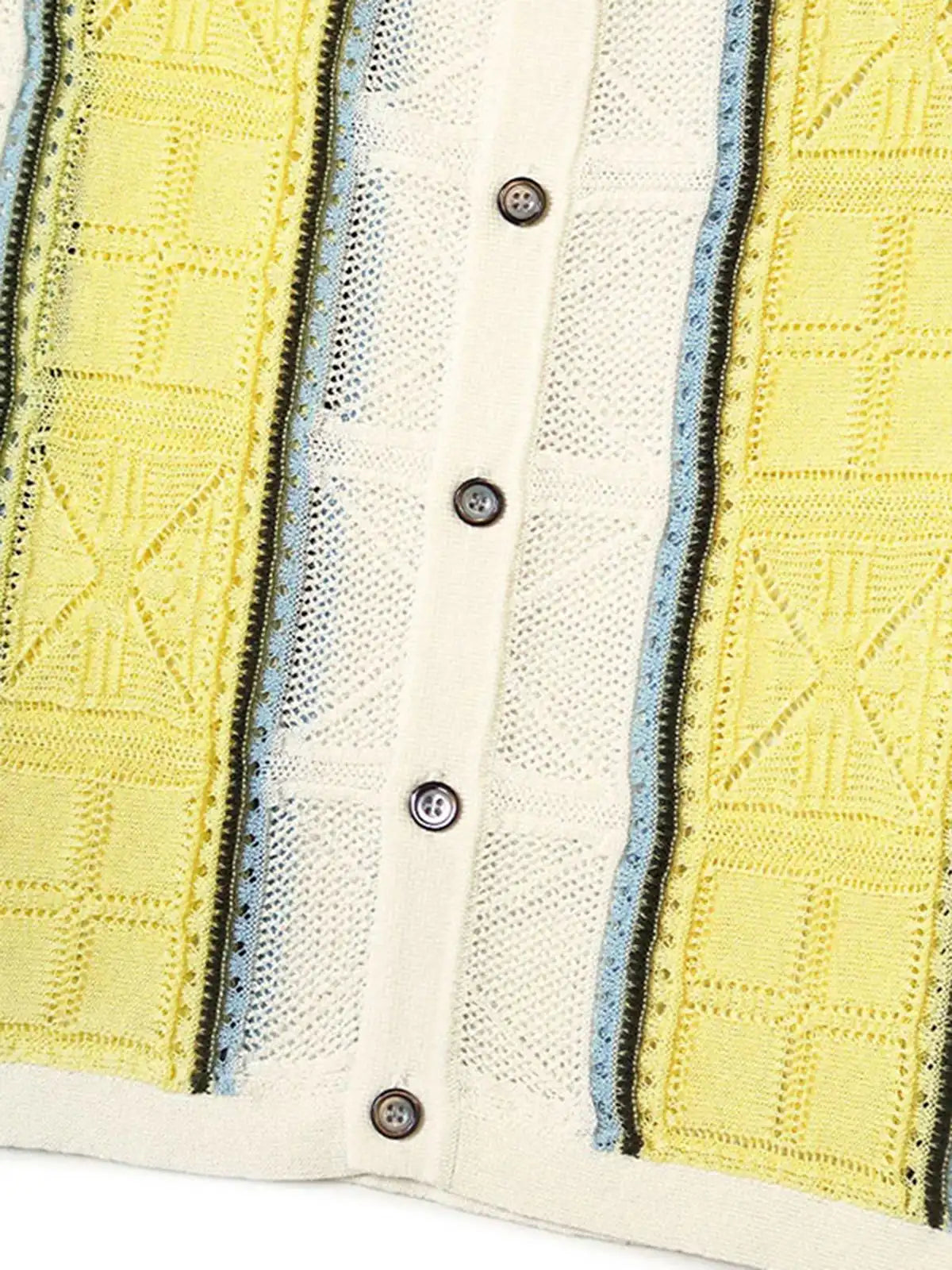 軽やかなメッシュ編みとフローラルや幾何学模様を思わせるエスニックパネル編みを前身頃に配し、程よい透け感と立体的なテクスチャーが夏の装いにリズムをもたらします。オープンキューバカラーは抜け感とリラックス感を演出し、ボタンを開けても閉じてもバランス良く着こなせるデザイン。裾にかけてわずかに広がるボックスシルエットが風通しを高め、薄手ながらしっかりとした編み地が美しいシルエットをキープします。