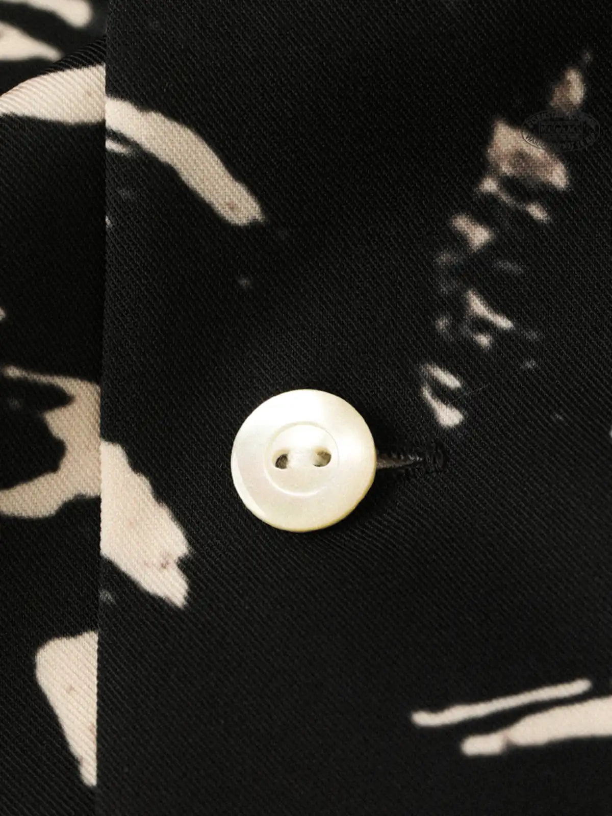 墨絵風の虎モチーフを全面に配したインパクトあるデザインで、和の精神性とハワイアンの解放感が融合。オープンカラー&ドロップショルダーのリラックスフィットは、ビーチから街中まで幅広く活躍。織ネームと貝調ボタンが上質感を添え、比翼前立てがクリーンな印象を演出。