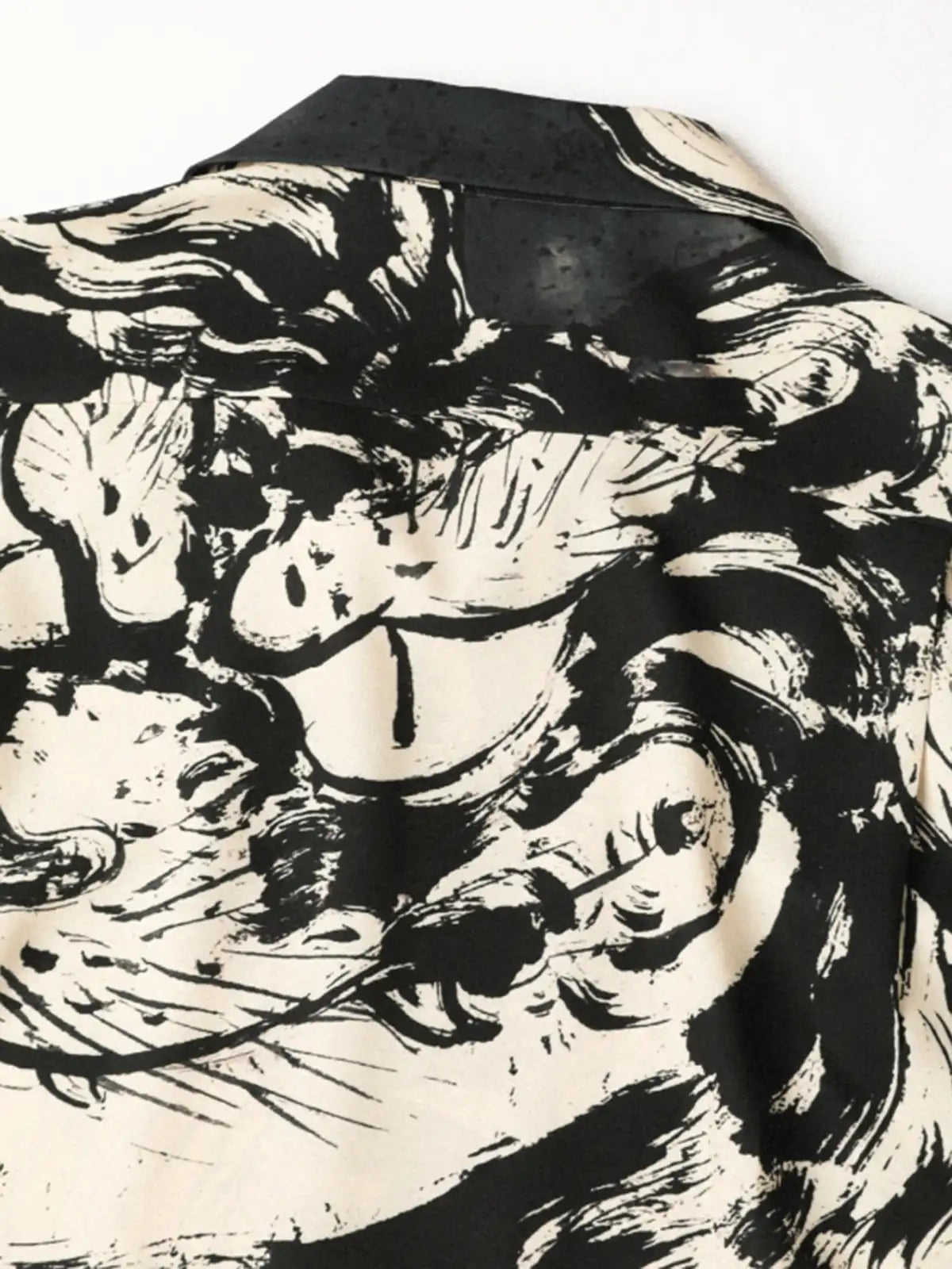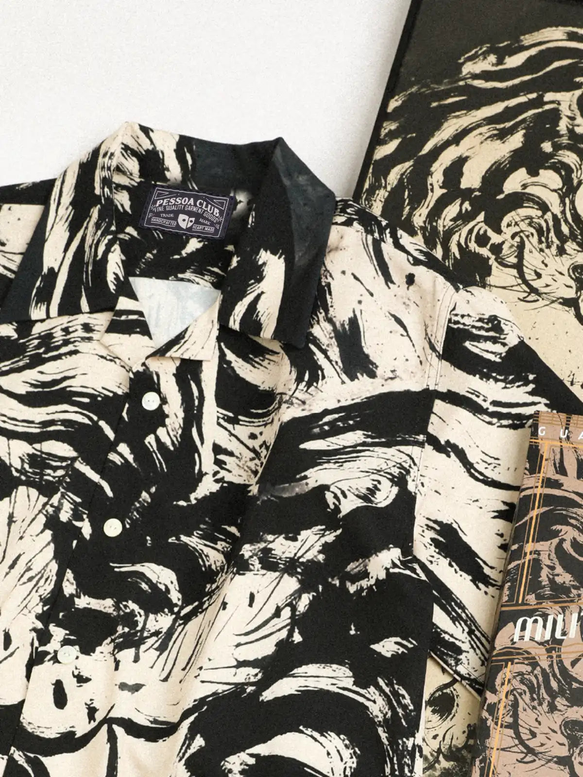 禅画タッチの虎プリントが映える、ゆったりシルエットの古巴襟半袖シャツ。