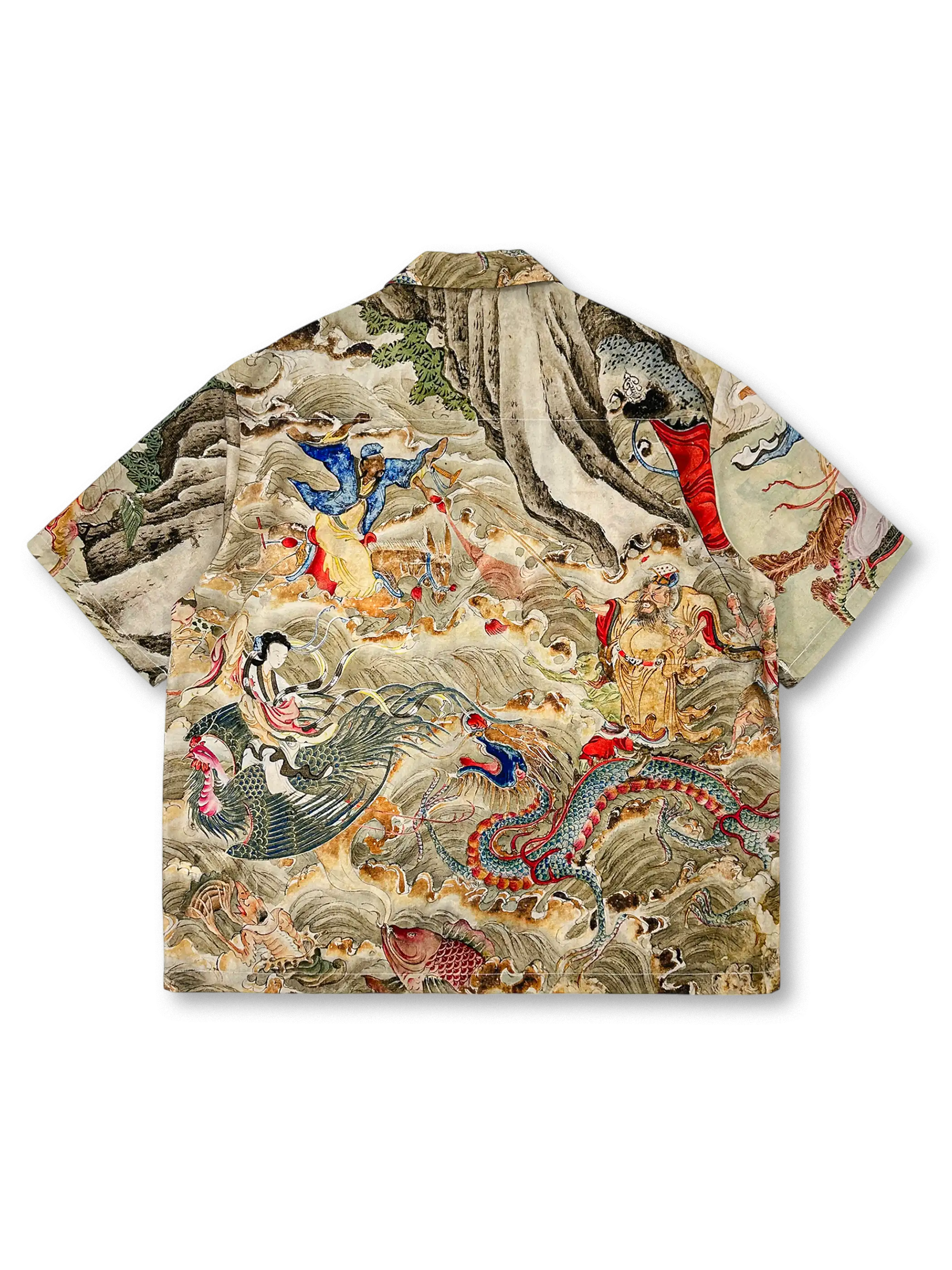 中国神話「八仙過海」の物語を彩る細密なデジタルプリントをTENCEL®生地に施し、自然な光沢と優れたドレープ性で風のような着心地を実現。古典的なキューバカラーとボックスシルエットは当時のリゾートウェアを彷彿とさせ、夏の街歩きやビーチスタイルに洗練されたムードをプラス。軽やかな着用感は真夏のレイヤードにも最適で、一枚で主役級の存在感を放つ。