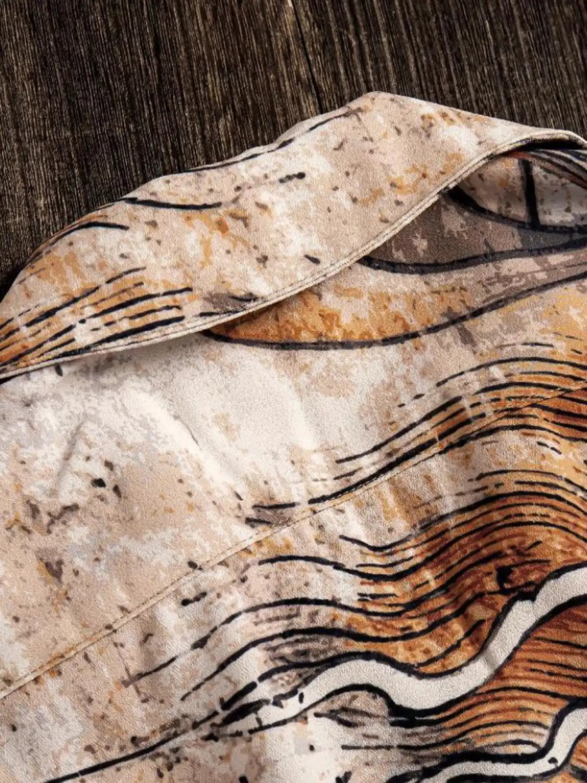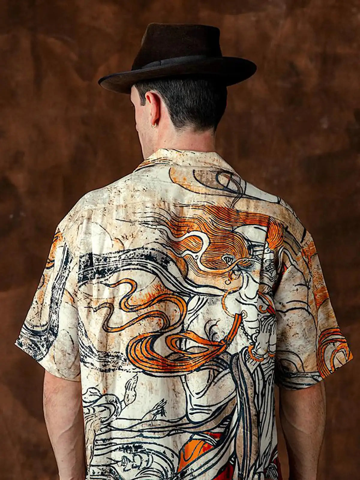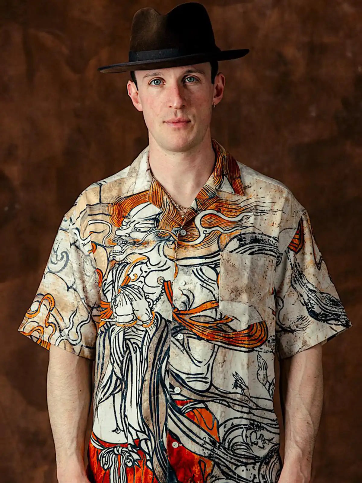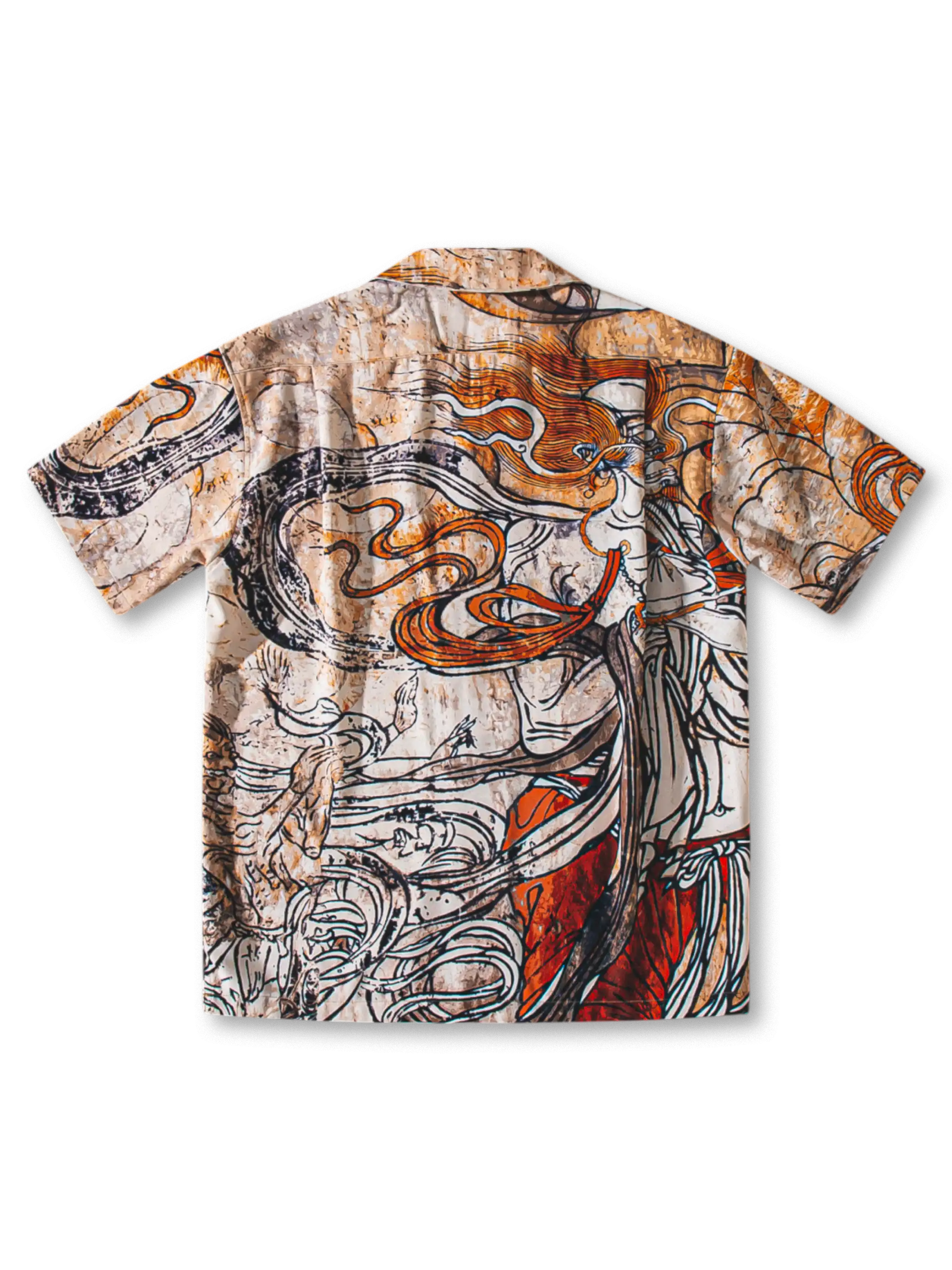古来より「仏の火炎変化」を象徴する面燃大士を全面にプリントし、天然牛角ボタンが立体感を演出。16世紀の南洋航海士が好んだアロハシャツを原型に、手描きタッチの炎紋様をテンセル混紡の滑らかな生地に精緻に再現。軽やかな着心地と存在感あるデザインが、リゾートからストリートまで大人の夏スタイルを格上げします。