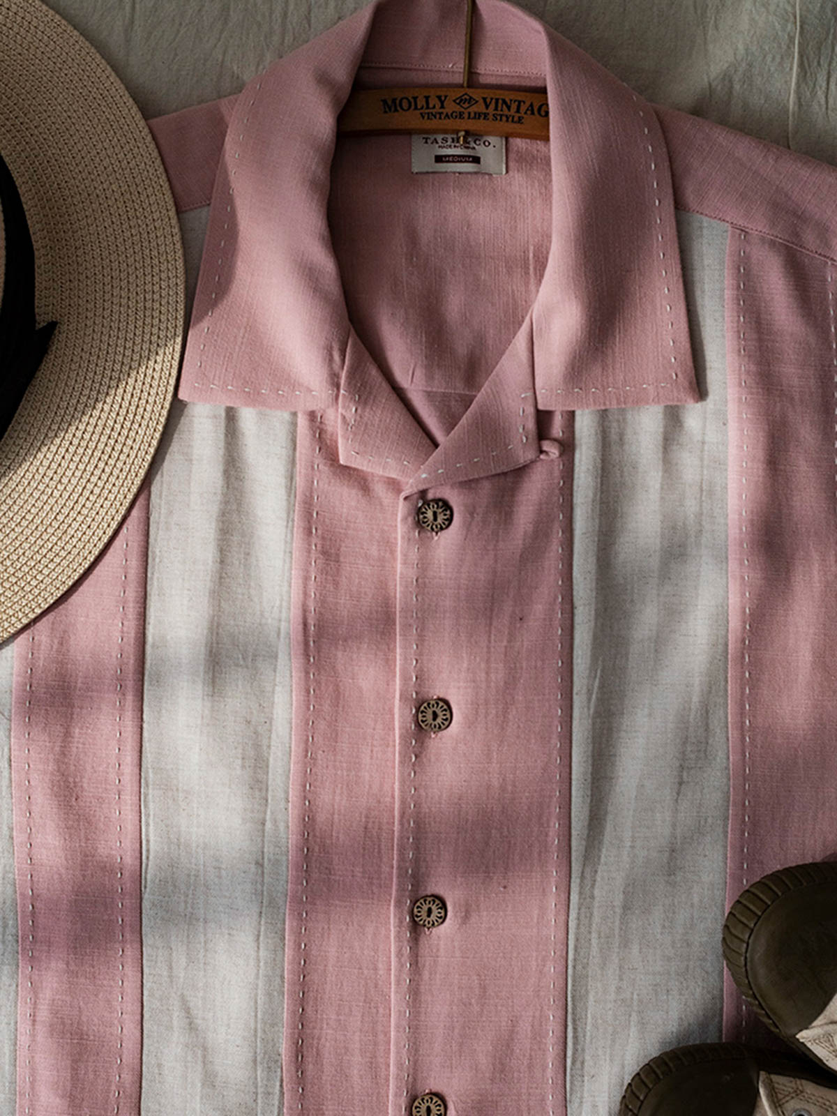 このボウリングシャツは、50%テンセルと50%リネンの混紡素材を使用し、洗濯後も美しい形状を保ちます。縫い目は手作業で包み込まれ、肌触りがよく、ストレスを感じません。また、多彩な色の縫い目を施し、シャツ全体に一体感を与えています。スーツの貢針技術を取り入れたシンプルな縫い目が、動きのあるスタイルを実現。ピンクのストライプデザインは独自のファッション要素を加え、薄色のパンツやカジュアルなショートパンツと組み合わせて、爽やかで自然な夏の装いを演出します。
