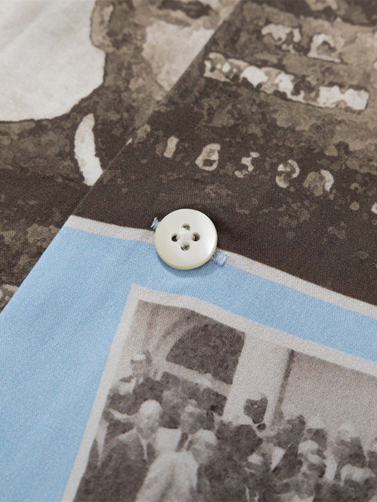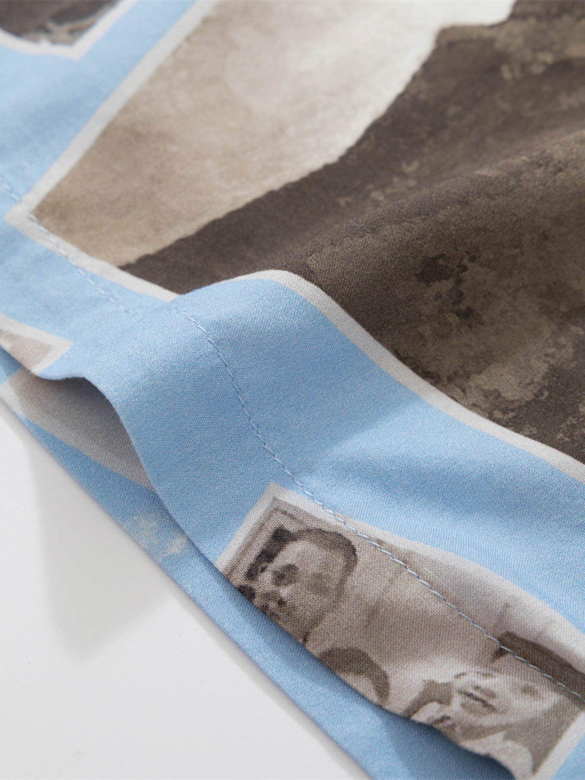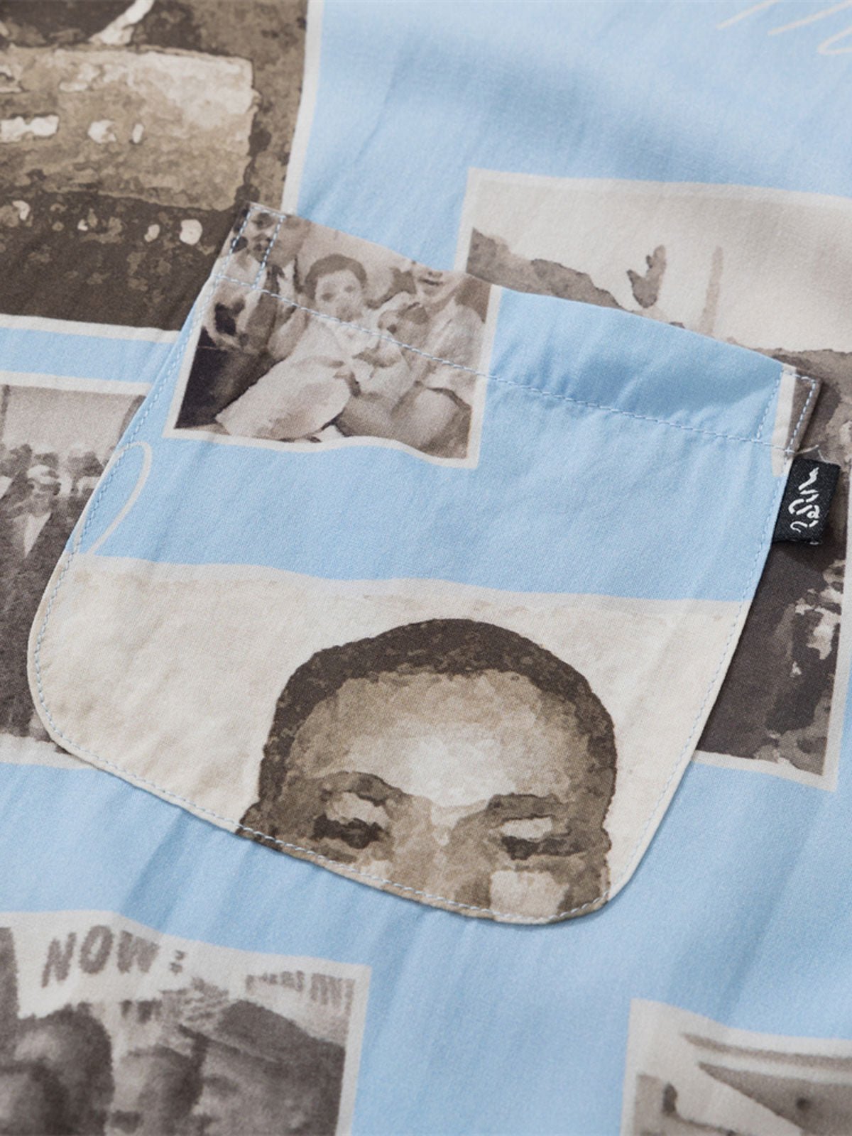 このシャツのデザインは、影響力のある公民権運動のリーダー、キング牧師からインスパイアされています。彼の歴史的な瞬間を描いた水彩画調のパターンと、彼の署名「Martin Luther King, Jr」を巧みにデザインに取り入れています。100%ビスコース生地を使用しており、優れた通気性と涼感があり、暑い夏でも快適に過ごせます。左胸にはポケットがあり、フラッグロゴのディテールが実用性とデザイン性を高めています。天然のシェルボタンは一つ一つが精巧に作られており、1930年代のヴィンテージ感を演出しています。リラックスフィットのデザインで、単独でもレイヤードでもスタイリッシュに着こなせます。このシャツのデザインは著作権で保護されており、独自性とオリジナリティが保証されています。