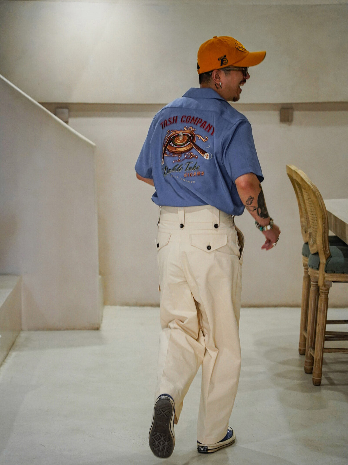 このボウリングシャツは、クラシックなルーレット盤とシガーカルチャーの刺繍を融合し、ヴィンテージの魅力と現代の快適さを兼ね備えている。