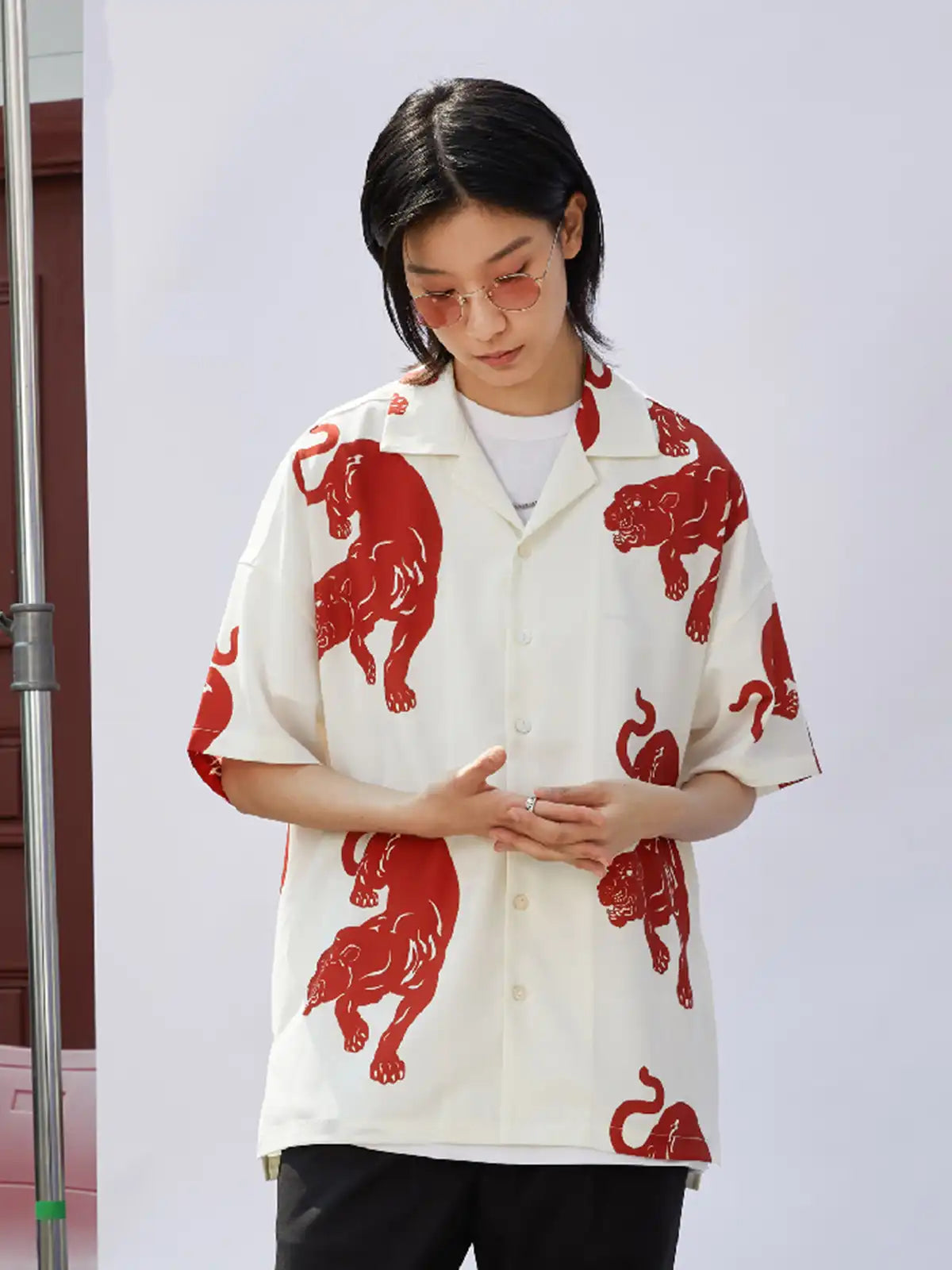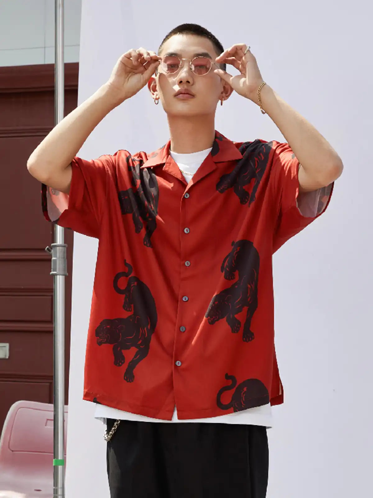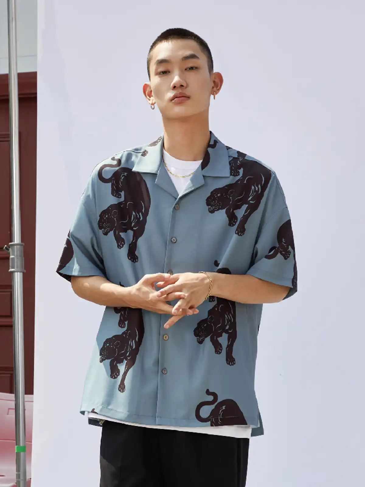 大胆なパンサー柄が目を引く、軽やかなポリエステル素材を使用した半袖アロハシャツ。