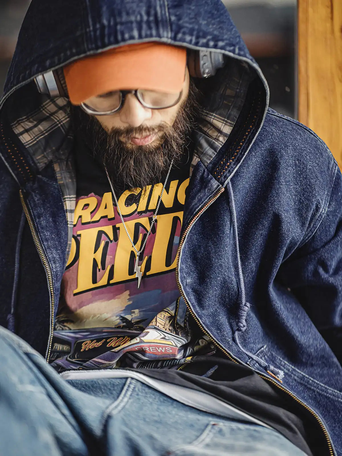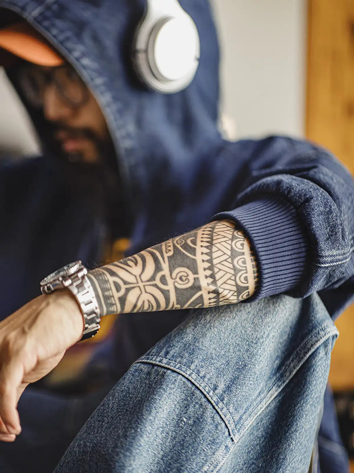 “硬派ワーク”の記号として語られやすいJ130のアクティブジャケットを、素材の選択で日常寄りに再構成したモデルです。短め丈×広い肩まわりのラフなボックスシルエット、フード付き、裾と袖口のリブで風を受けにくい基本設計は踏襲しつつ、従来の帆布ではなく10.5oz相当のウォッシュドデニムを採用。粒感のある表面と磨白のフェードが最初から“育った見え方”を作り、いかにもな新品感を抑えます。フロントは定番の大型カンガルーポケット(手入れ&収納の両立)を核に、ステッチの輪郭が構造を強調。さらに内側はチェック柄ライニングに切り替え、前を開けたときのレイヤードで古着文脈が立つ仕掛けです。チノやスウェットパンツでワークに寄せても、スラックスや黒デニムで引き締めても成立し、主役にも羽織りにも回せます。